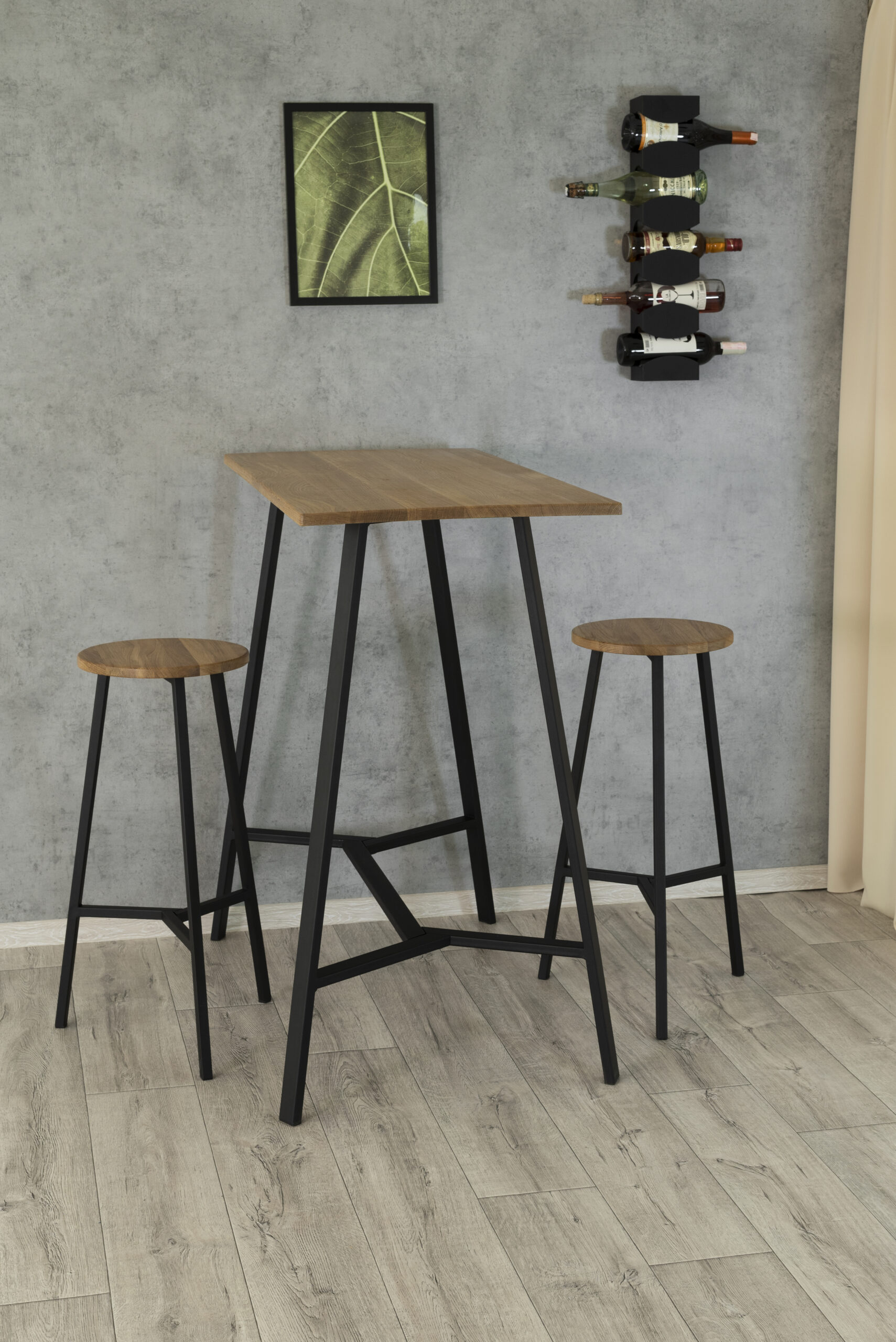 Полубарный табурет, высота 65 см. Материал: цельноламельный массив дуба, металл.