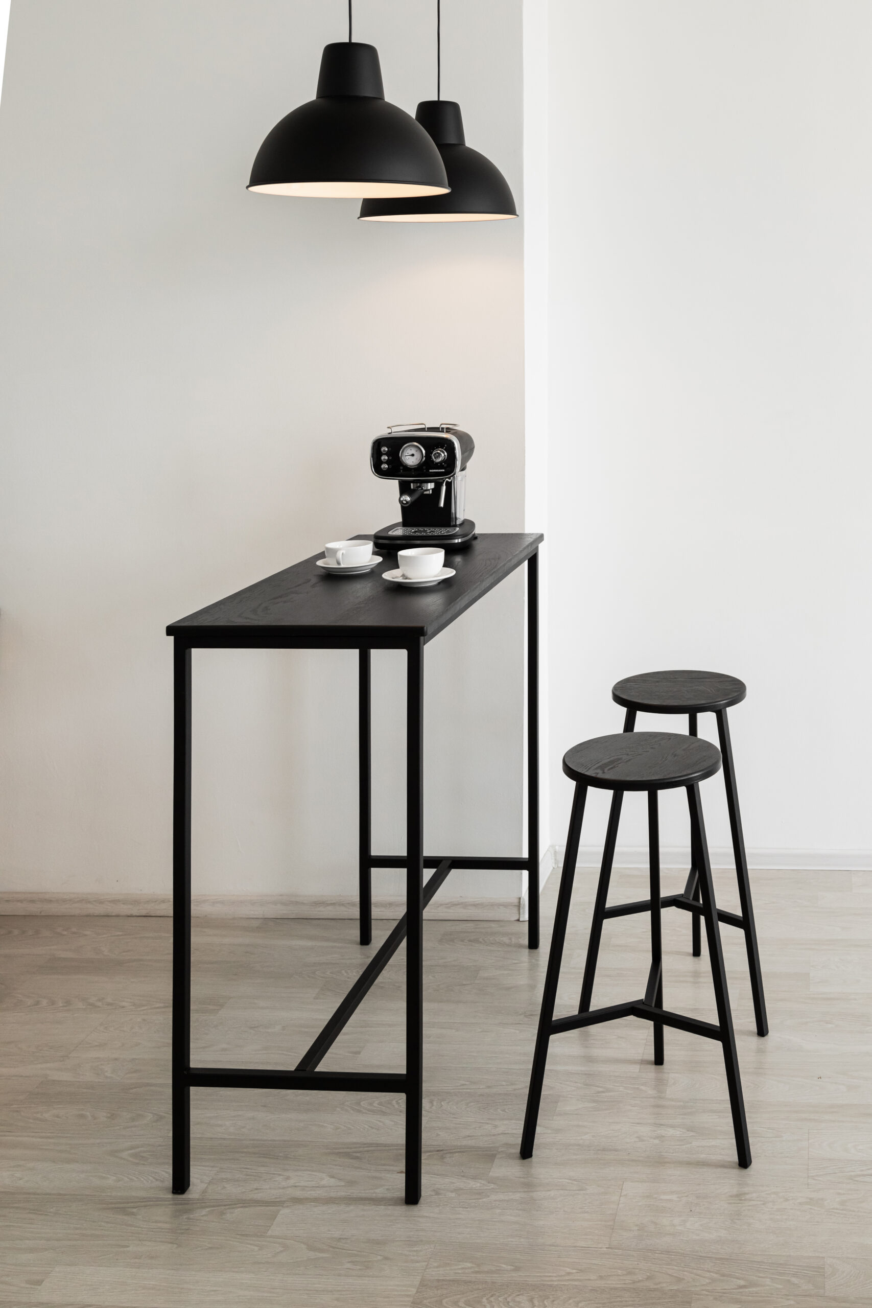 Полубарный табурет, высота 63 см. Материал: цельноламельный массив дуба, металл.