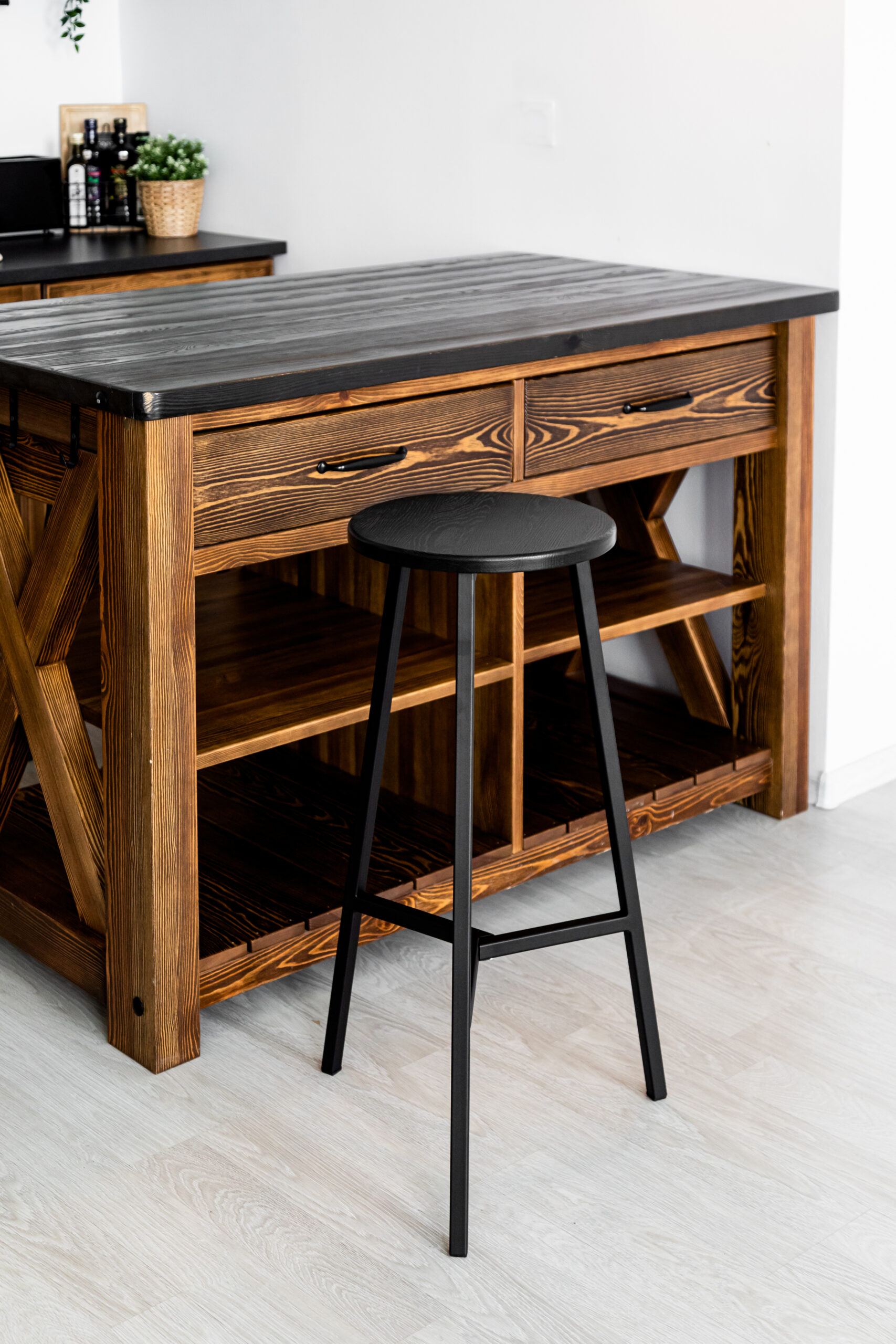 Высокий барный табурет. Форма сиденья: пивная крышка. Материал: цельноламельный массив дуба, металл.