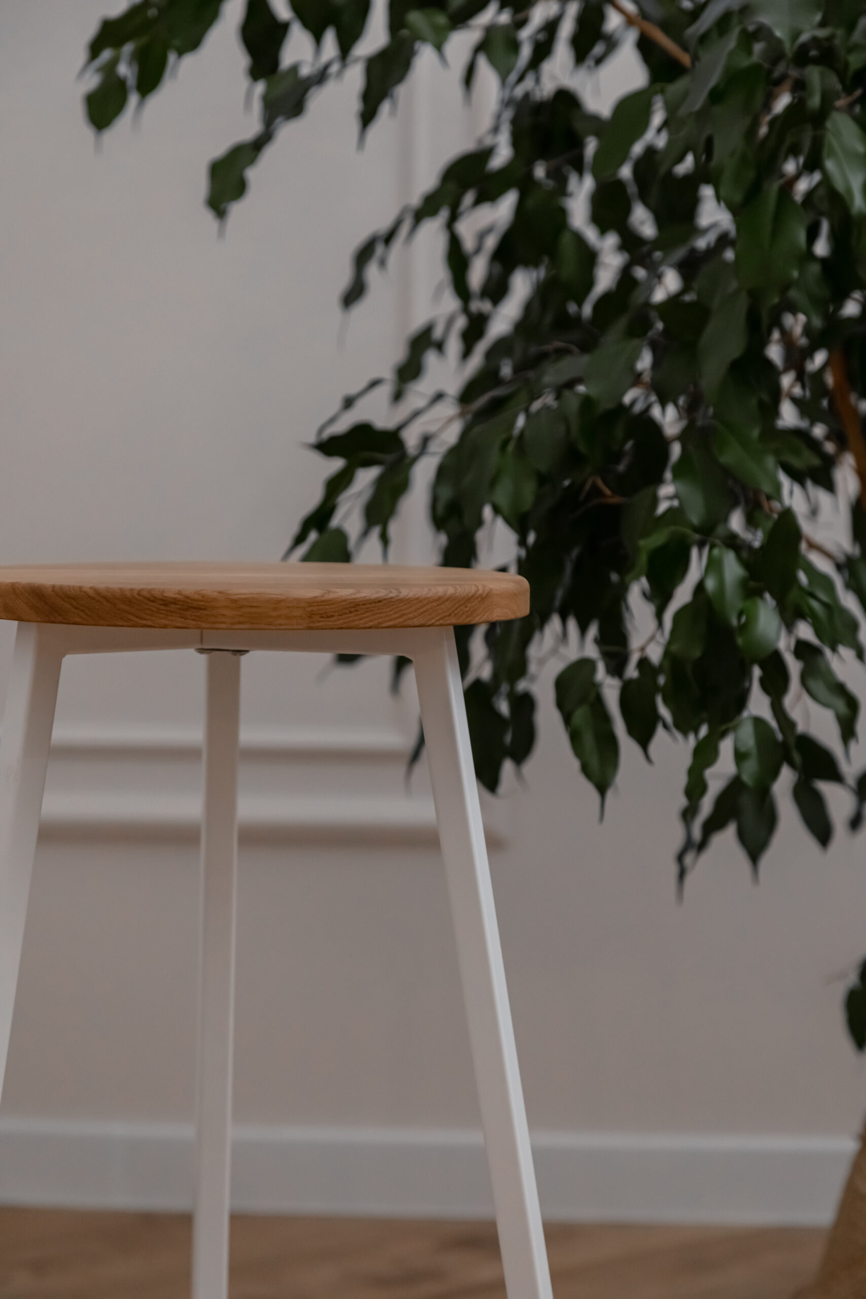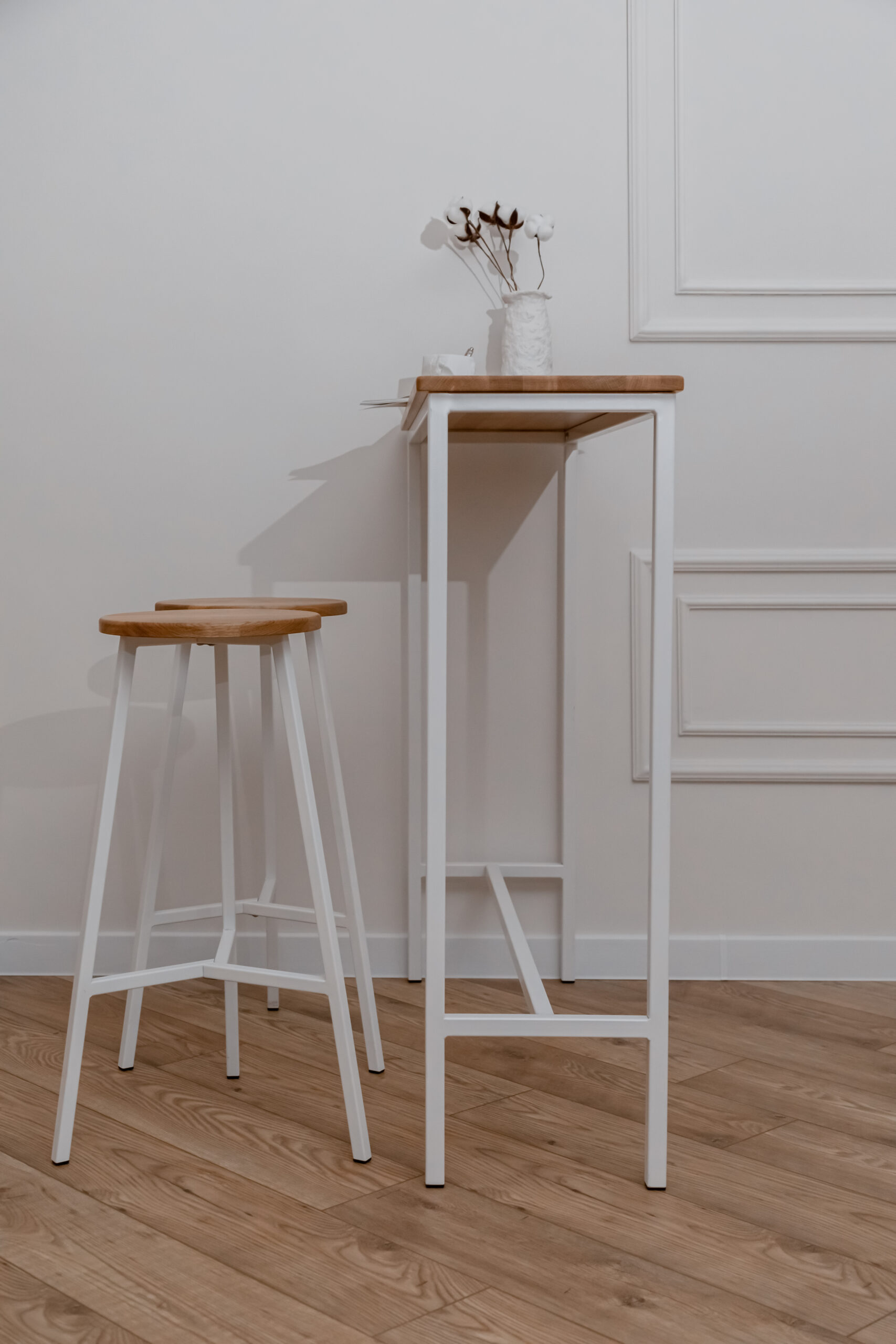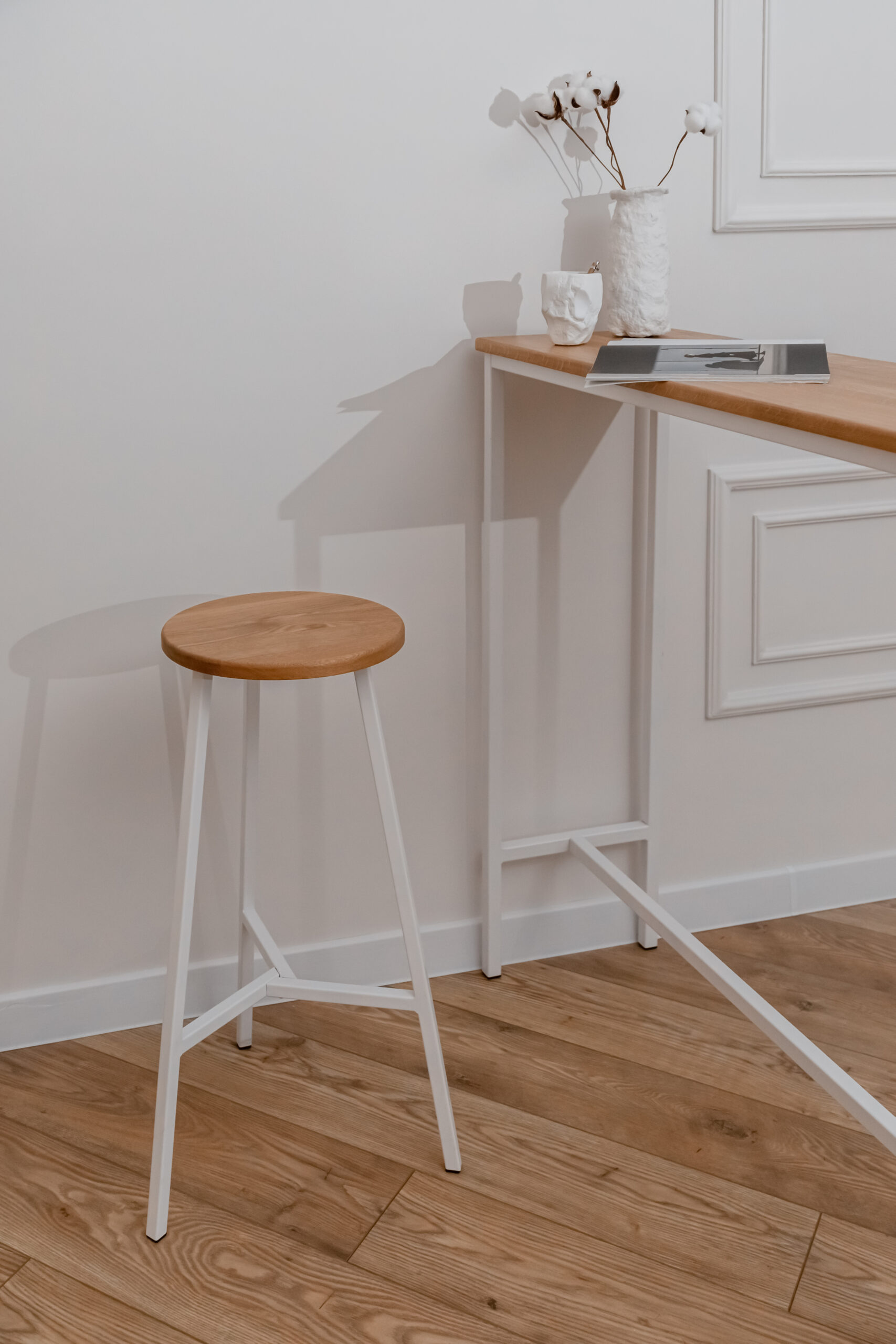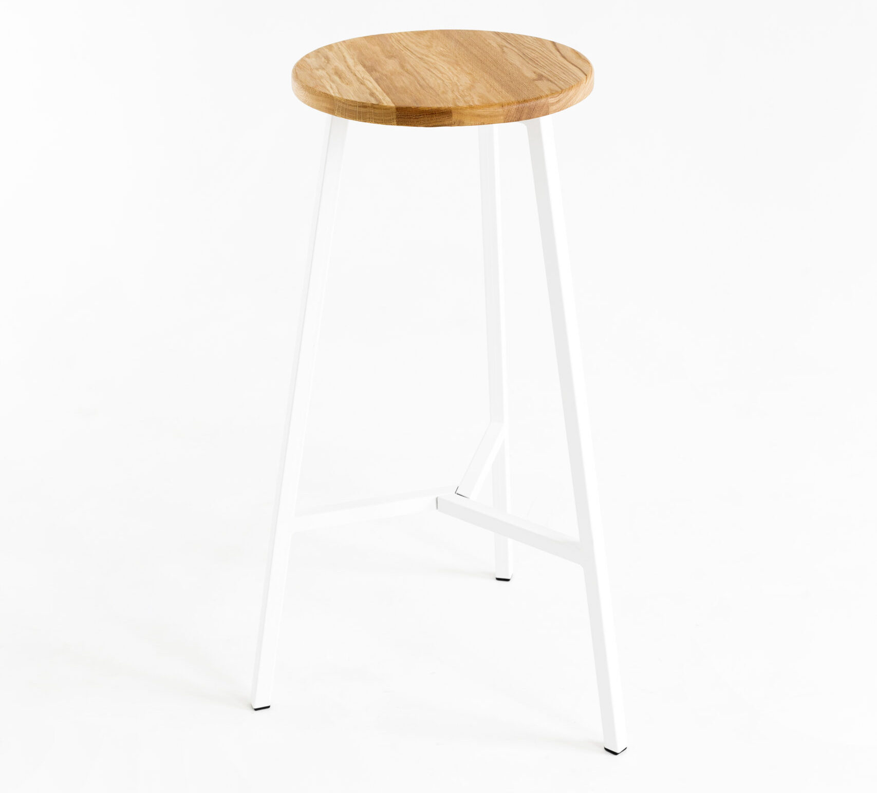 Высокий деревянный табурет, высота 78 см. Материал: цельноламельный массив дуба, металл.