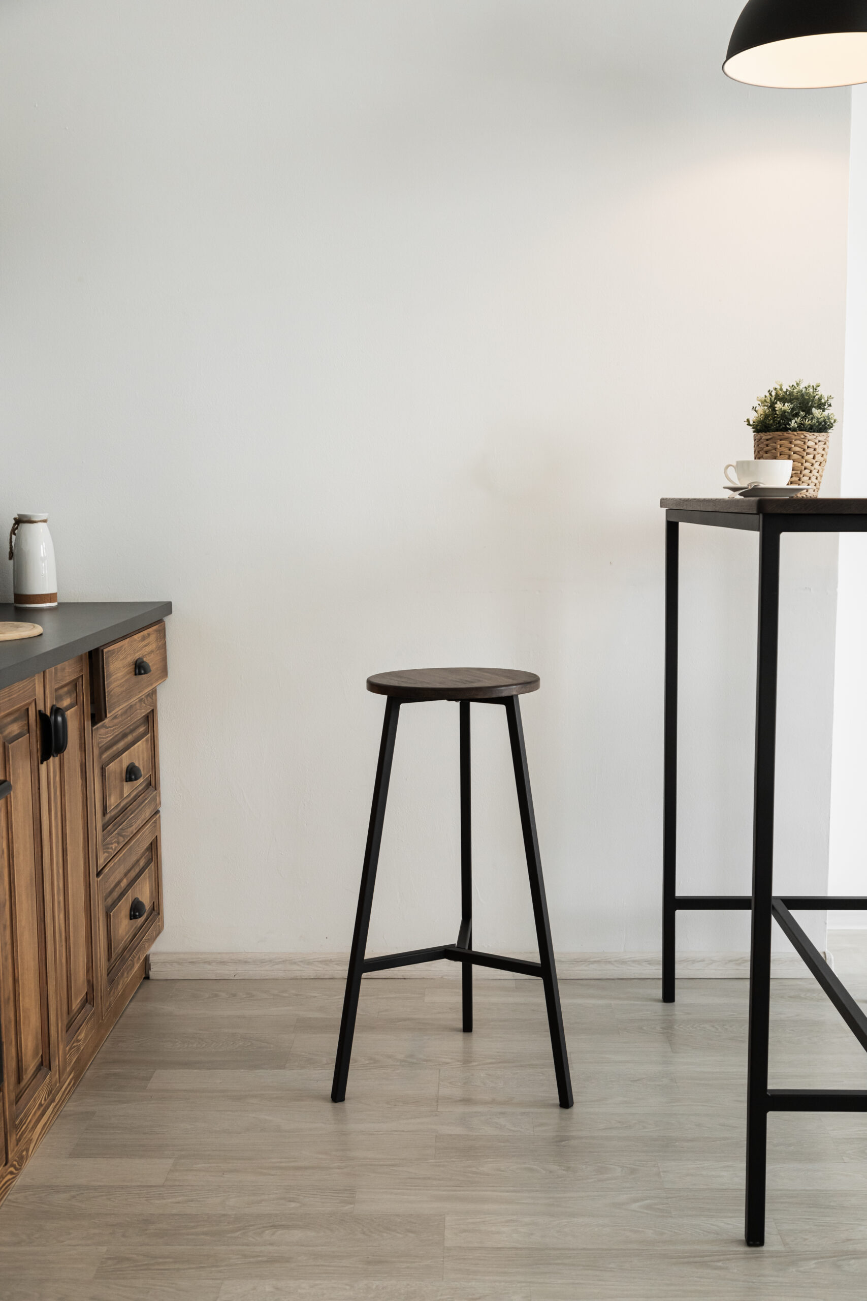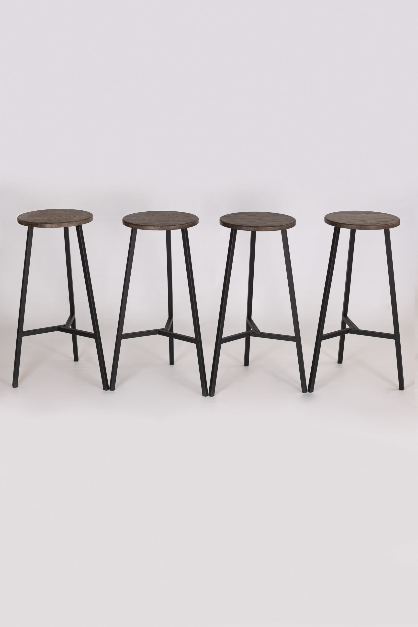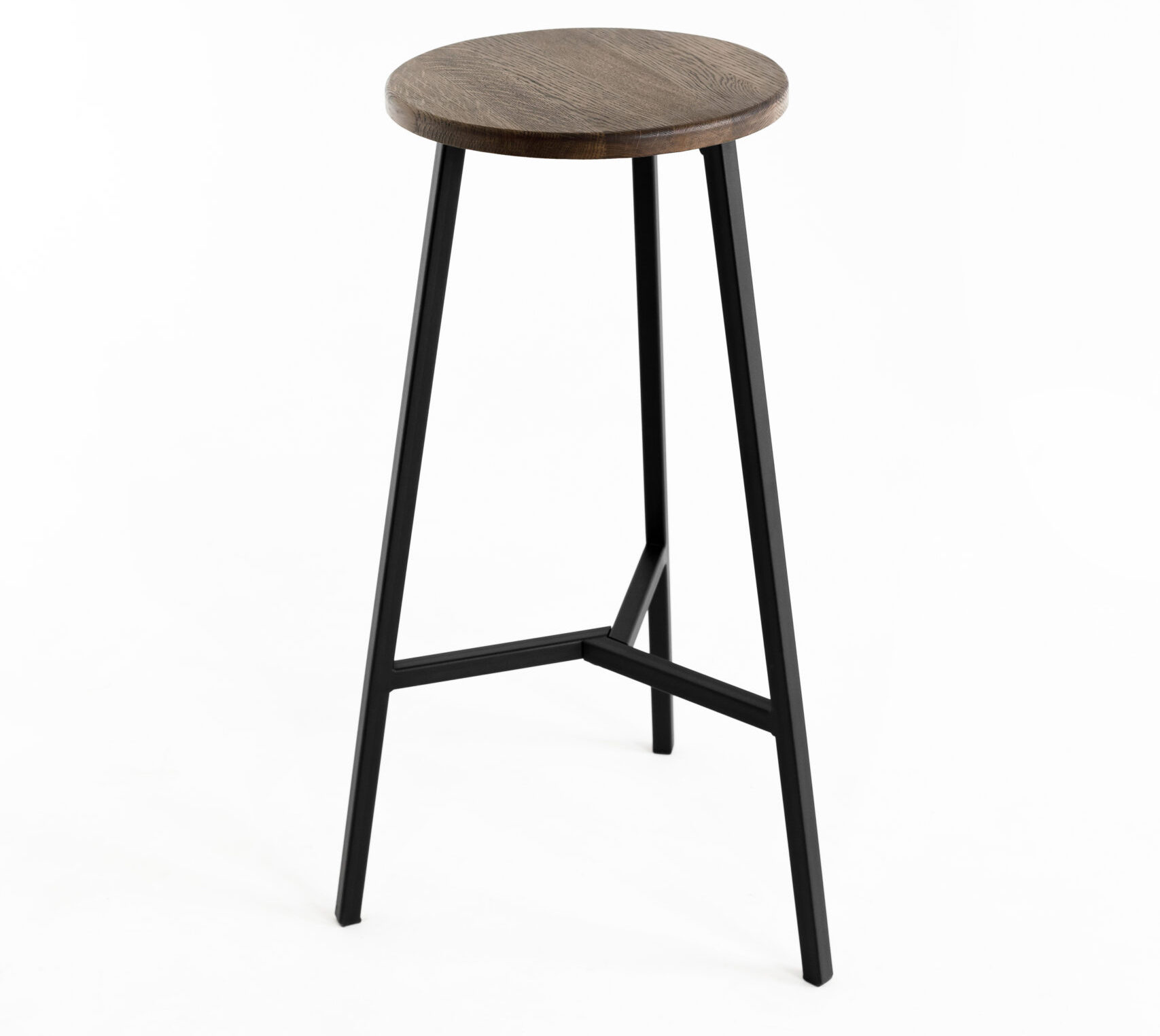 Высокий деревянный табурет, высота 76 см. Материал: цельноламельный массив дуба, металл.