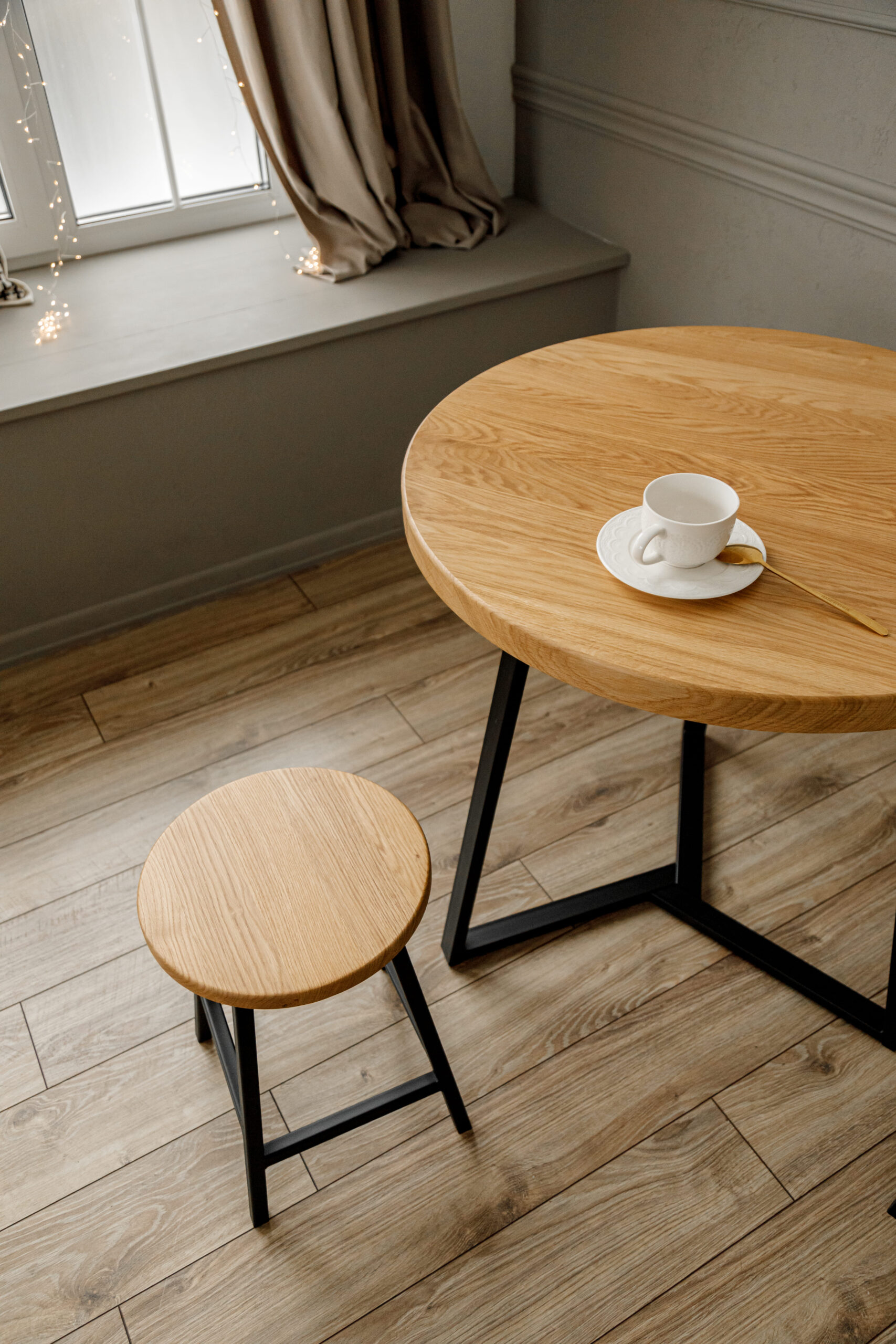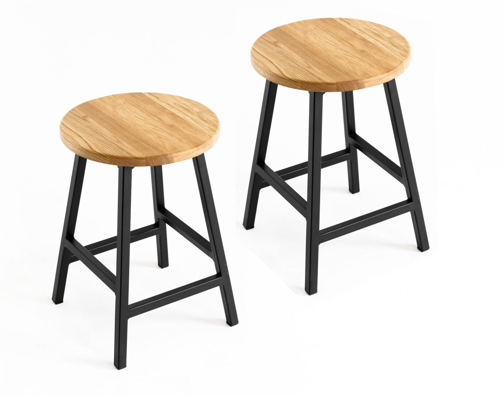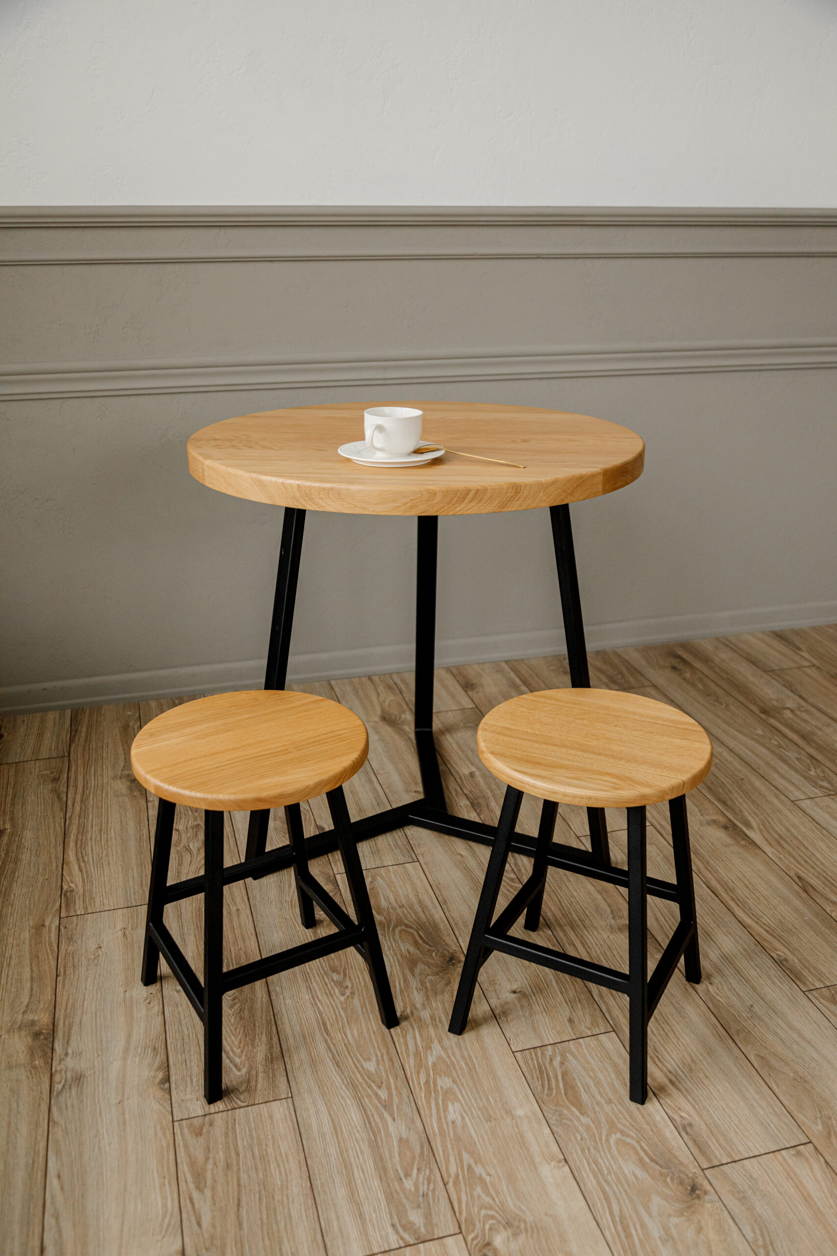 Полубарный табурет. Форма сиденья: пивная крышка. Материал: цельноламельный массив дуба, металл.