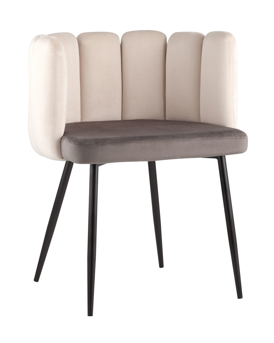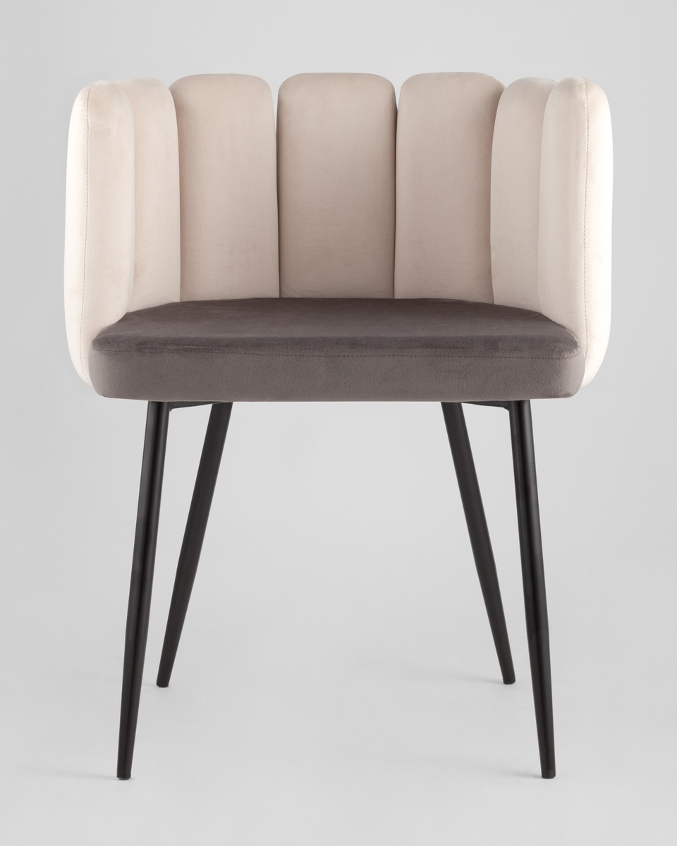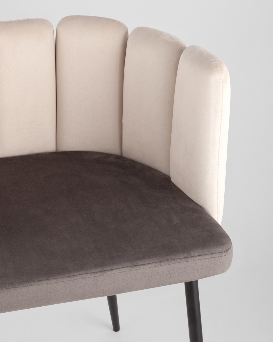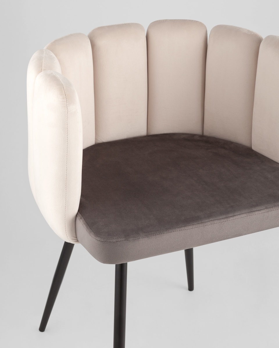 Мягкое двухцветное кресло с обивкой из прочного велюра. Надежная опора достигается благодаря металлическому каркасу и удобным устойчивым ножкам. Спинка с оригинальным дизайном украшена широкими полосами.