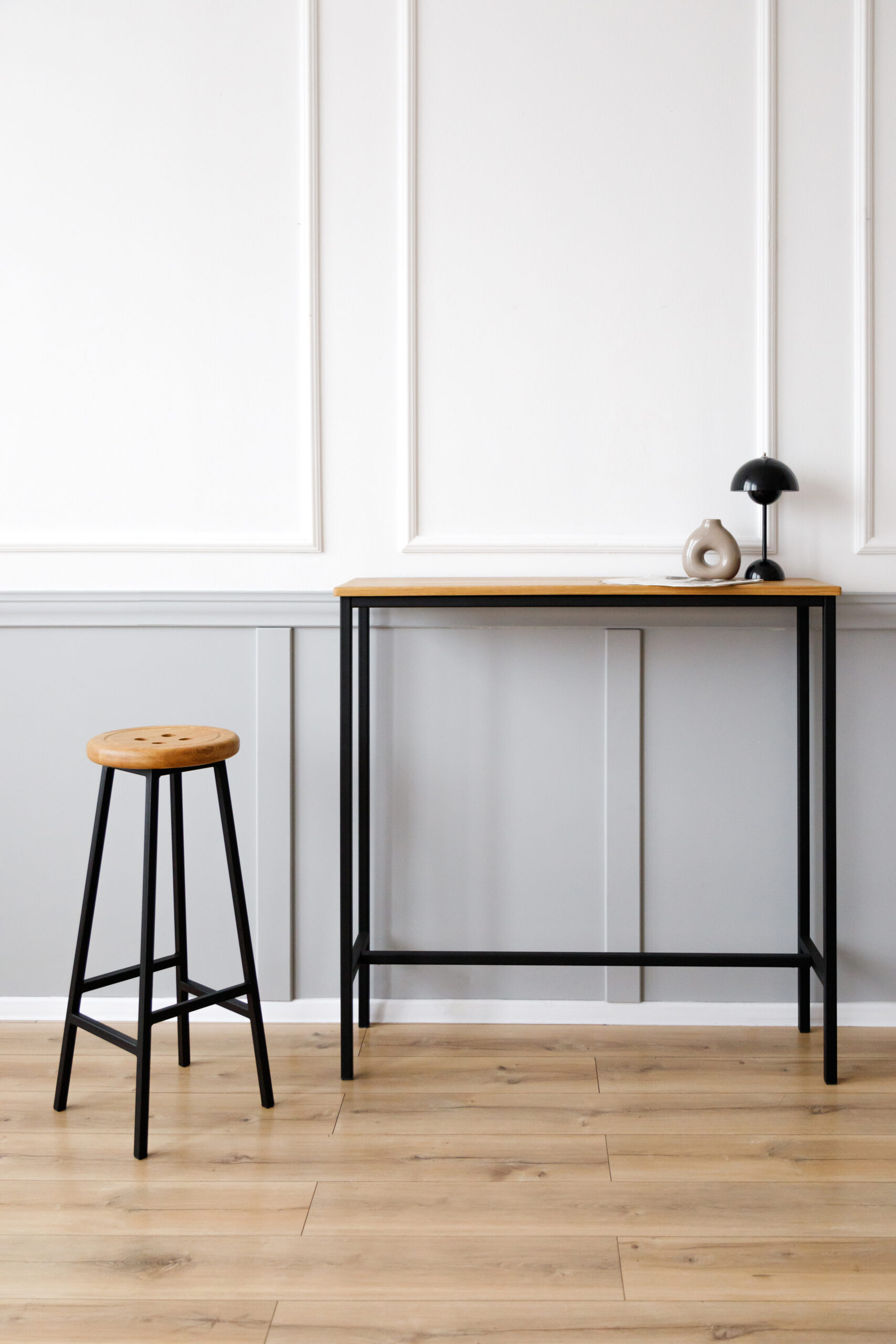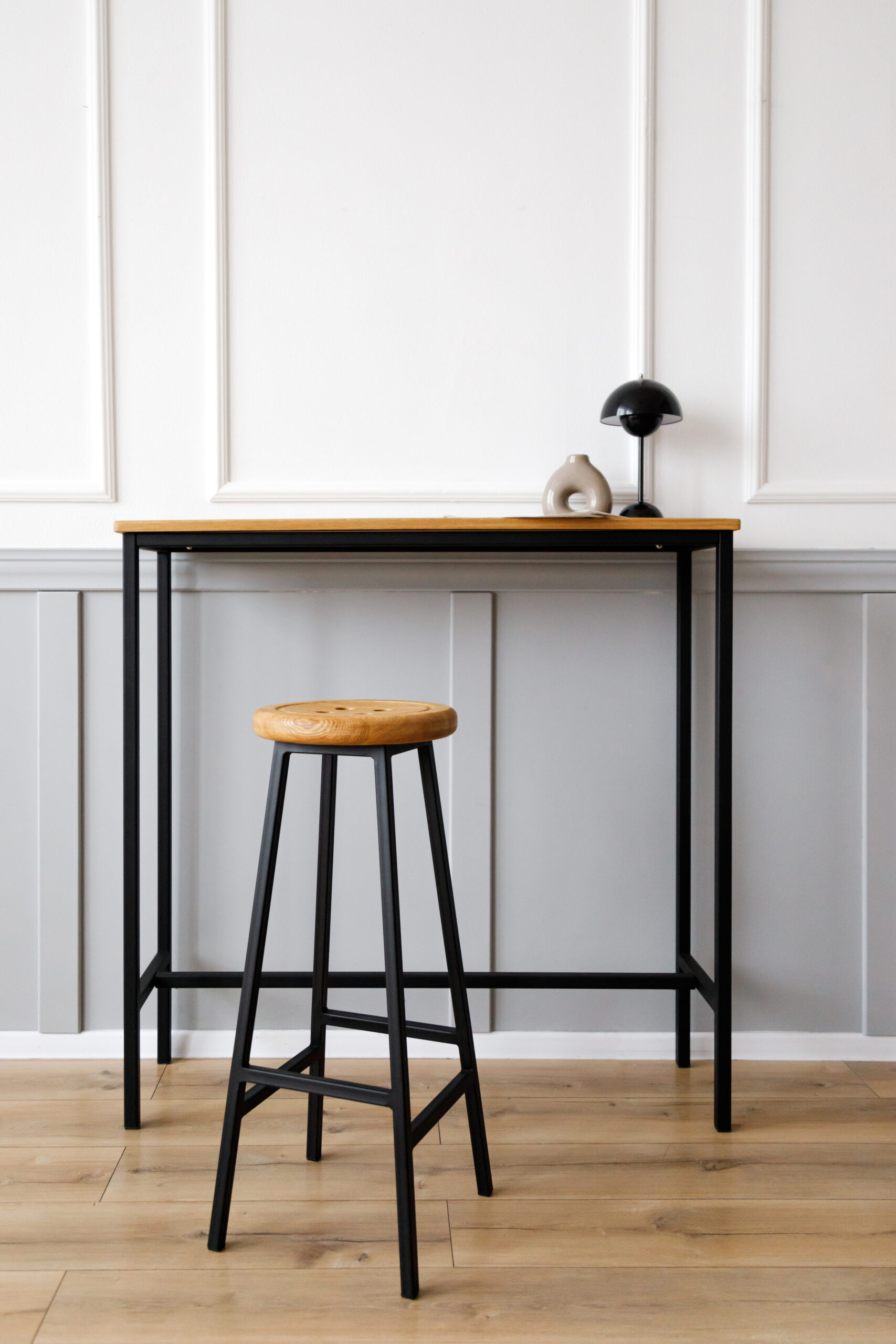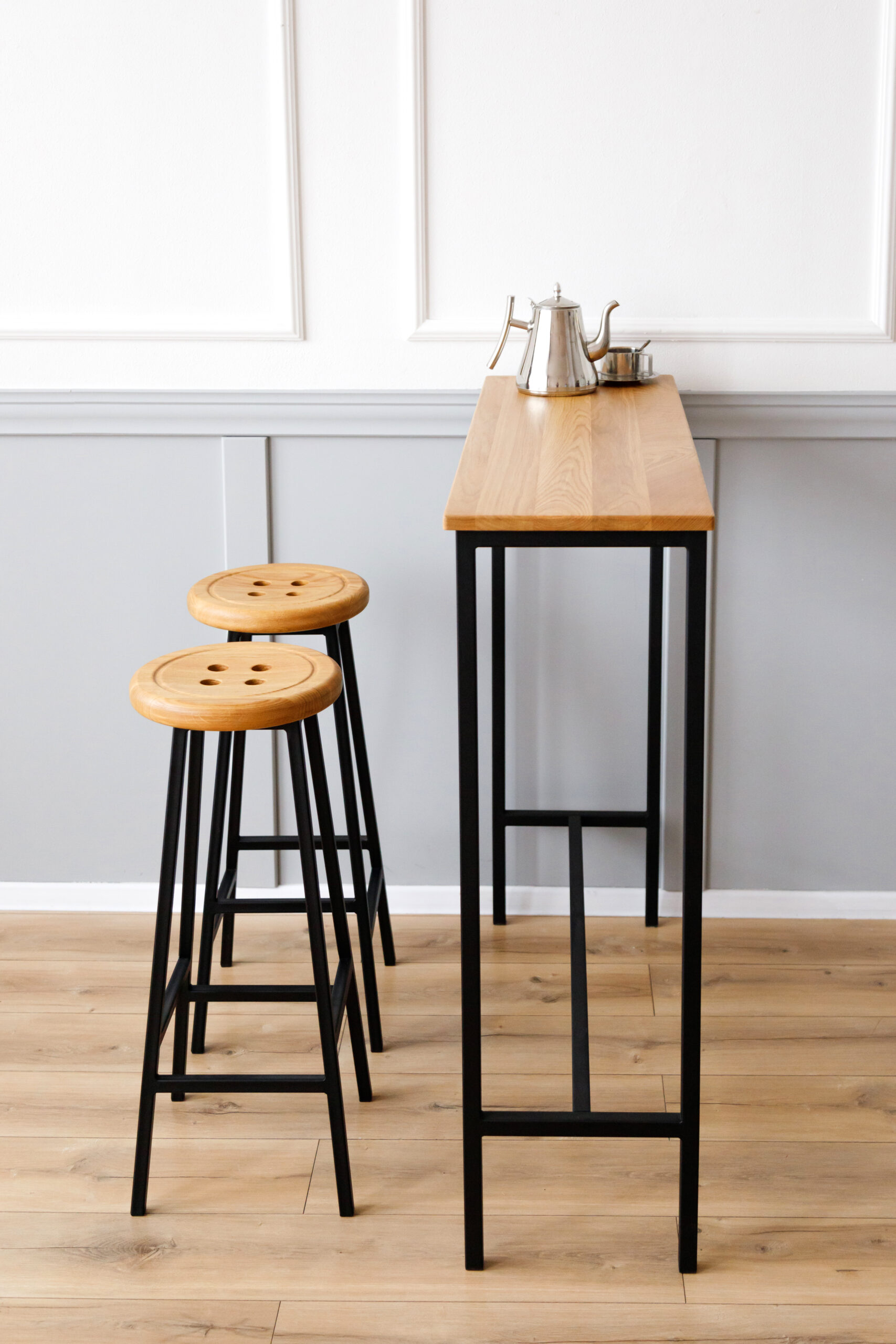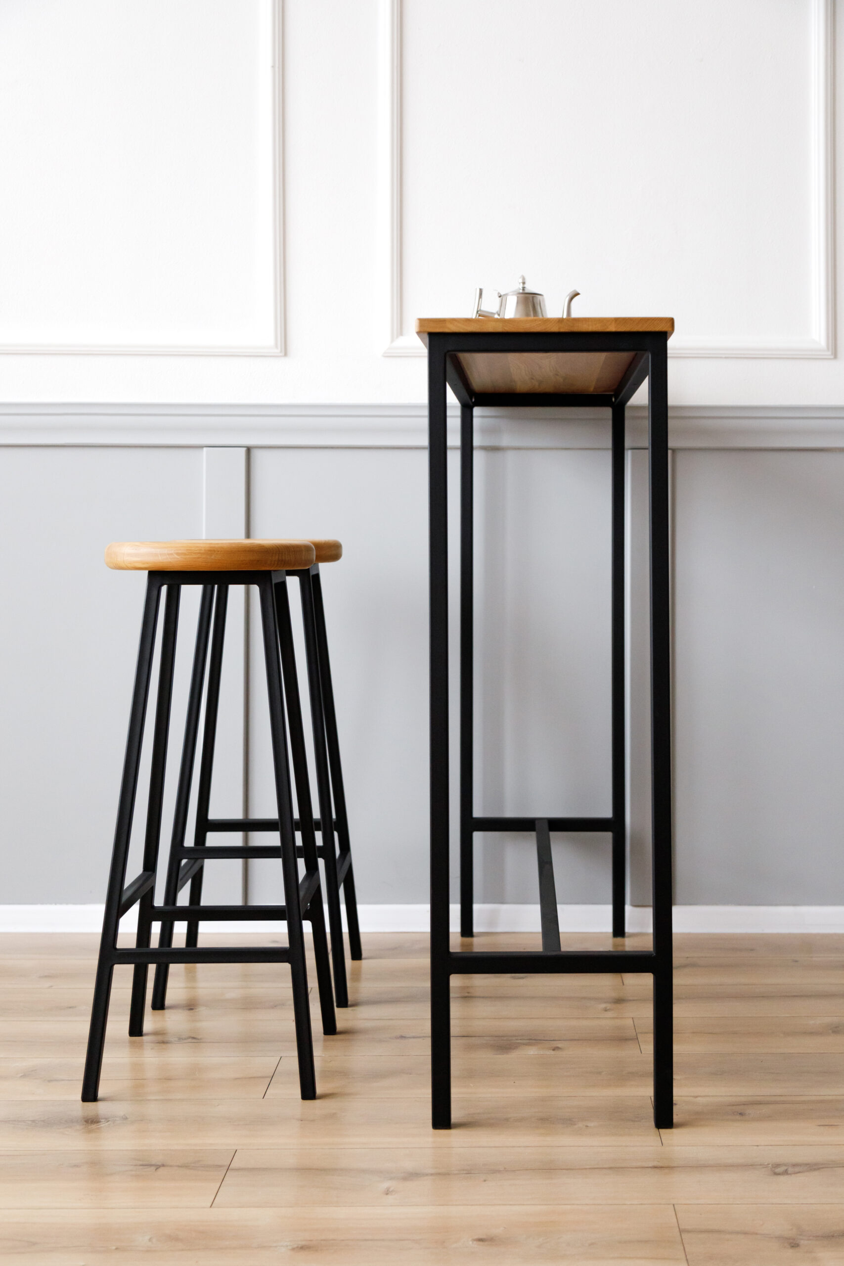 Высокий деревянный табурет, высота 76 см. Материал: цельноламельный массив дуба, металл.