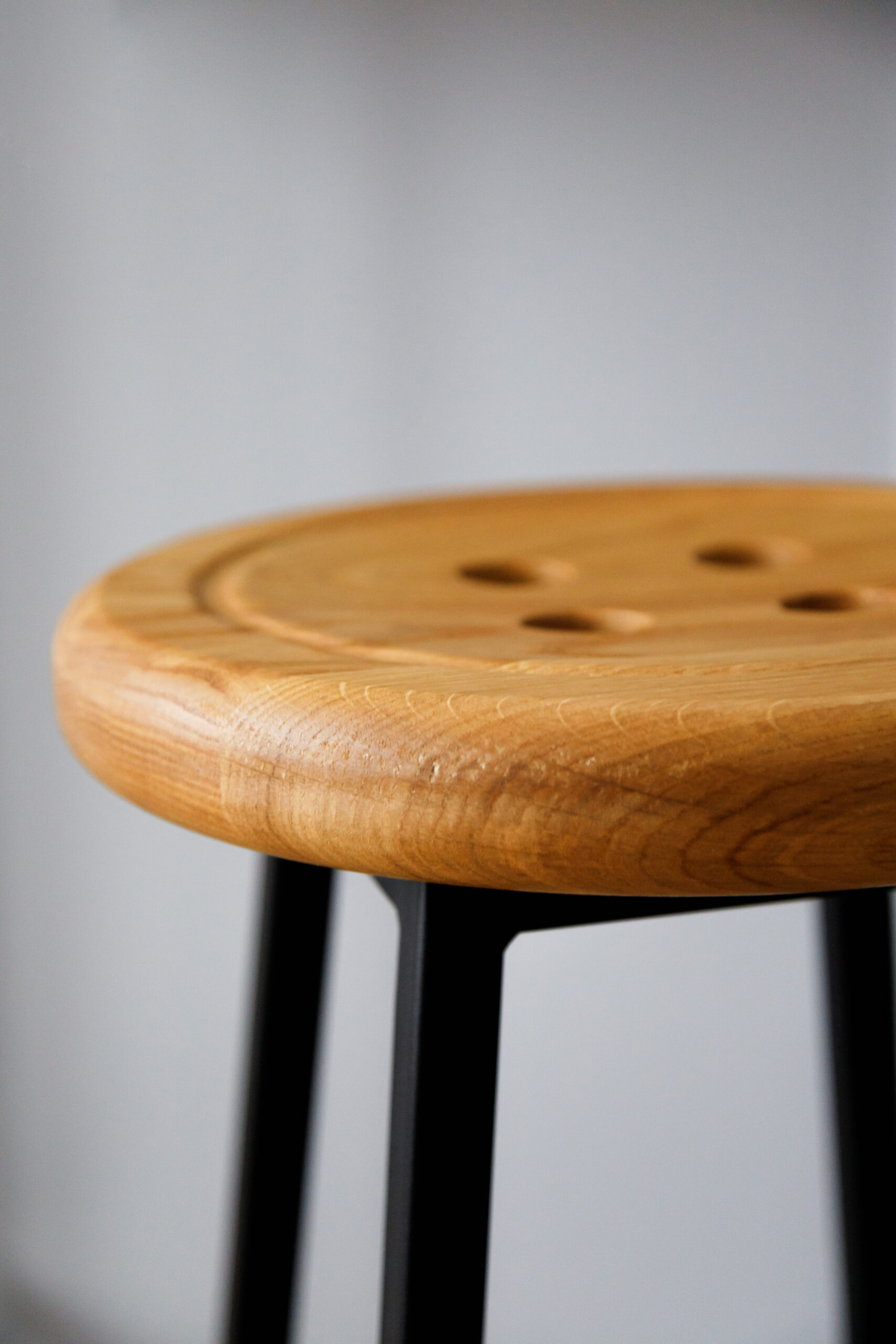 Полубарный табурет. Форма сиденья: пивная крышка. Материал: цельноламельный массив дуба, металл.