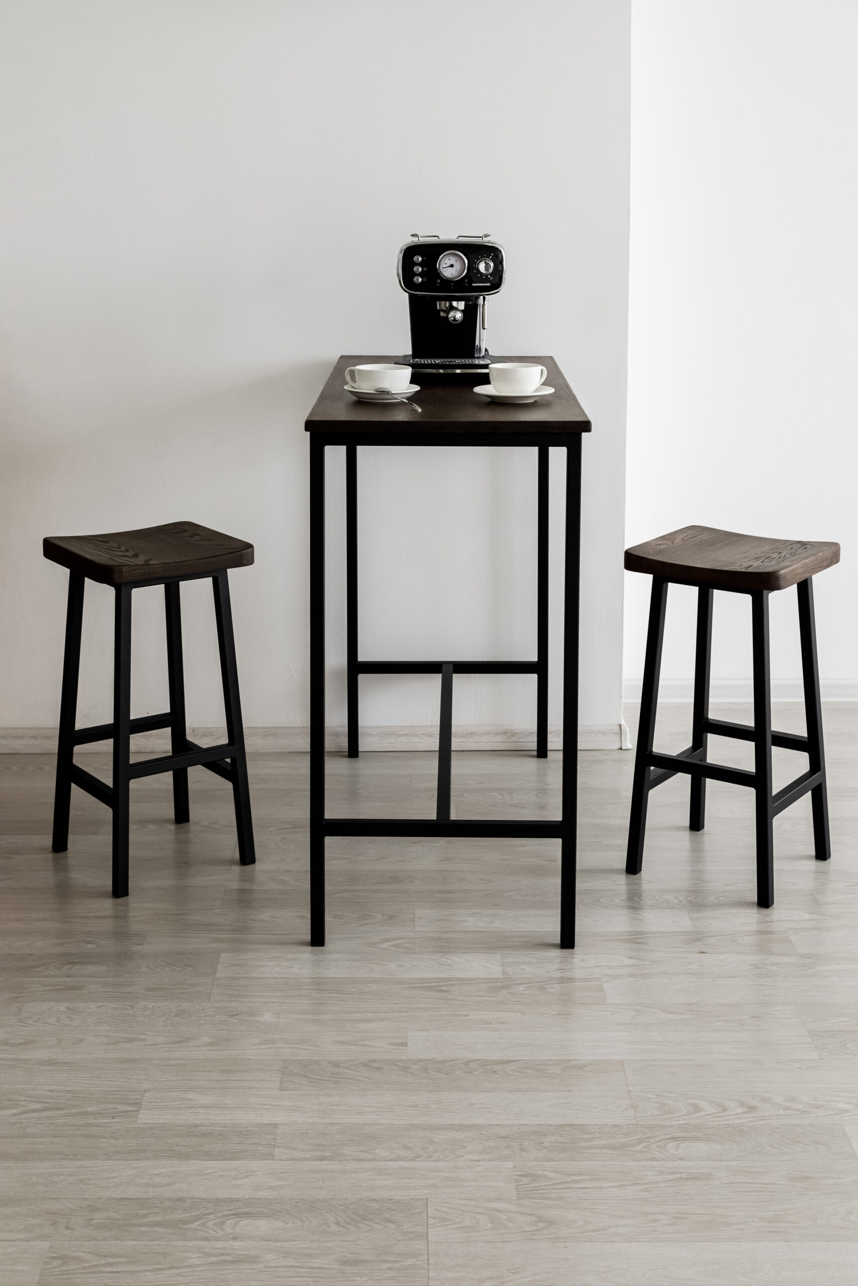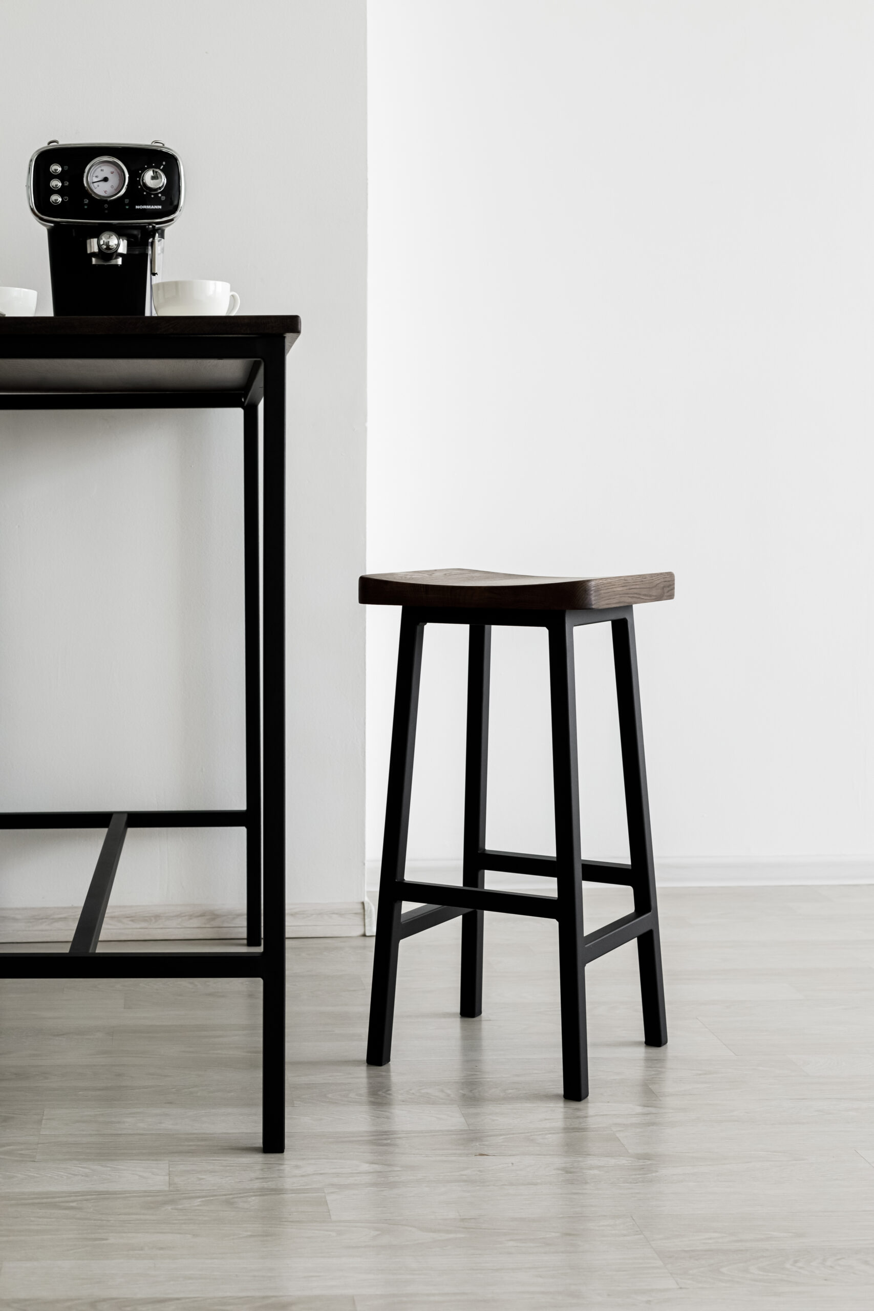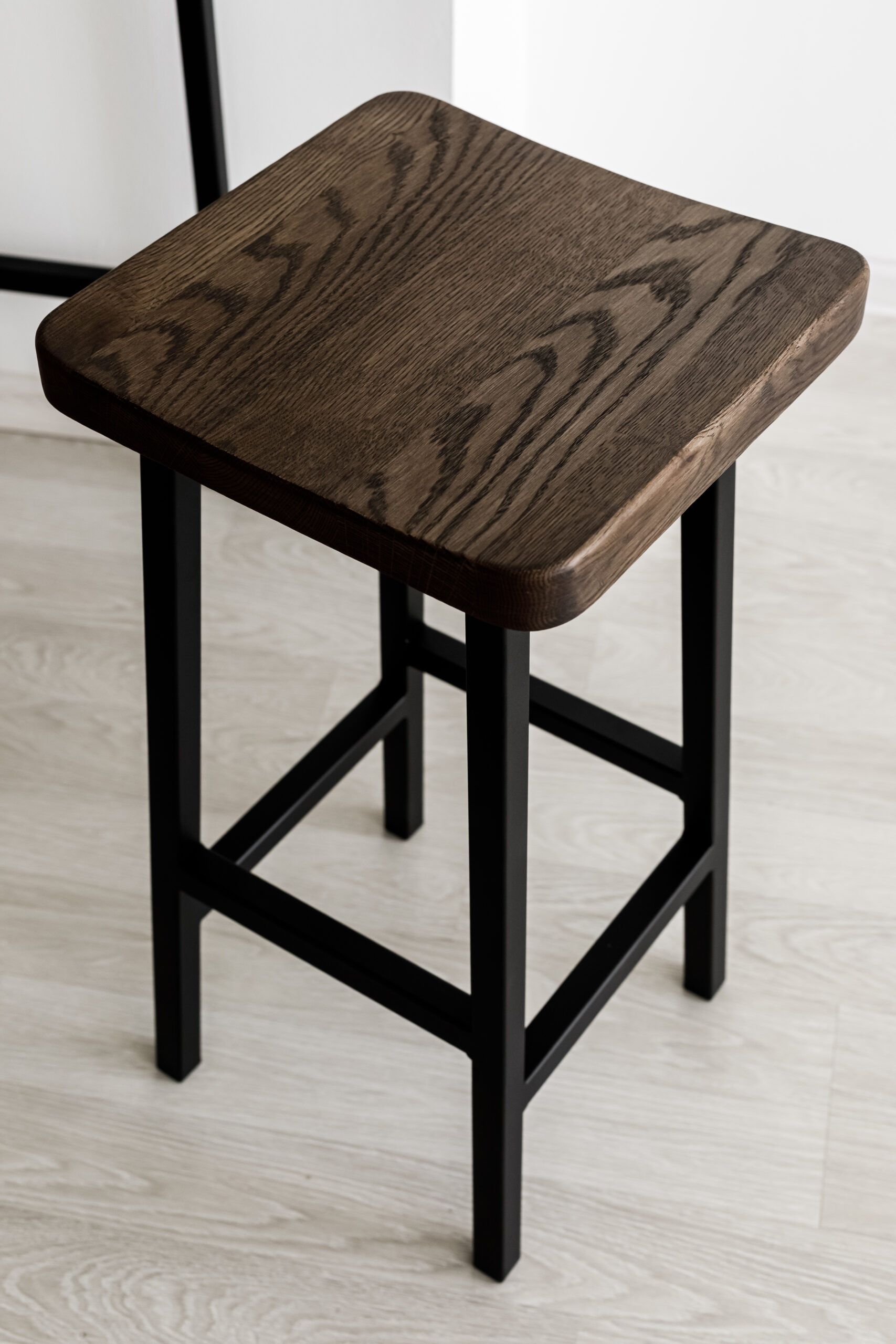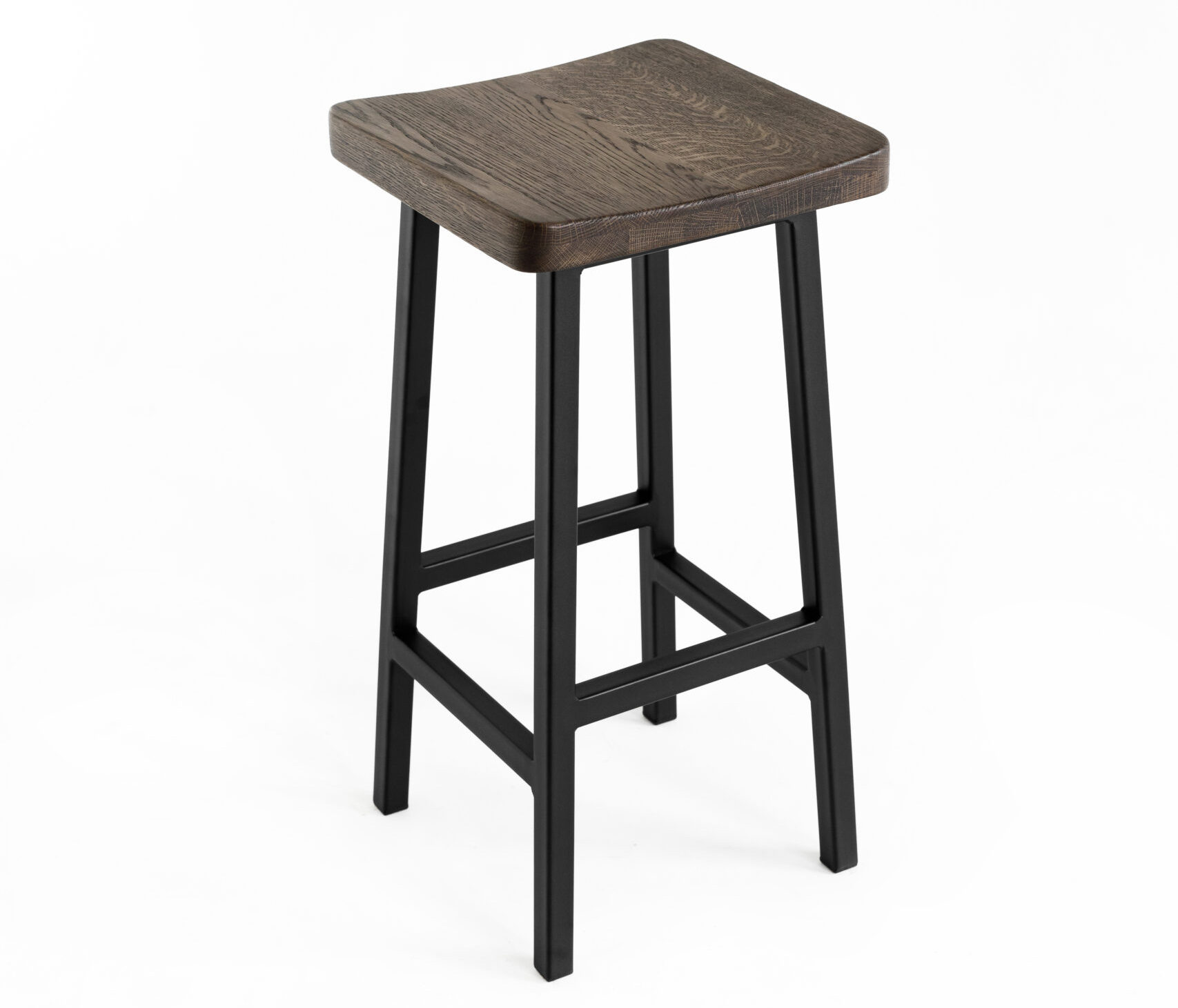 Полубарный стул со спинкой и вогнутым сиденьем. Материал: цельноламельный массив дуба, металл.