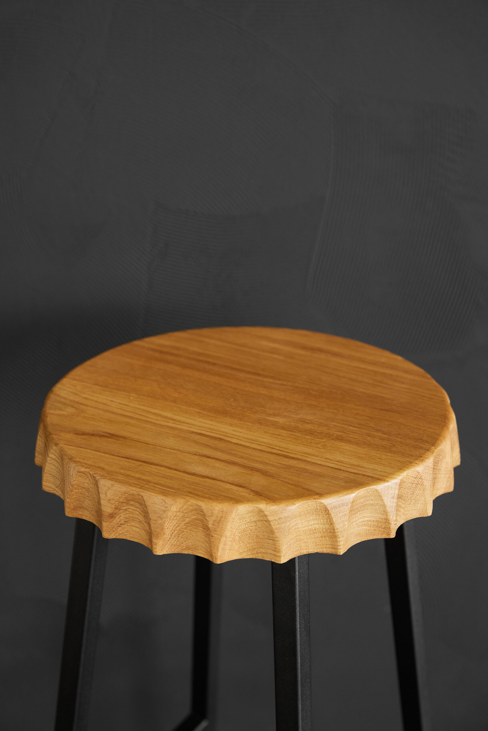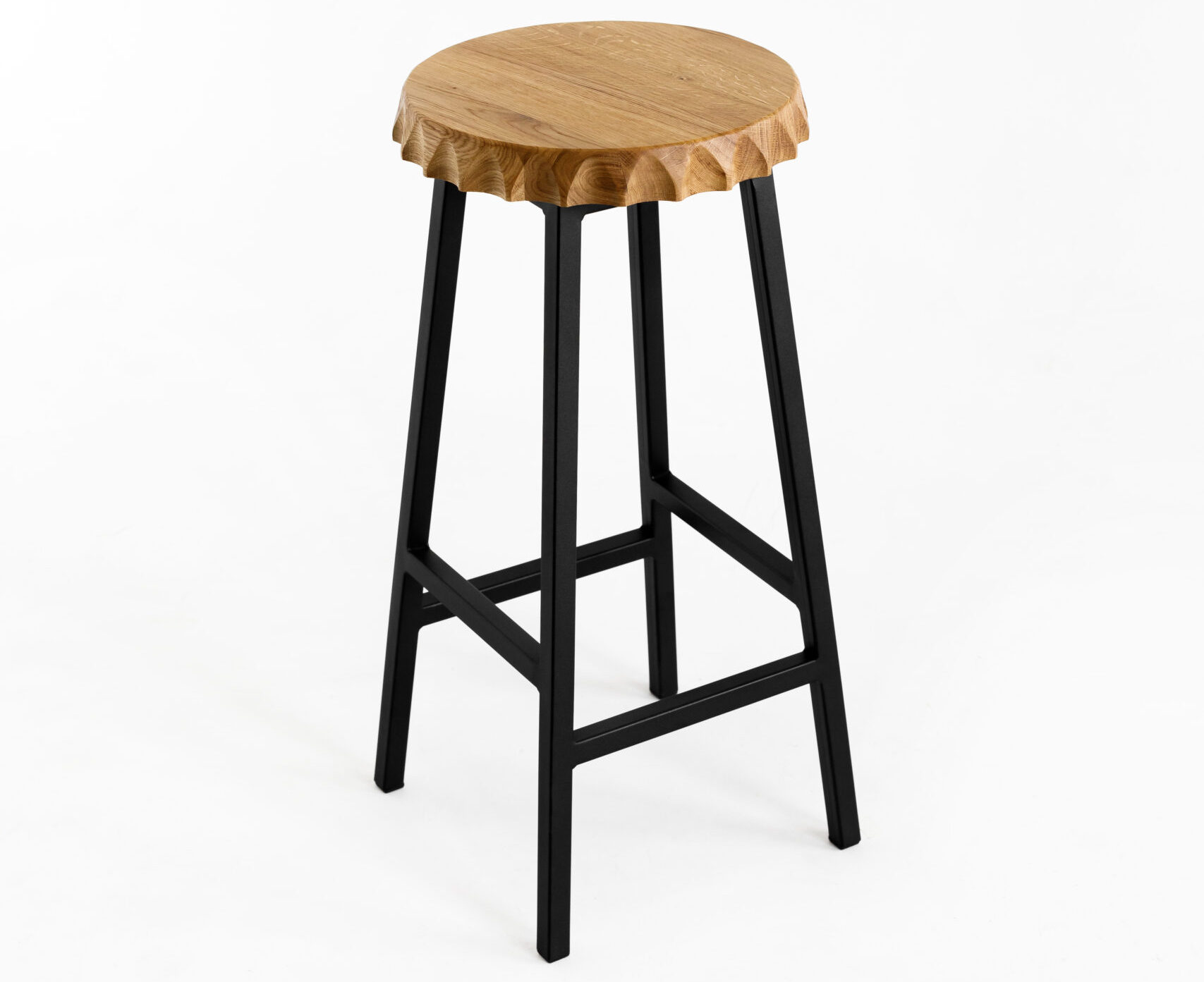 код 140894Полубарный табурет. Форма сиденья: пивная крышка. Материал: цельноламельный массив дуба, металл.