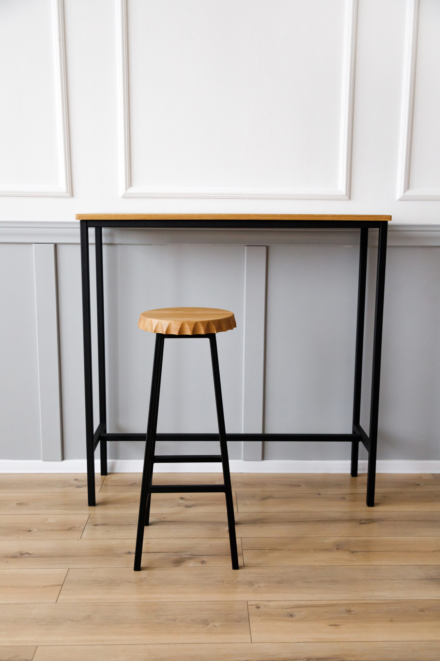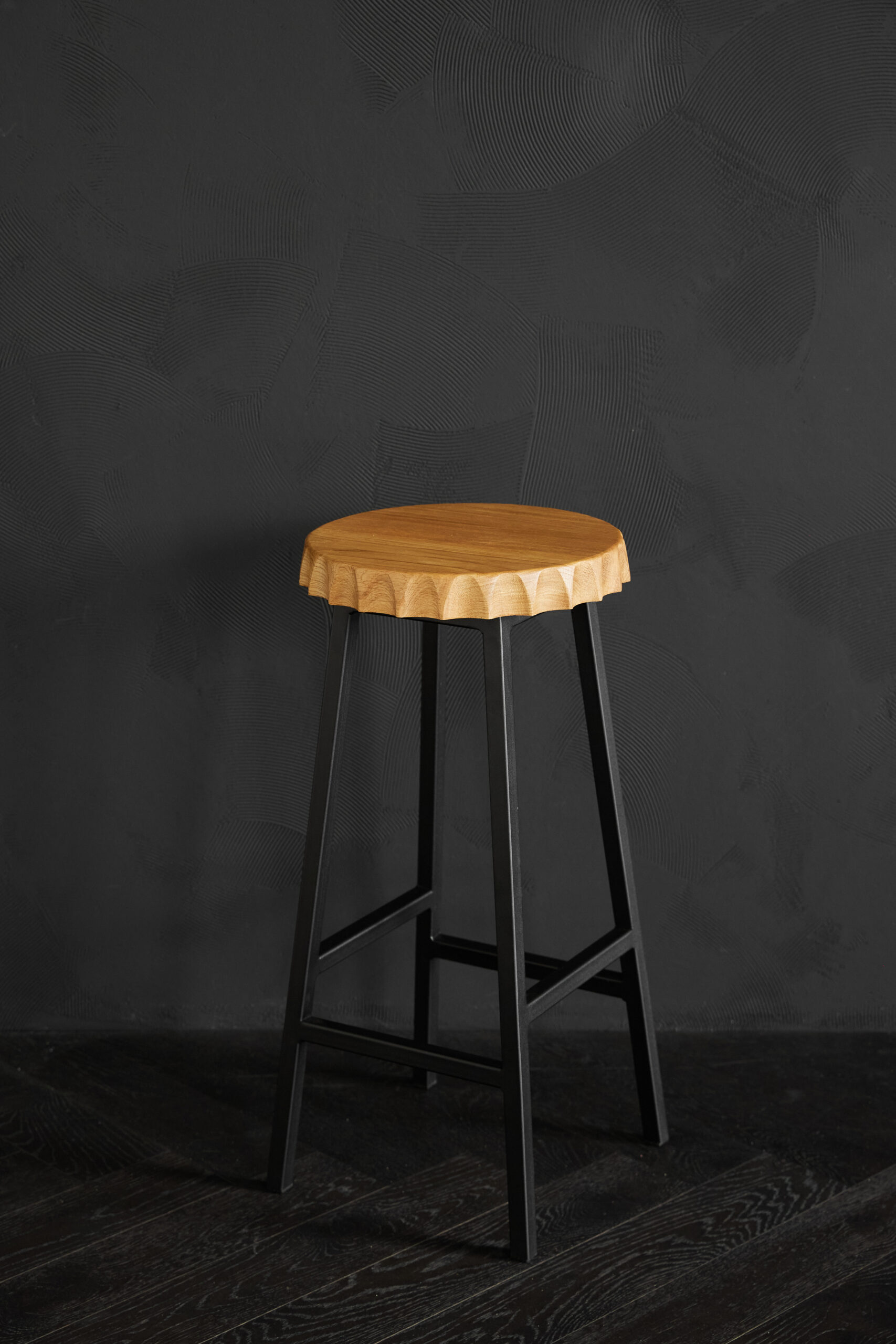 Полубарный табурет, высота 65 см. Материал: цельноламельный массив дуба, металл.