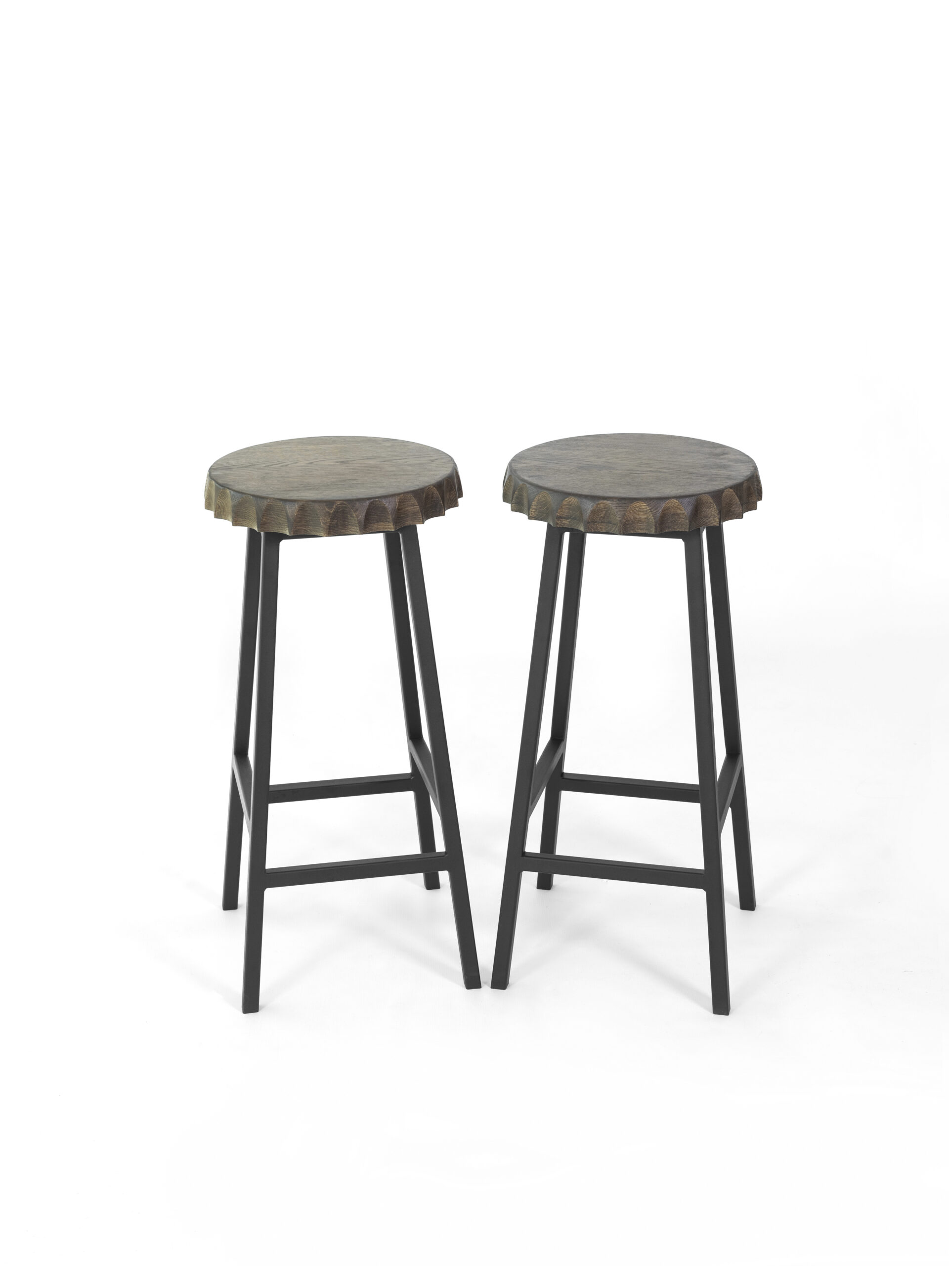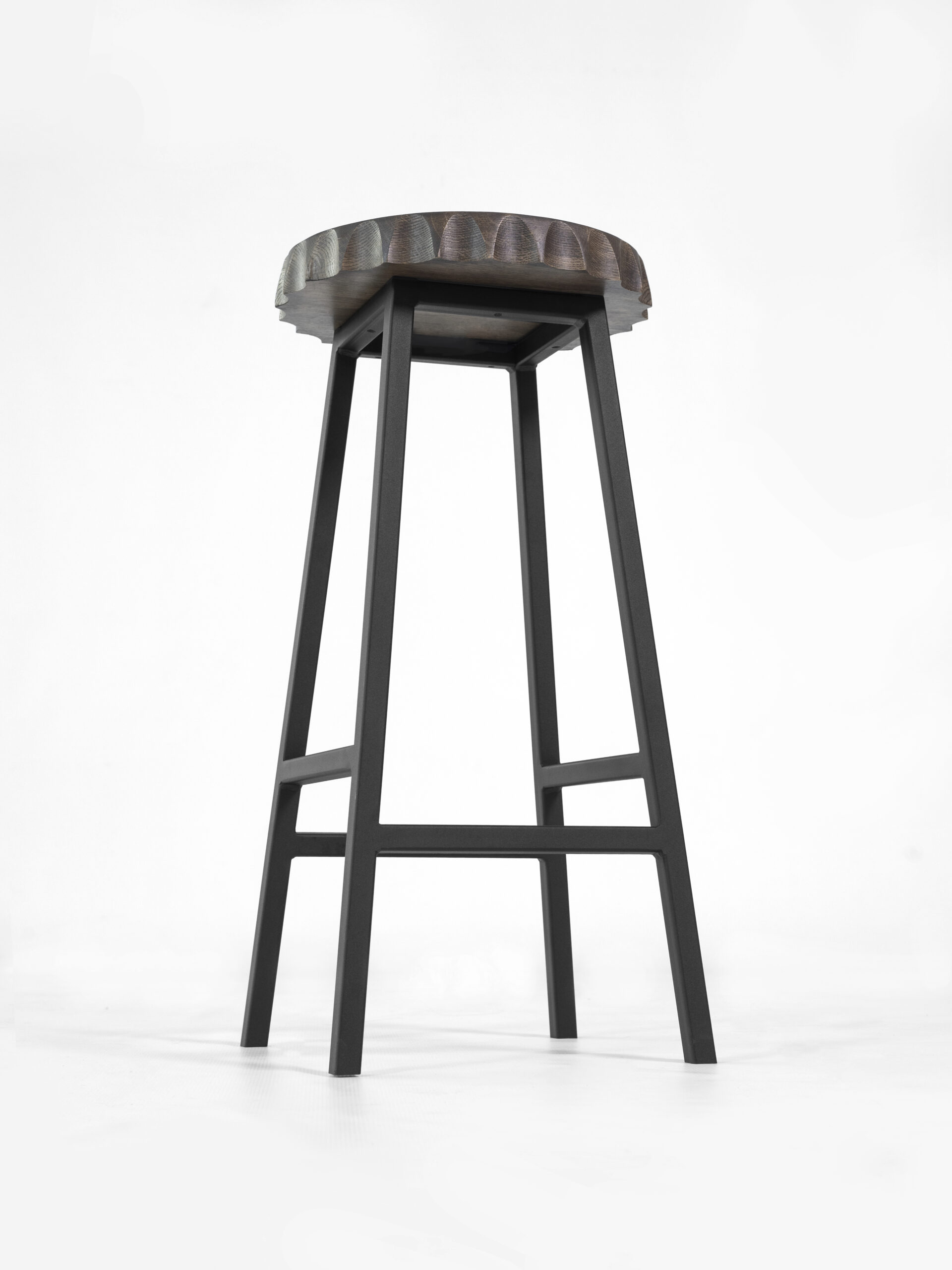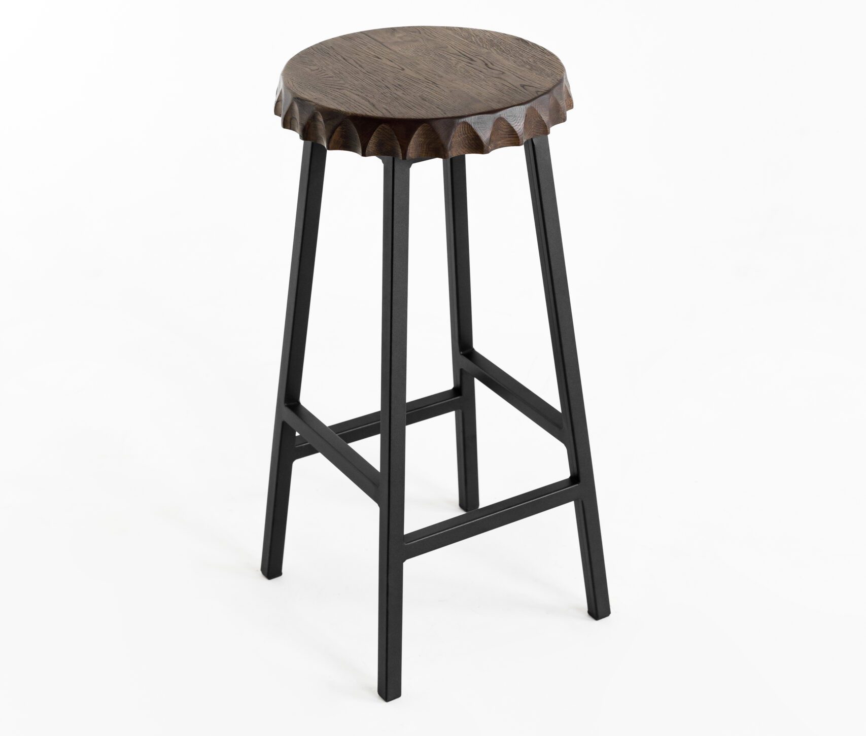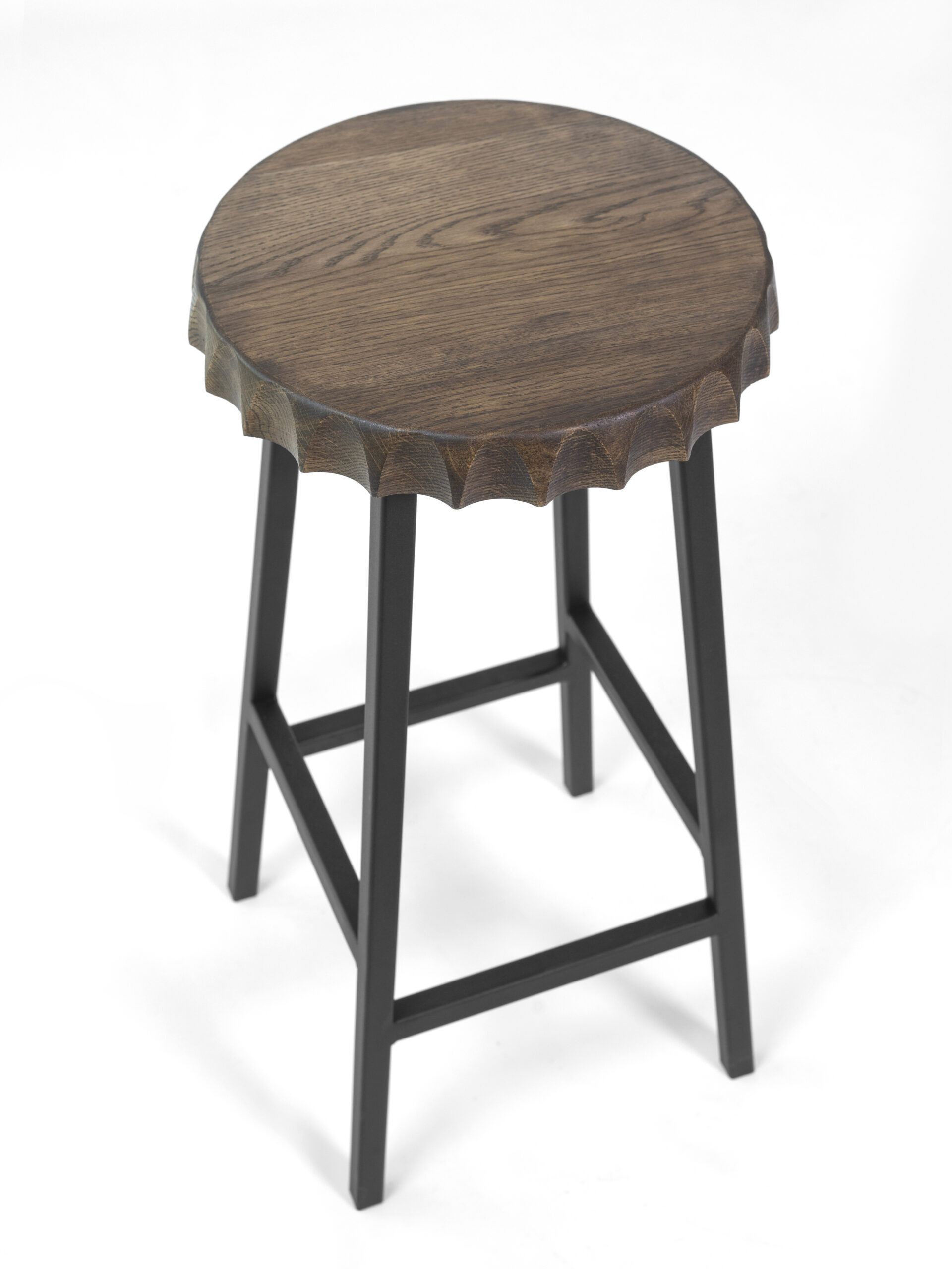 код 140893Полубарный табурет. Форма сиденья: пивная крышка. Материал: цельноламельный массив дуба, металл.