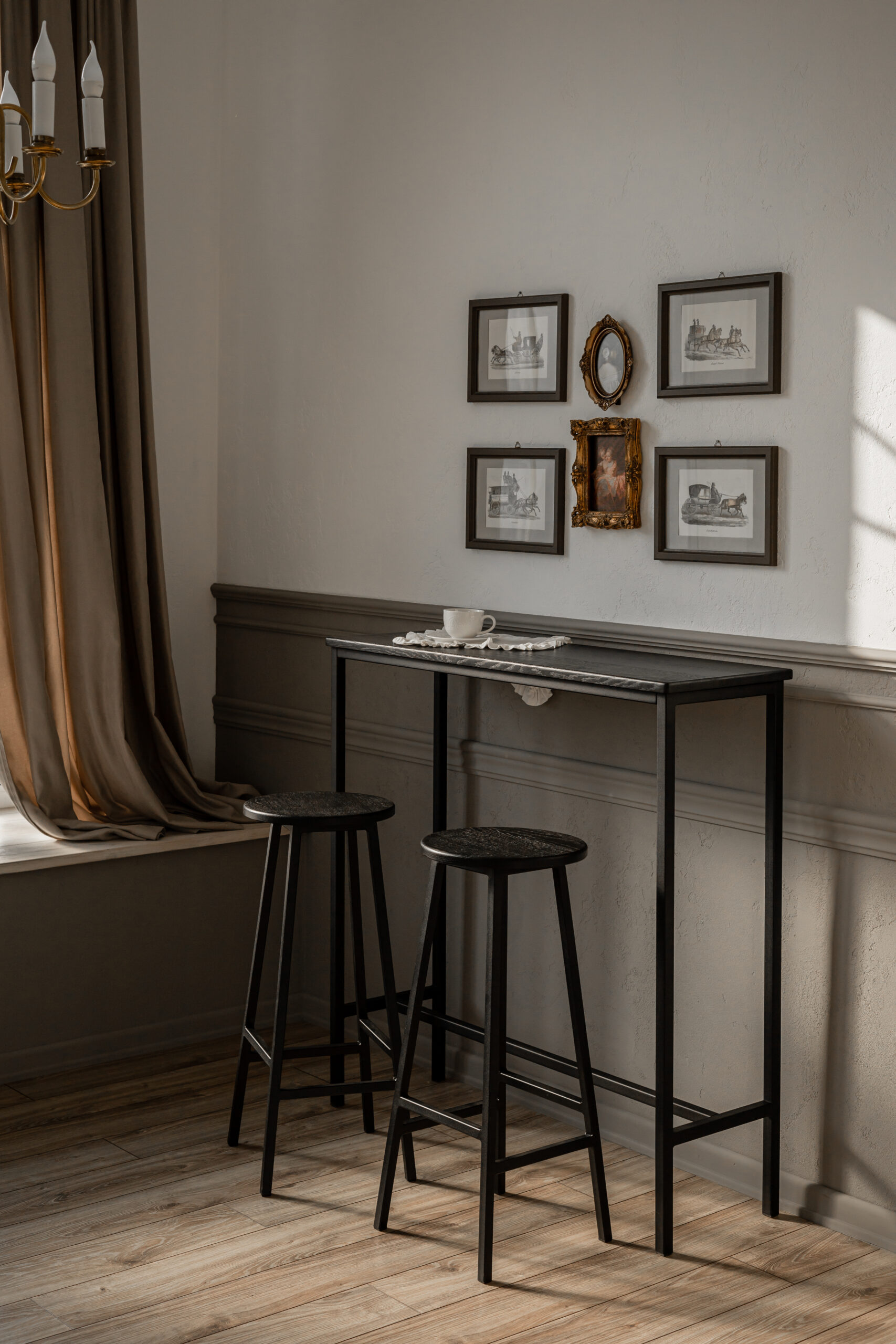 Полубарный табурет, высота 63 см. Материал: цельноламельный массив дуба, металл.