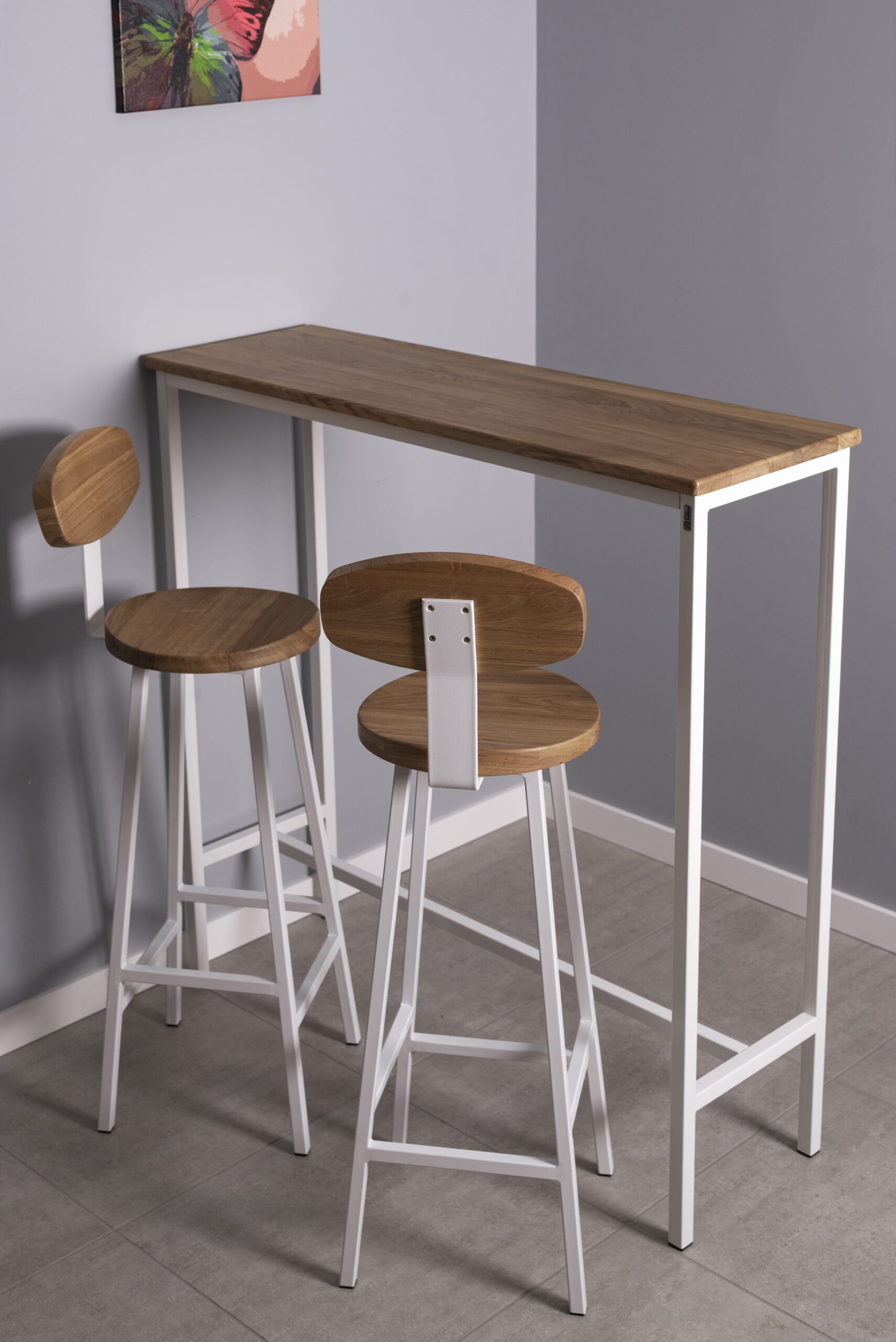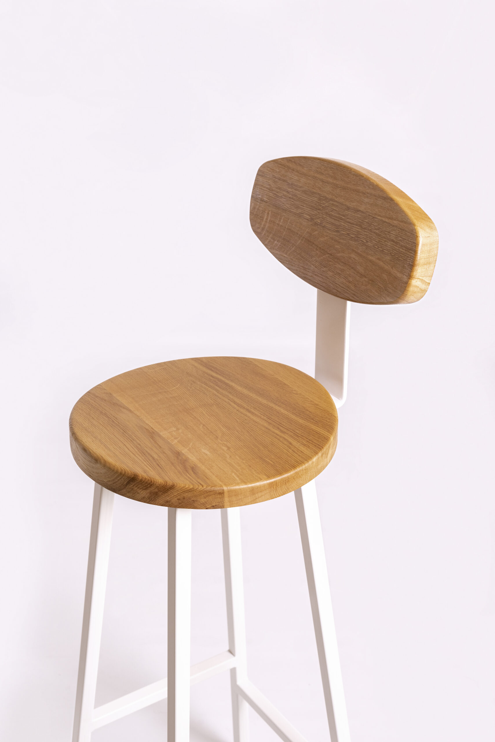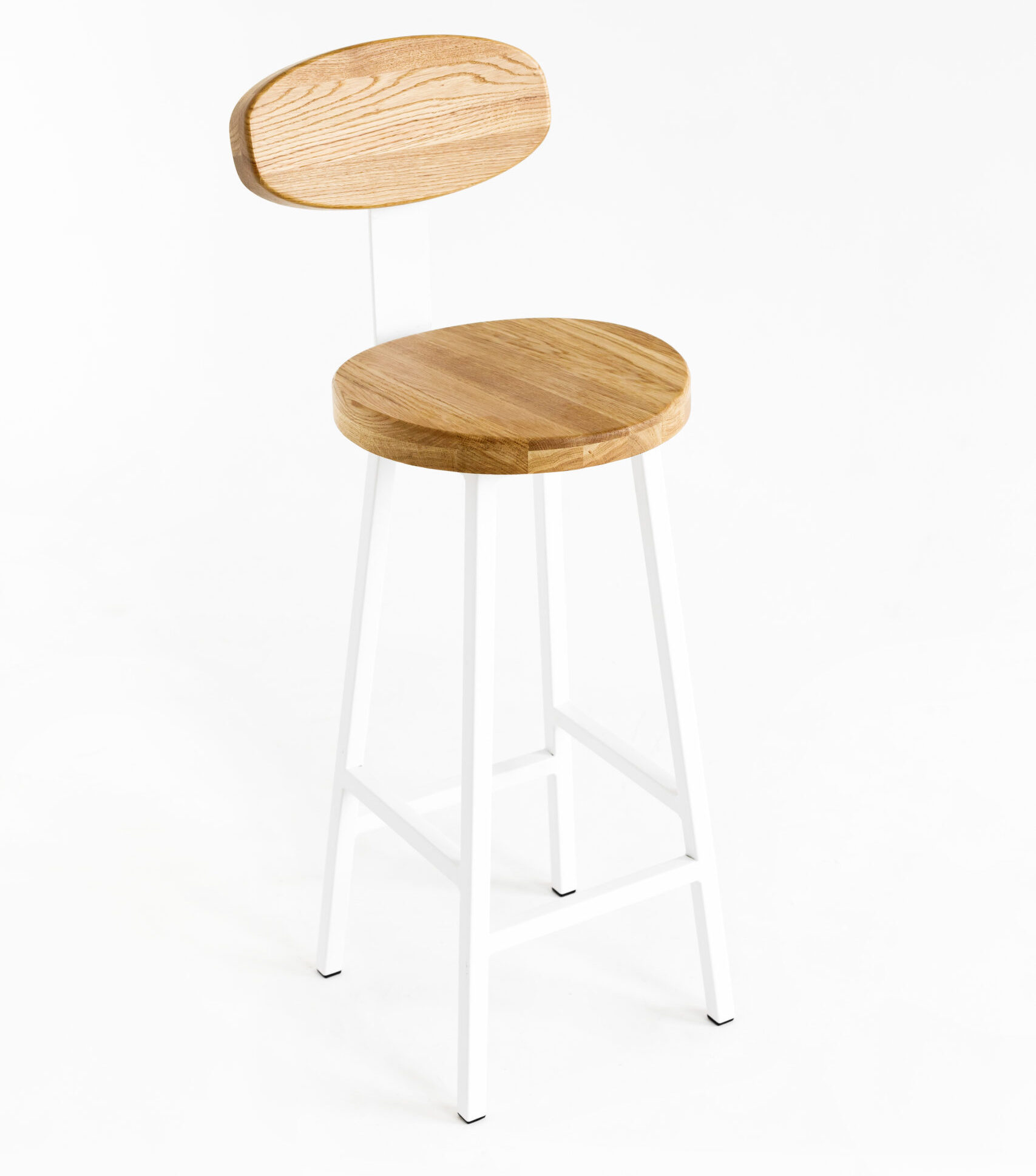 Барный стул со спинкой и вогнутым сиденьем. Материал: цельноламельный массив дуба, металл.