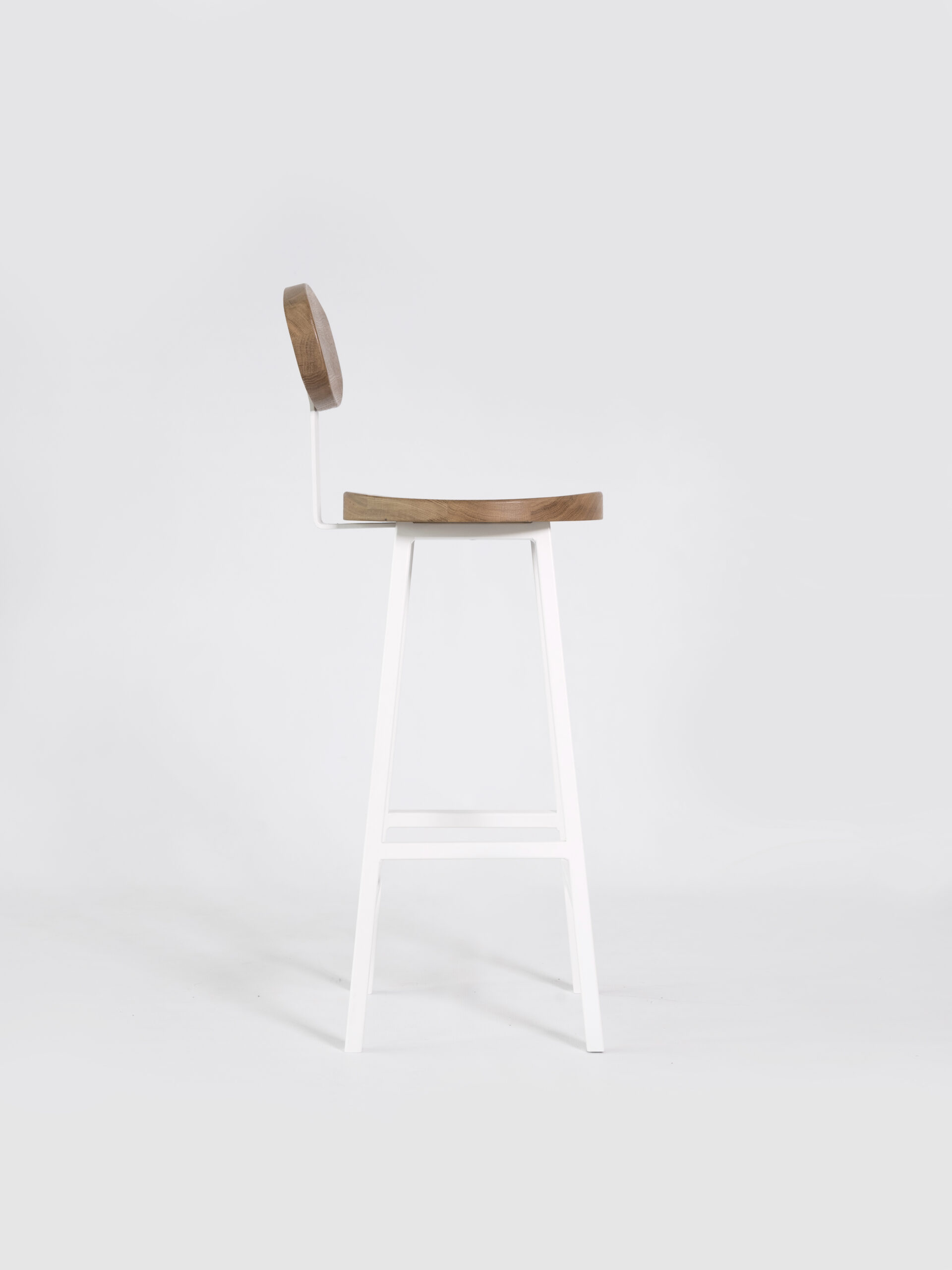 Барный стул со спинкой и вогнутым сиденьем. Материал: цельноламельный массив дуба.