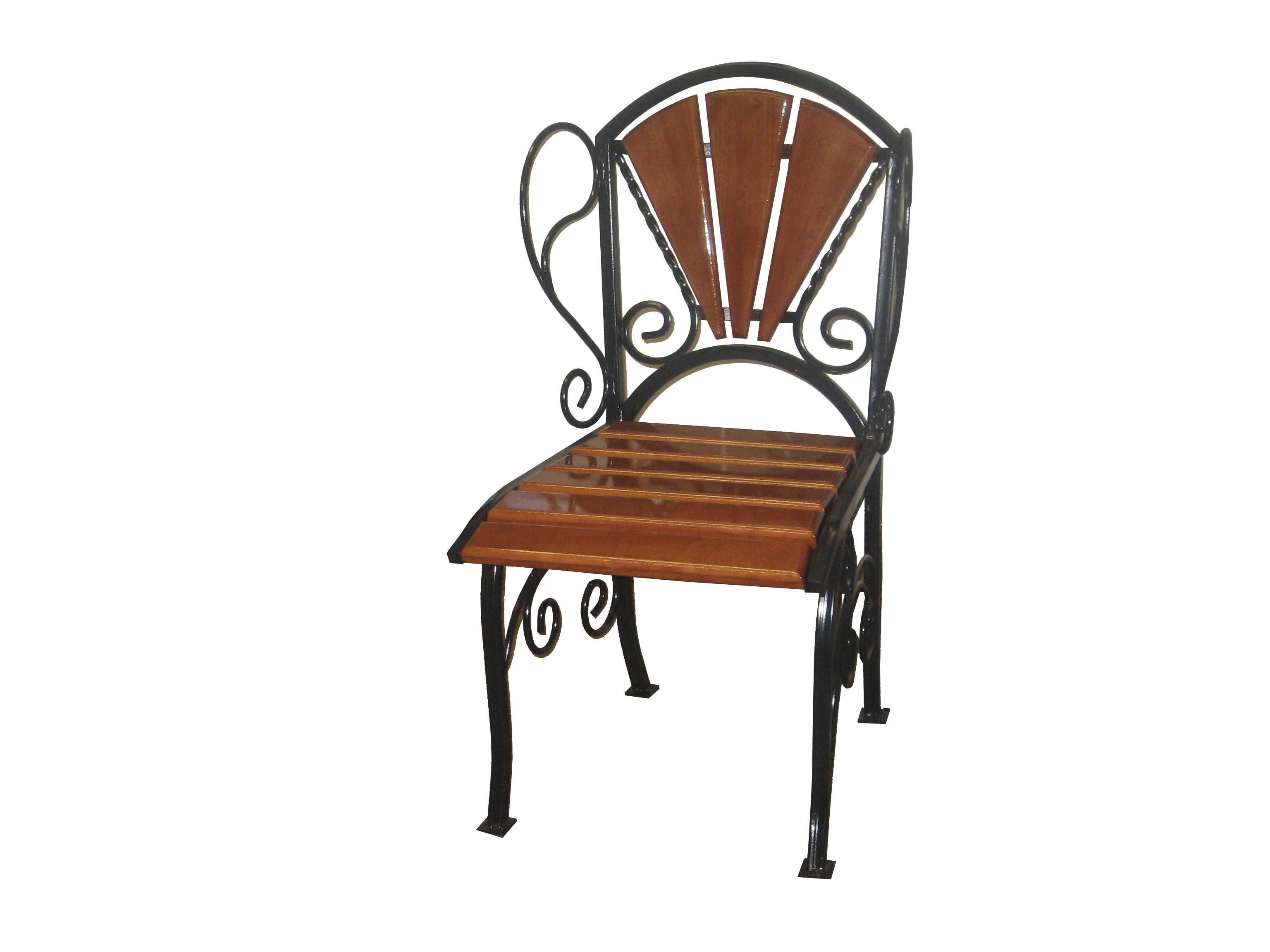 Стул на кованном каркасе с узорчатой спинкой и сиденьем из бруса. Долговечная надежная мебель для террасы и балкона.
