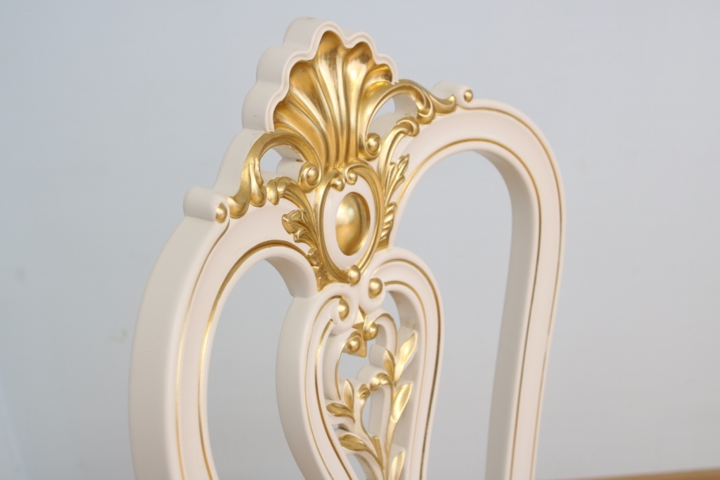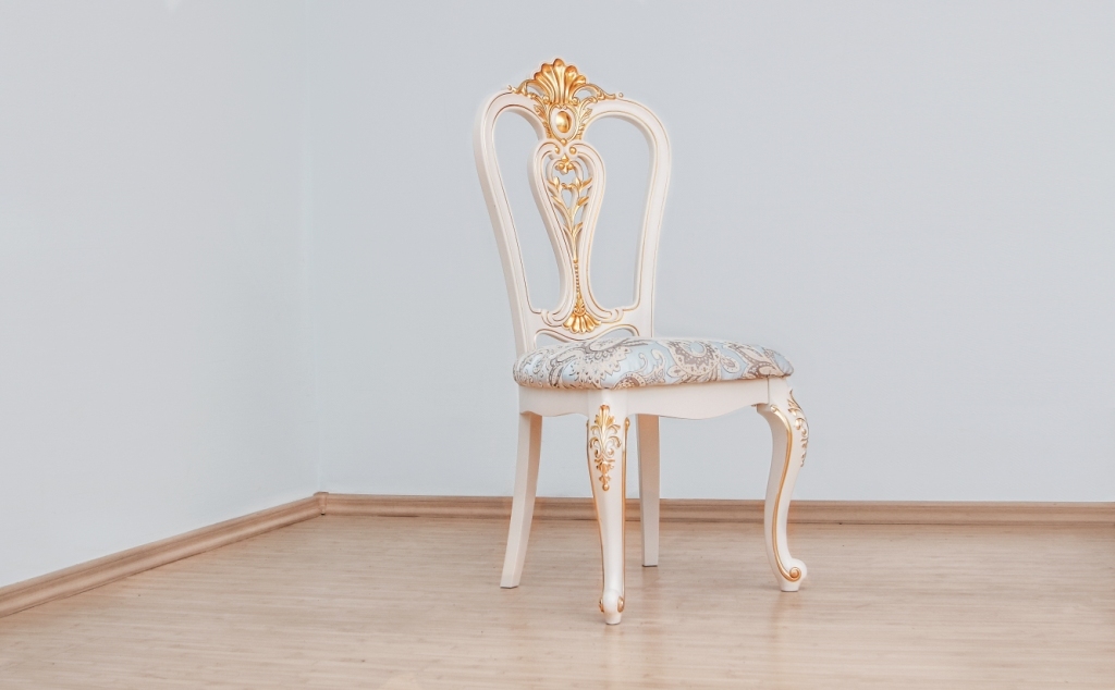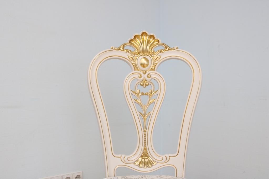 Изящные формы ножек и спинки. Модель с компактными размерами, прекрасно подойдет для украшения интерьера гостиной. Цвет стула бежевый. На передних ножках стула и спинке узоры резьбой.
