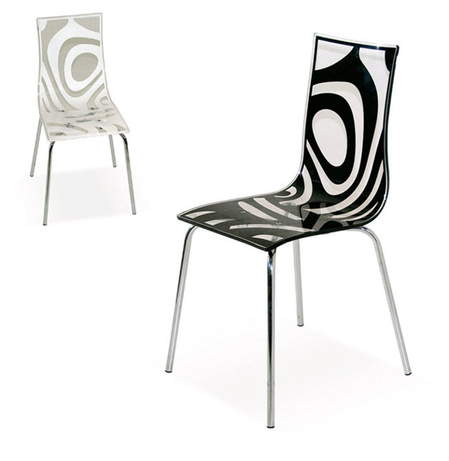 Каркас сиденья крепится к металлическим хромированным опорам с помощью специальных болтов. Стул выпускается в двух цветовых вариантах: прозрачный акрил с белым или черным узором.