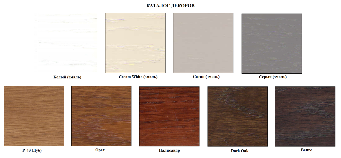 Выполняется в следующих цветах: Cream White, Белый, Сатин, Серый, Dark OAK, Венге, Орех, Палисандр, Р-43.