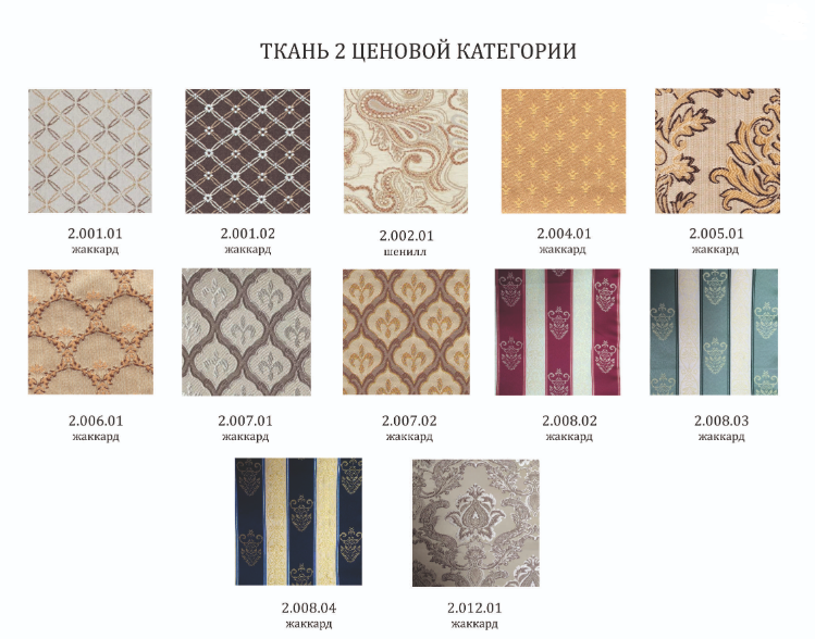 Все варианты цветовых исполнений каркаса и ткани обивки можно найти на сайте mebelklass.com