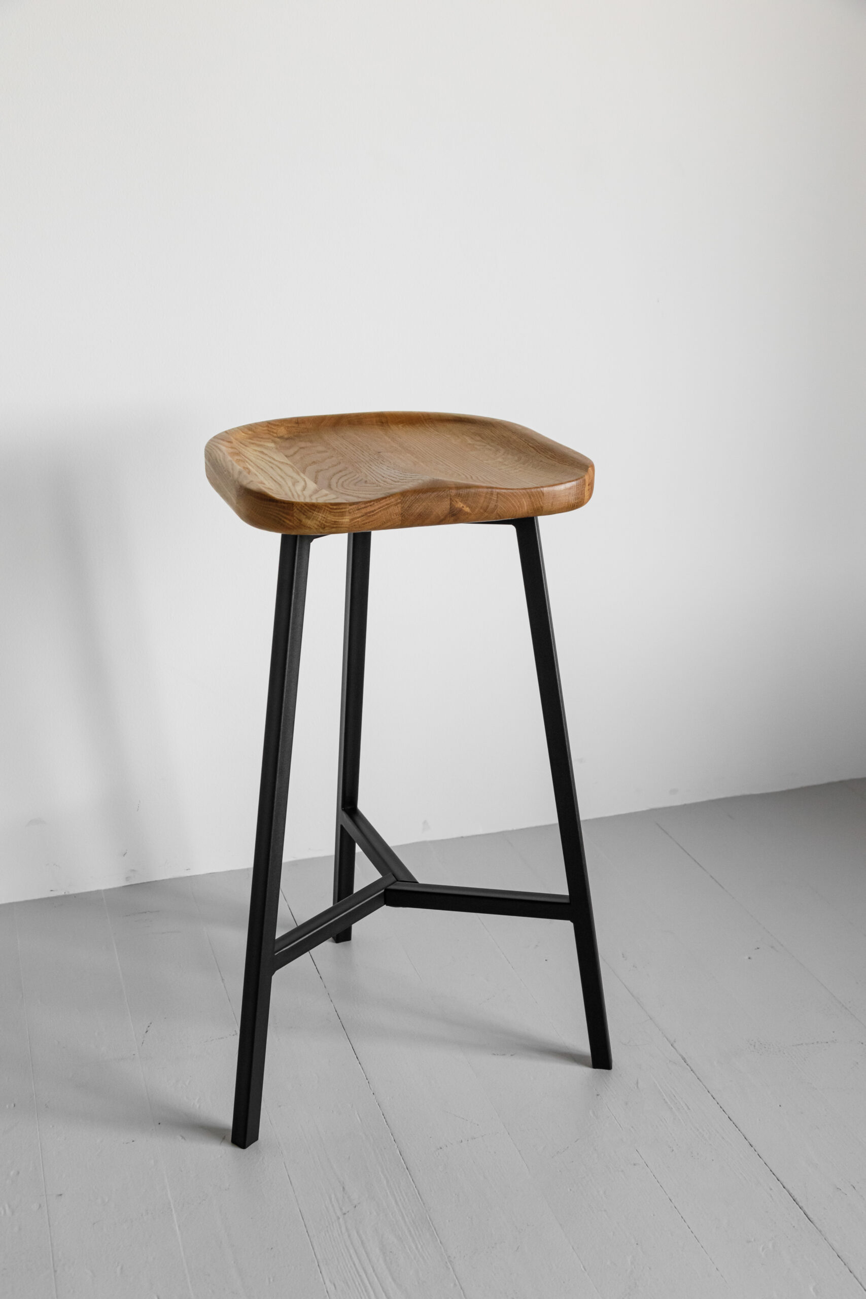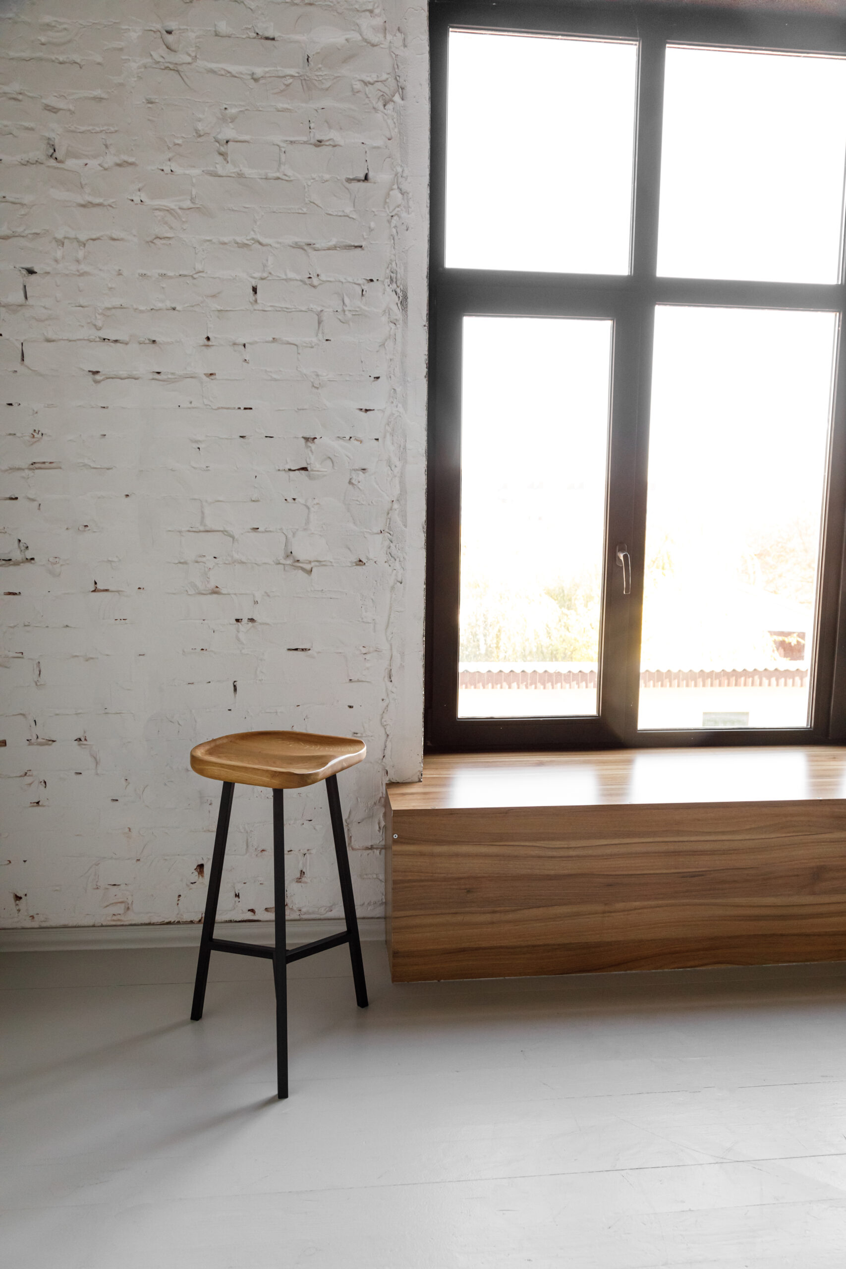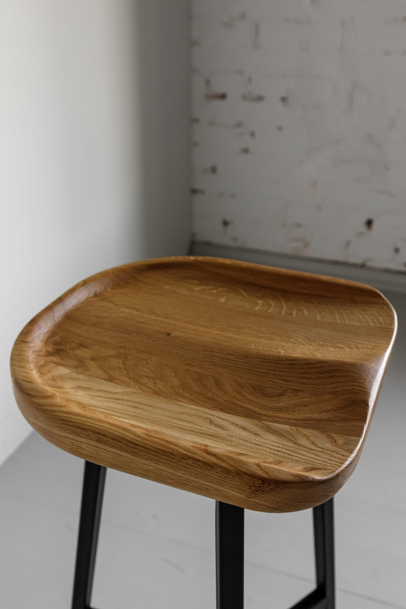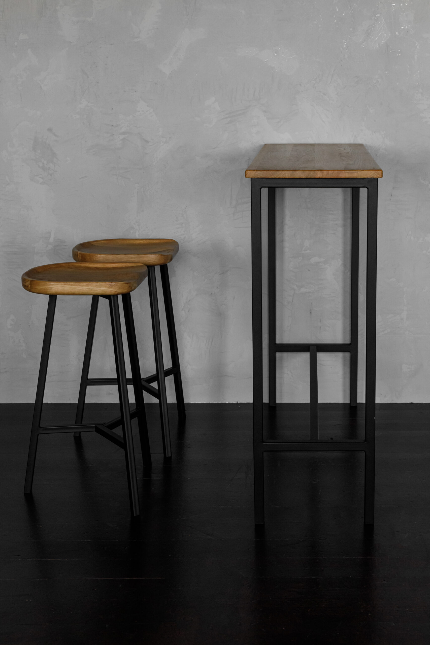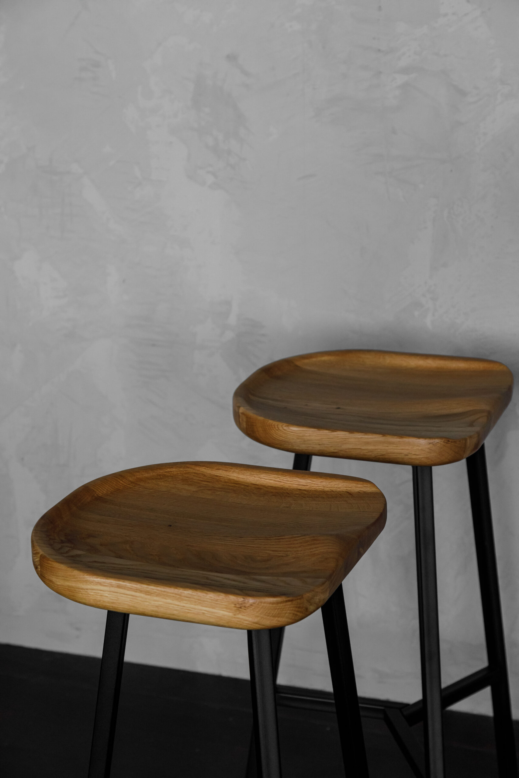 Высокий деревянный табурет, высота 76 см. Материал: цельноламельный массив дуба, металл.