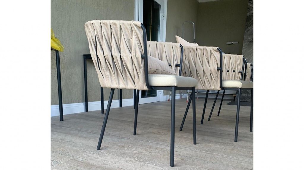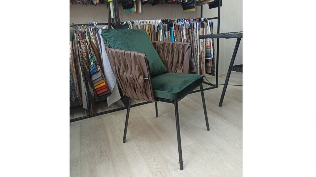 Спинка и подлокотники стула оплетены широкой лентой из натуральной или искусственной кожи. Роль мягкого элемента спинки выполняет аккуратная декоративная подушка.