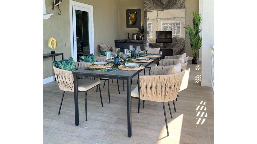 Красивый плетеный стул "Фабрик" с подлокотниками для обеденной зоны кафе, ресторана, кухни или террасы.