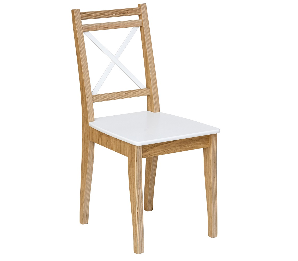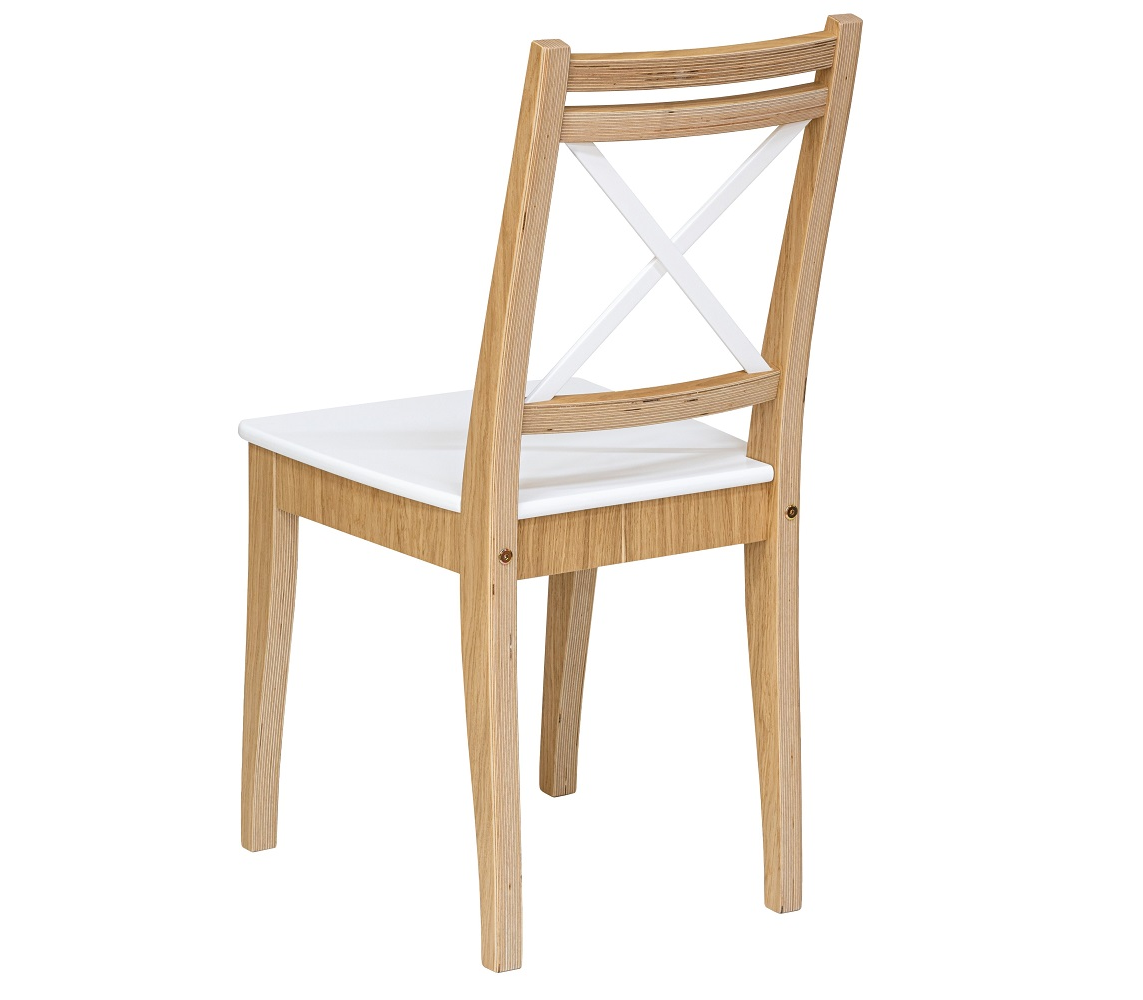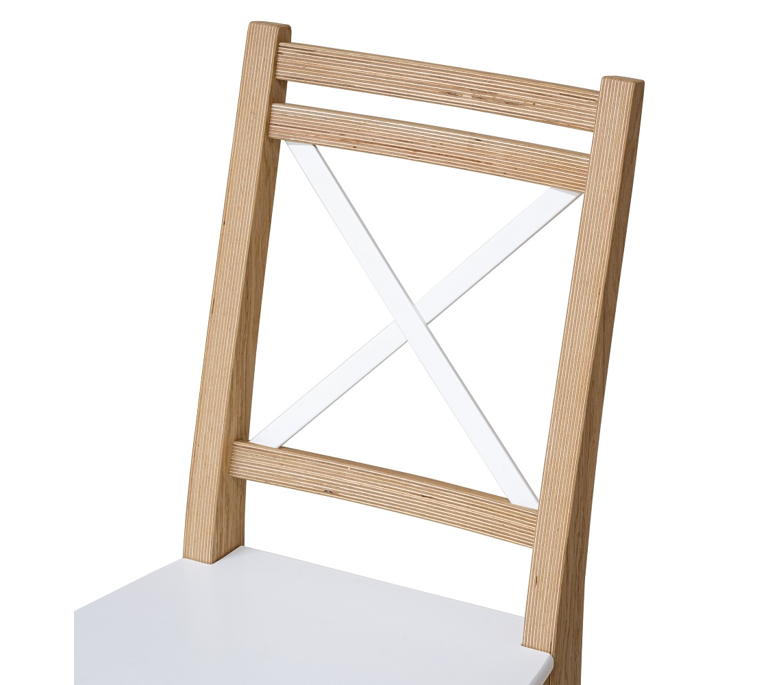 Линейка стульев, где каркас из шпона березы, оклеен натуральным шпоном дуба и покрыт прозрачным мебельным маслом повышенной твердости. Сиденье из шпона березы покрыто белой эмалью.