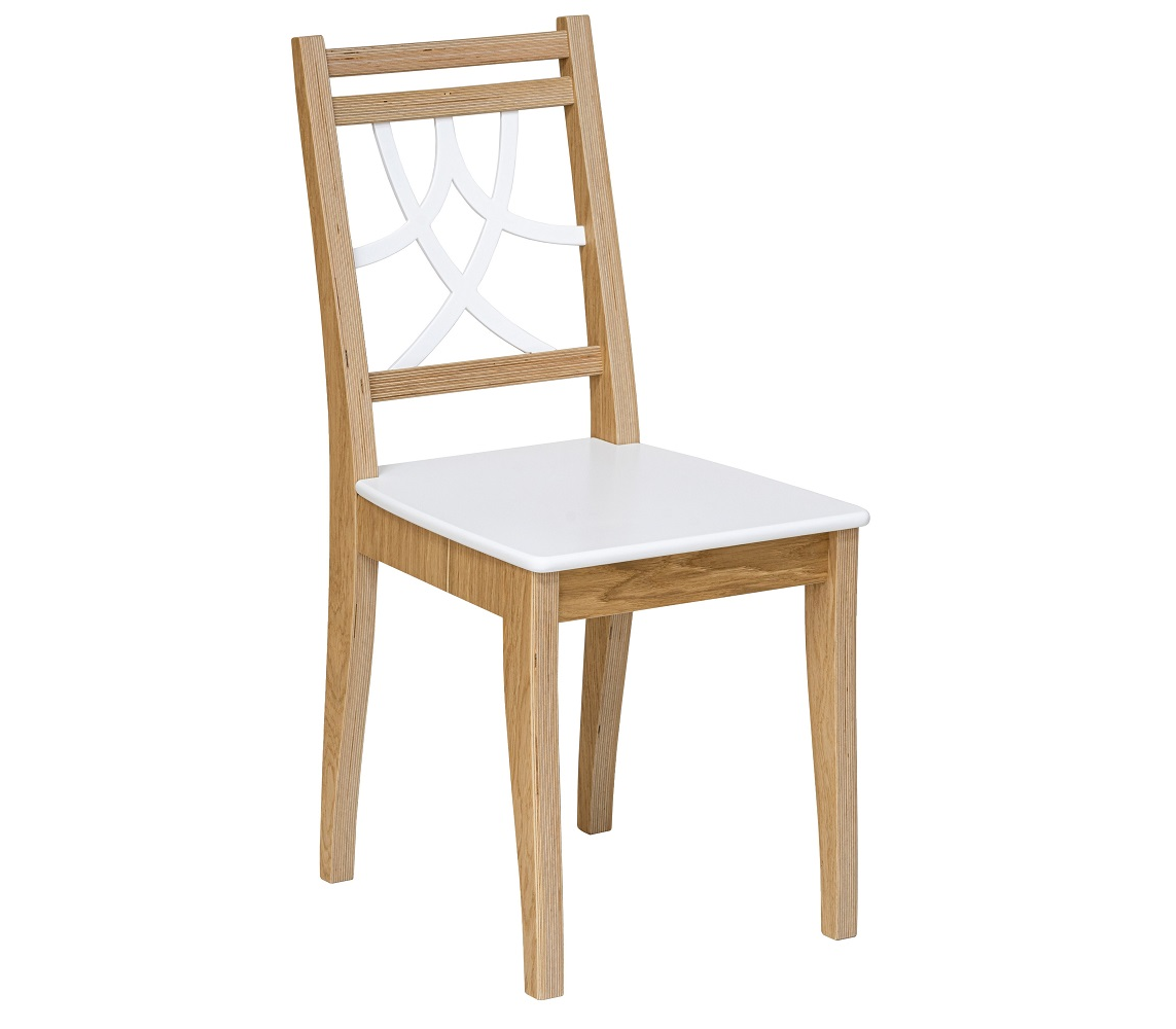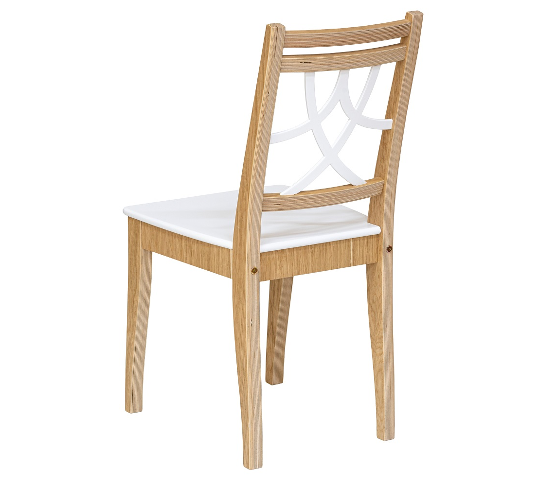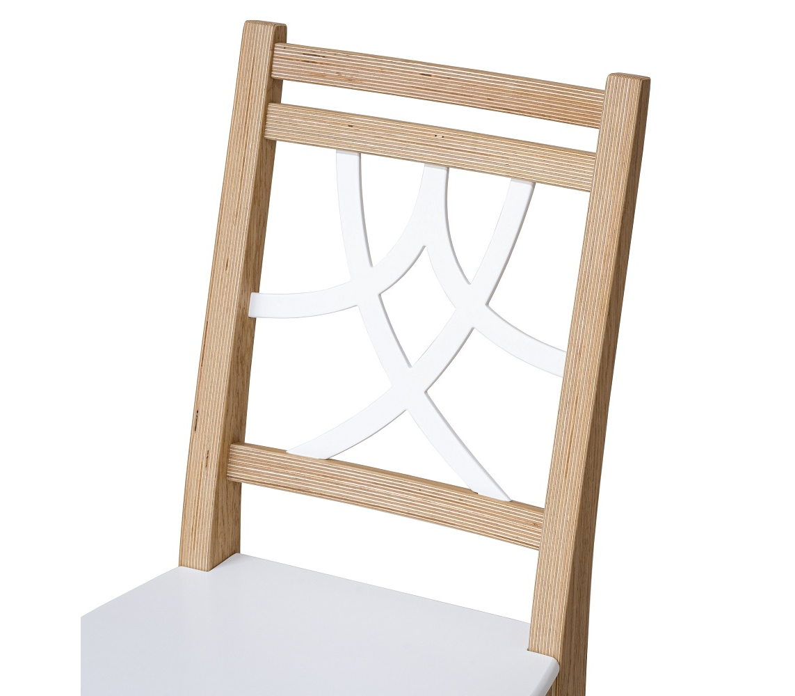 Линейка стульев, где каркас из шпона березы, оклеен натуральным шпоном дуба и покрыт прозрачным мебельным маслом повышенной твердости. Сиденье из шпона березы покрыто белой эмалью.