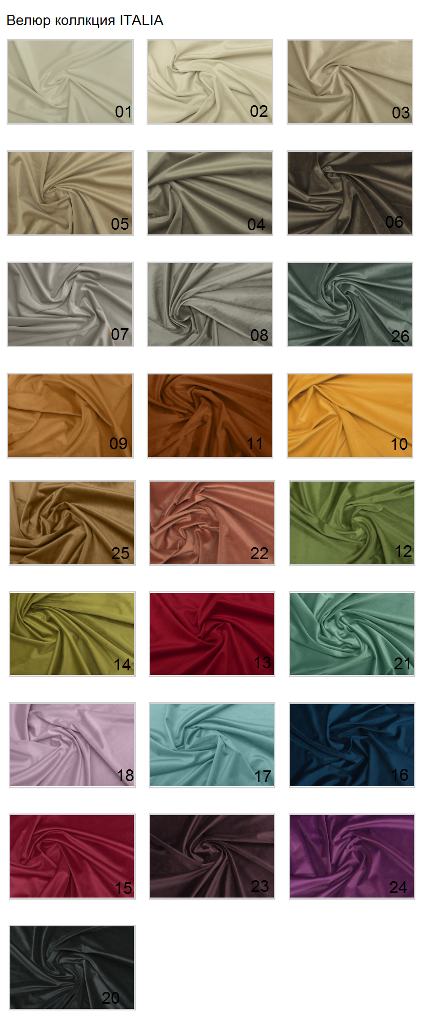 Материал обивки – велюр, кожзам, жаккард, шенилл более 100 видов. Все обивочные ткани имеют высокую устойчивость к истиранию.