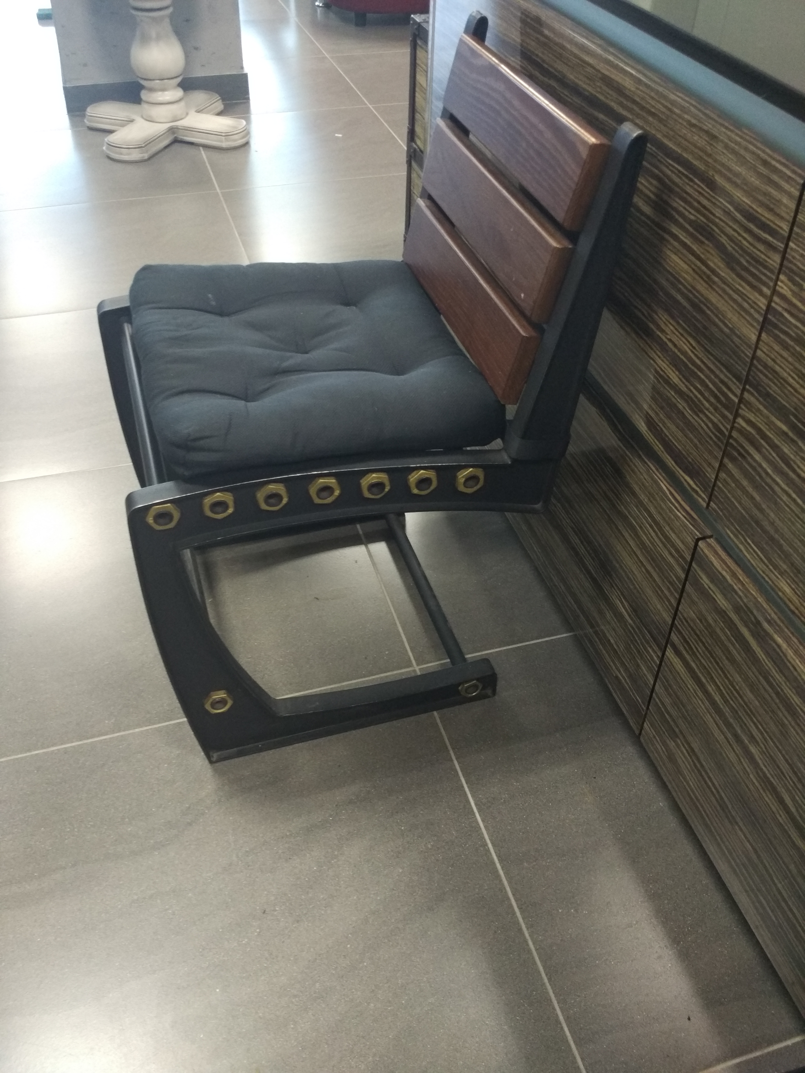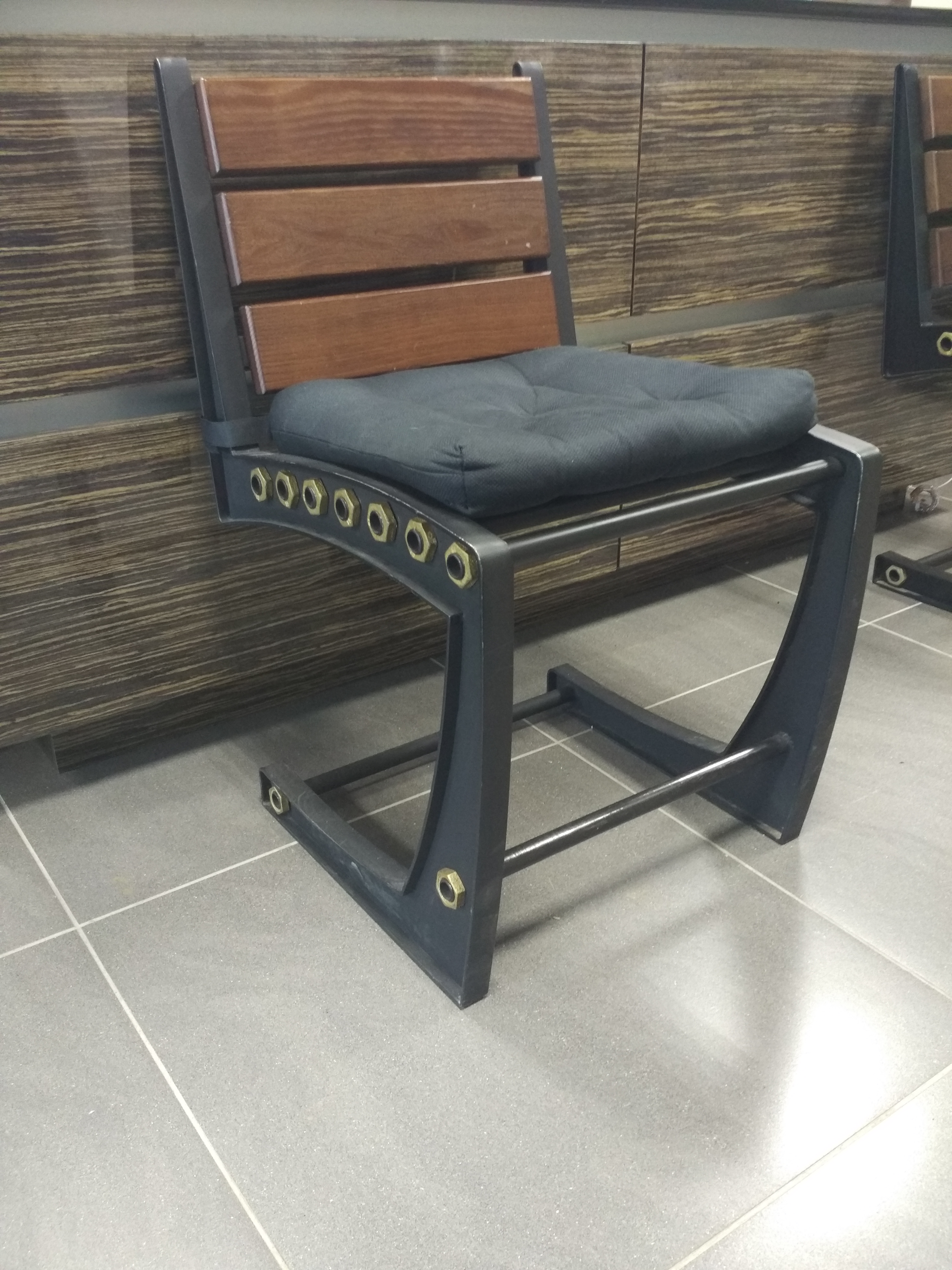 Стул на дугообразной опоре выполнен в креативном стиле c дощатой спинкой. Крепкий каркас изготовлен из прочного металла и декорирован большими металлическими стяжками в форме гаек. Подушка для сидения пышная и мягкая, темного цвета. Для большего удобства стул оборудован подножкой в форме штанги.