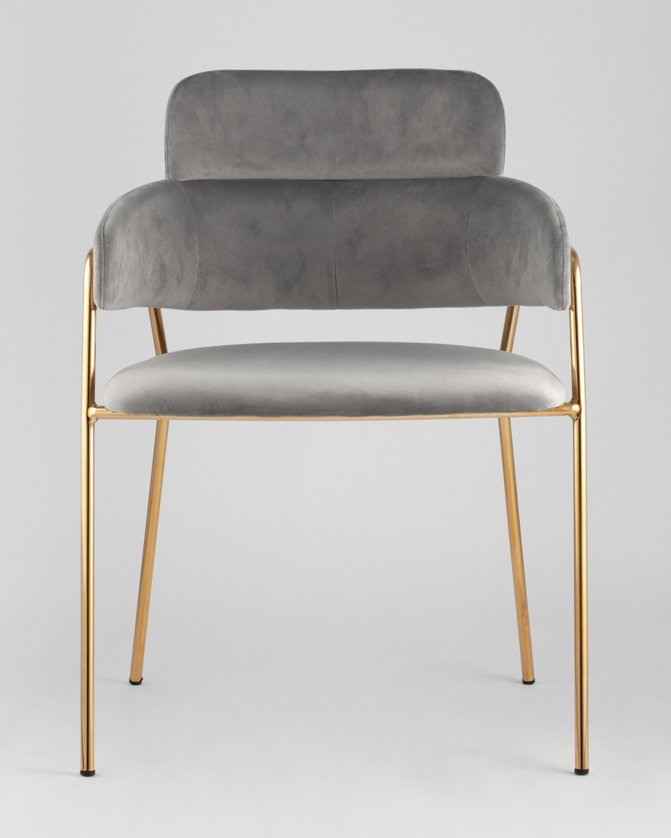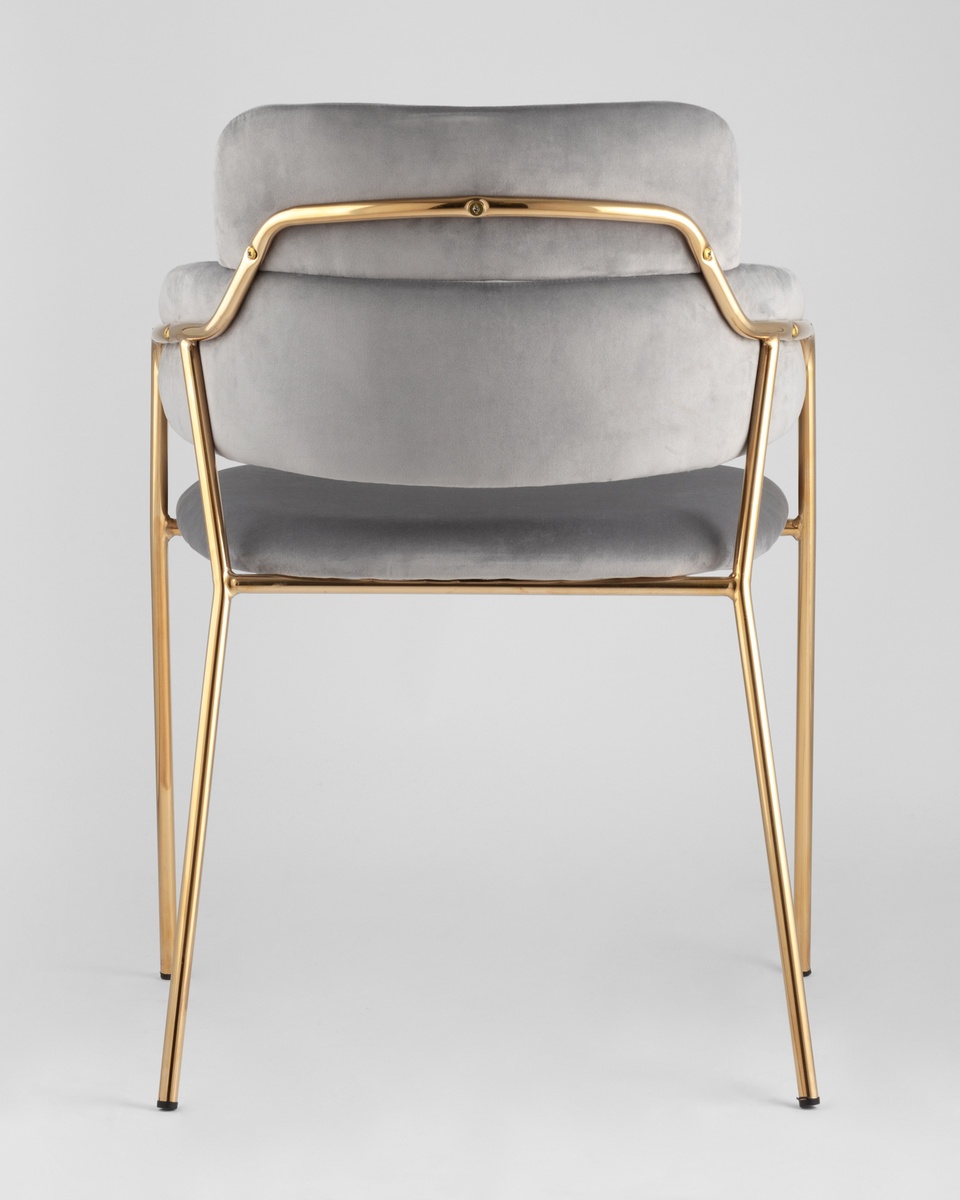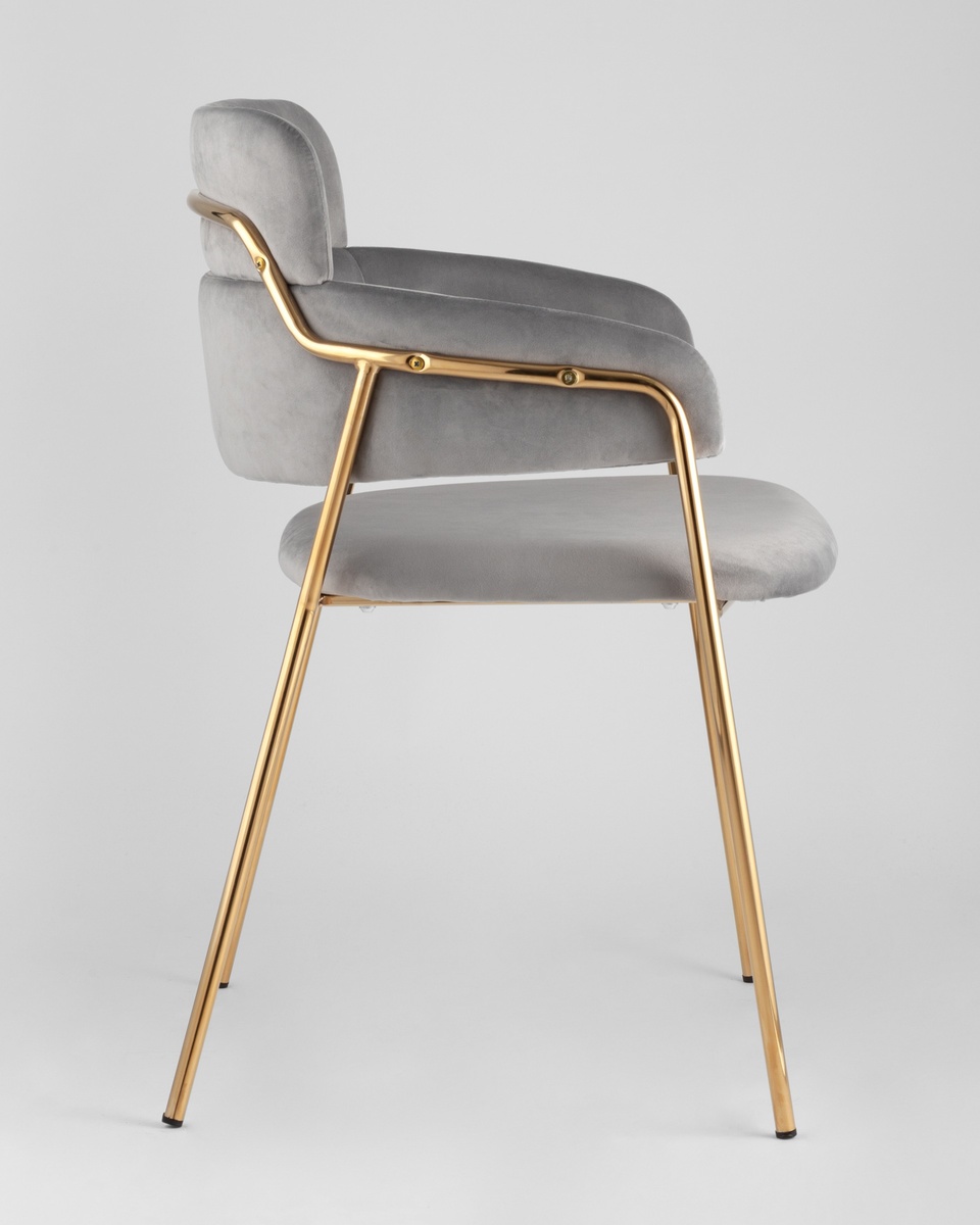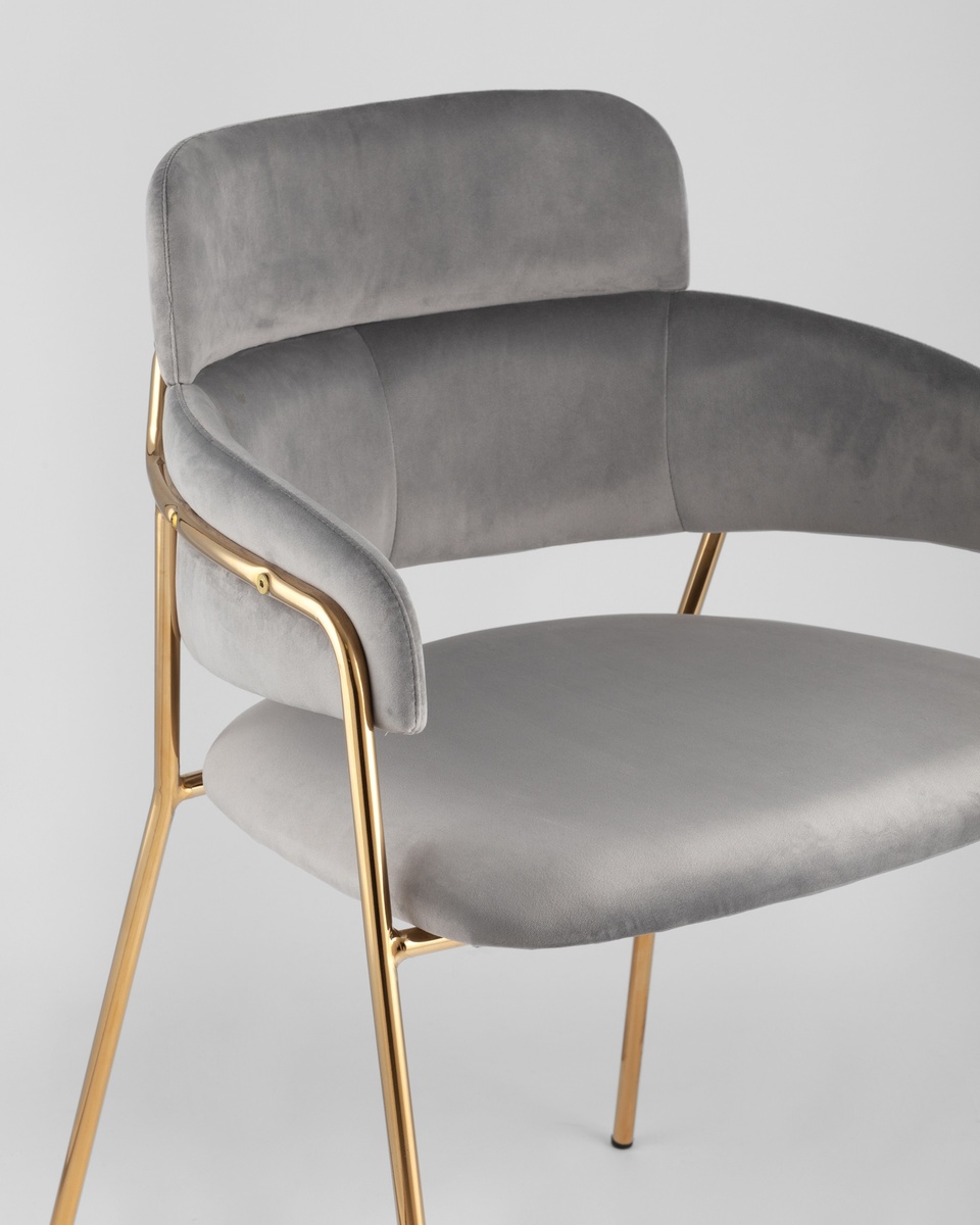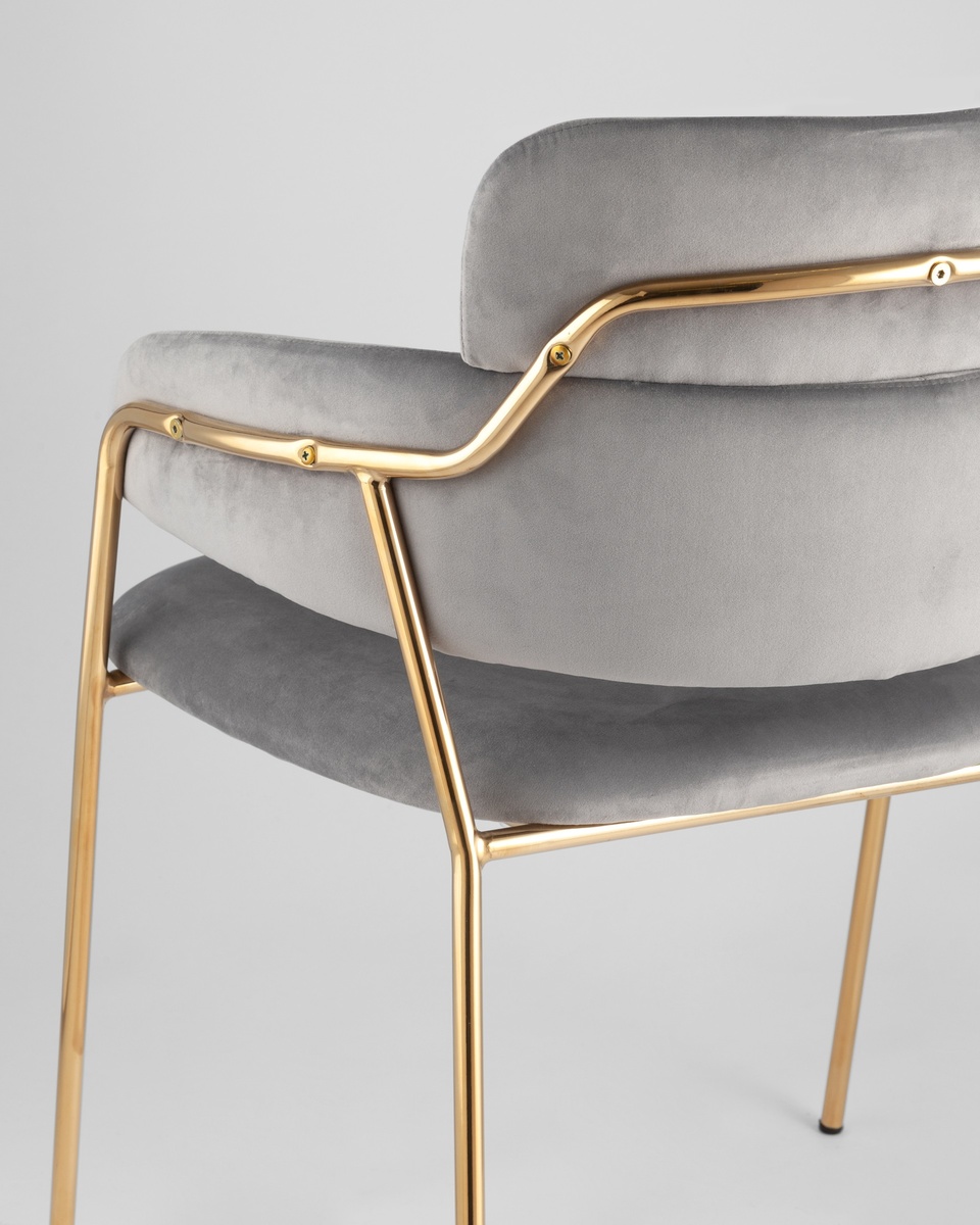 В качестве обивки используется мягкий велюр. Металлический каркас золотого цвета огибает спинку и выступает аккуратным акцентом модели. Широкое сиденье обеспечивает удобную посадку и уют.