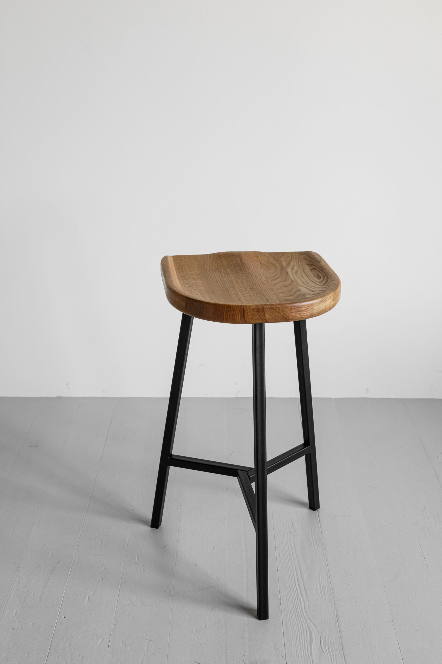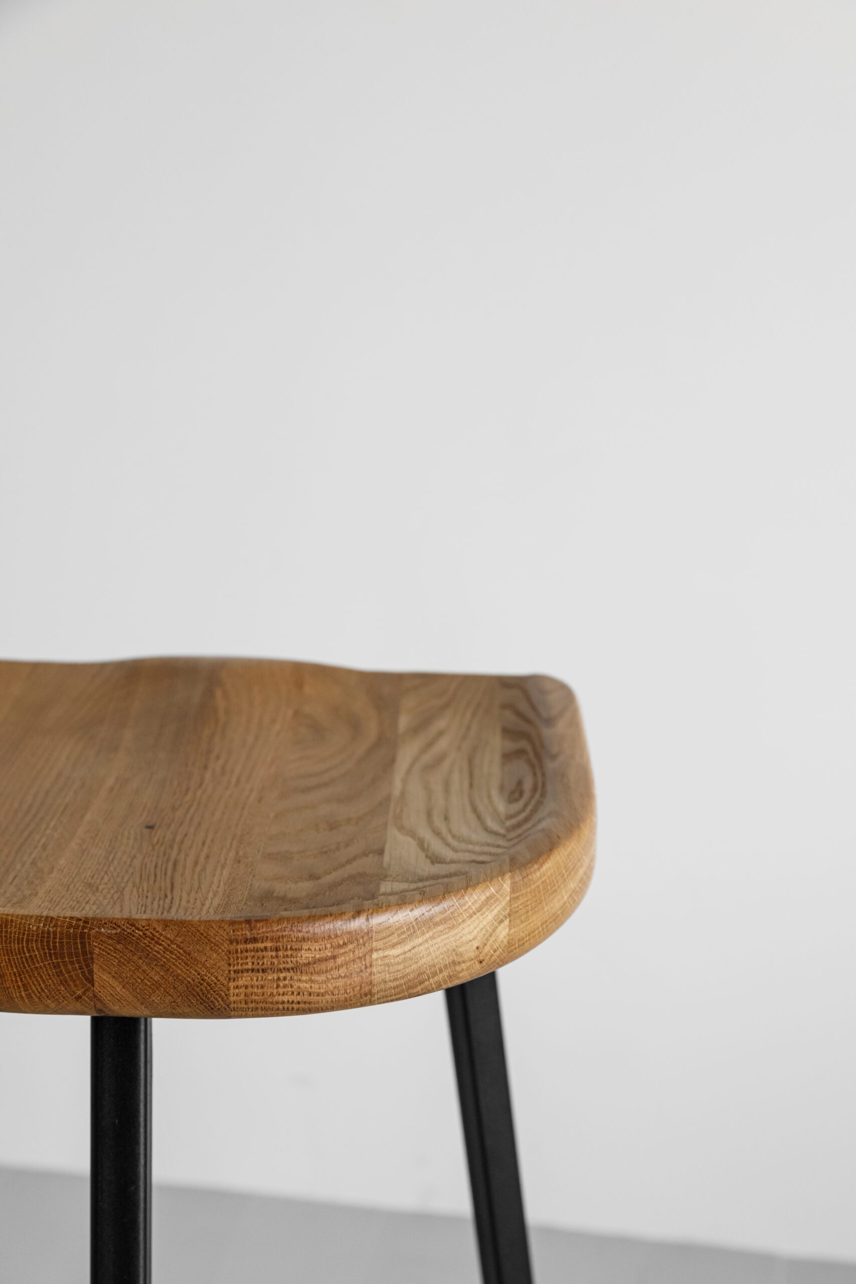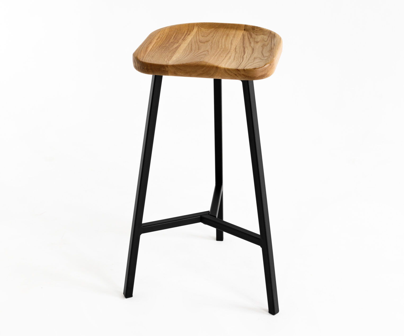 Полубарный стул со спинкой и вогнутым сиденьем. Материал: цельноламельный массив дуба, металл.