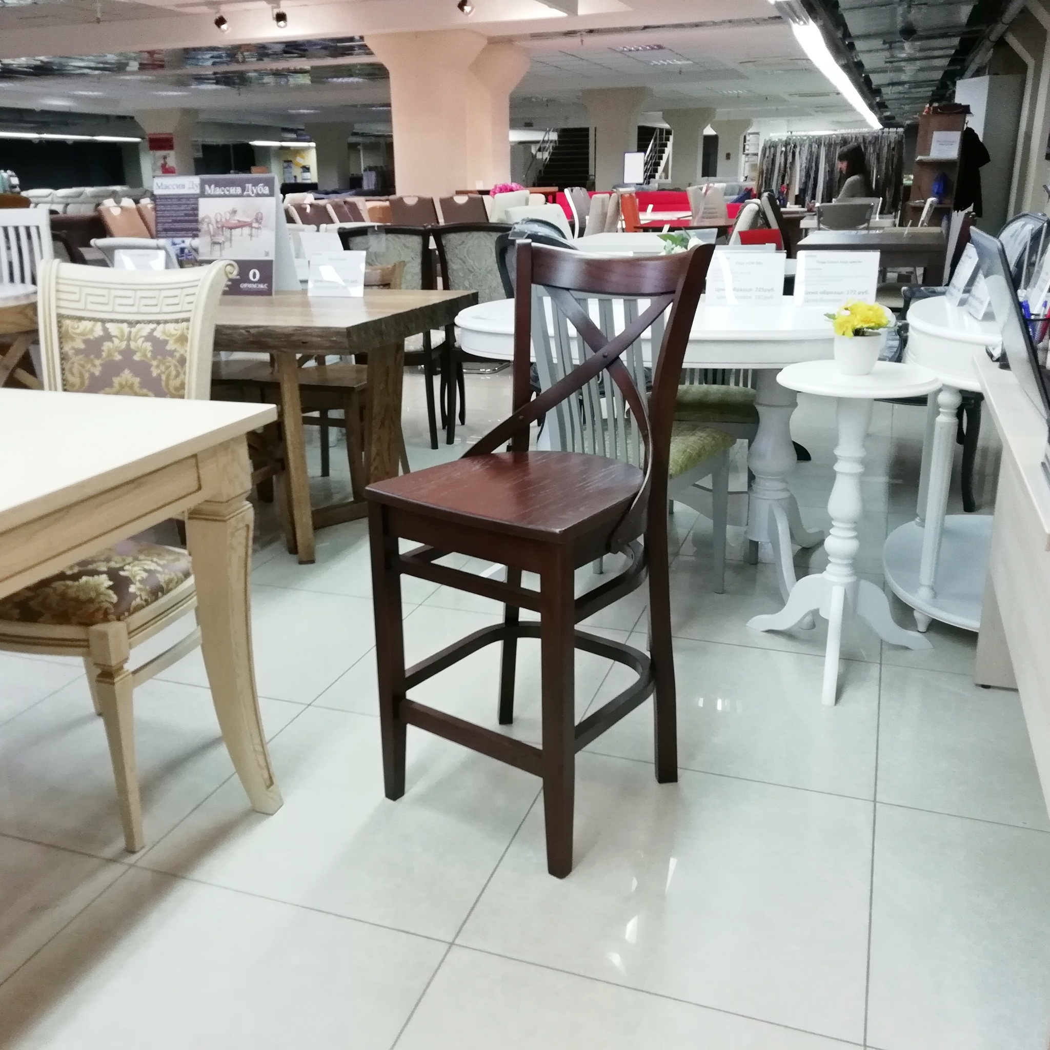 Полубарный стул со спинкой и вогнутым сиденьем. Материал: цельноламельный массив дуба, металл.
