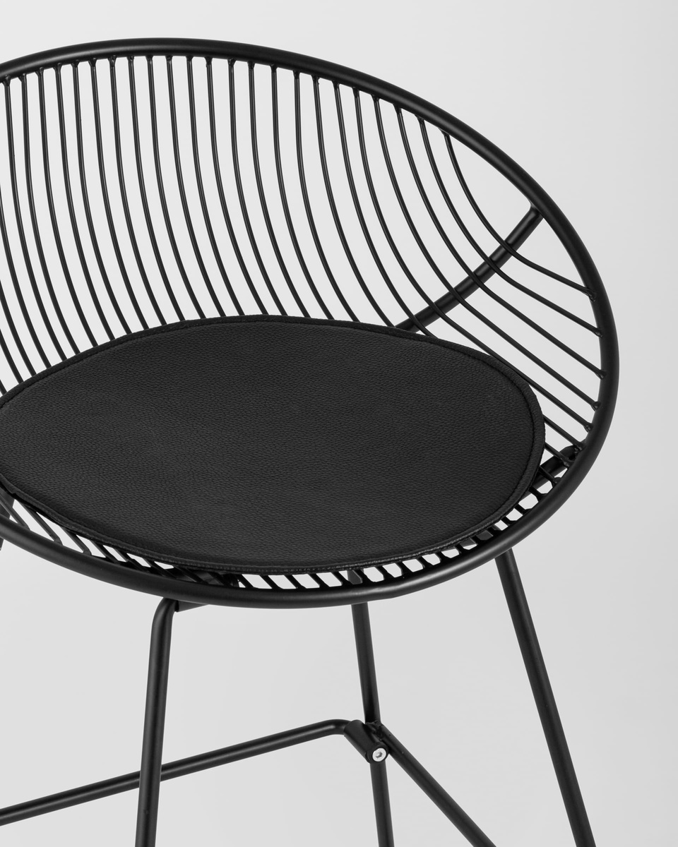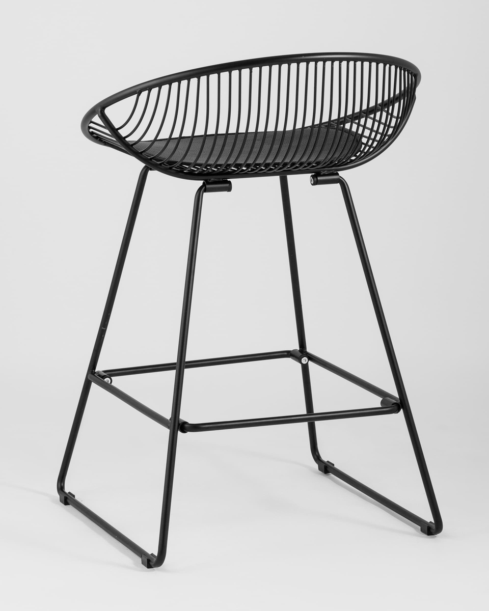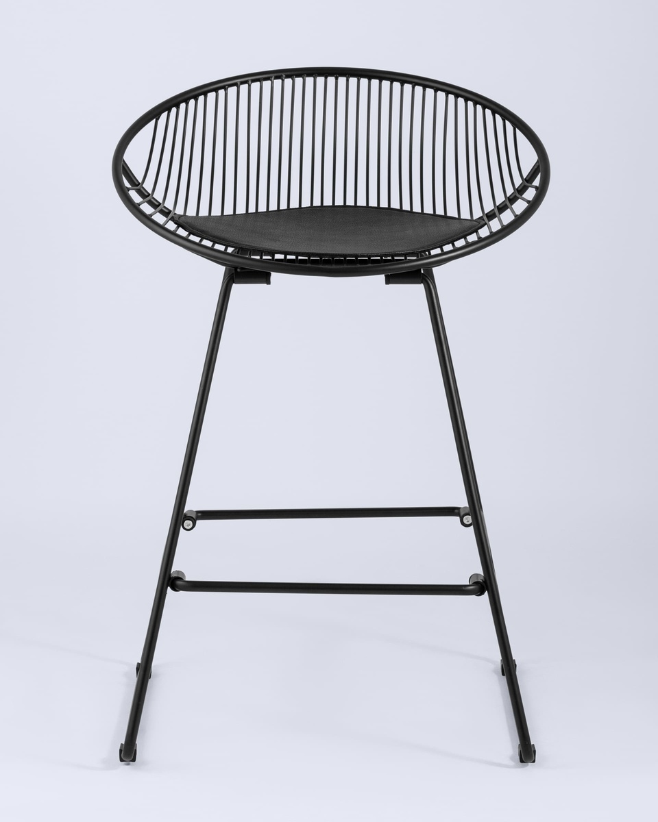 Необычный дизайн барного стула UFO станет акцентом интерьера кухни в современном стиле. Спинка и сидение выполнены из металлических прутьев черного цвета. Ножки выполнены из металла в тон сидения и имеют подставки, которые предотвращают скольжение стула по поверхности пола.