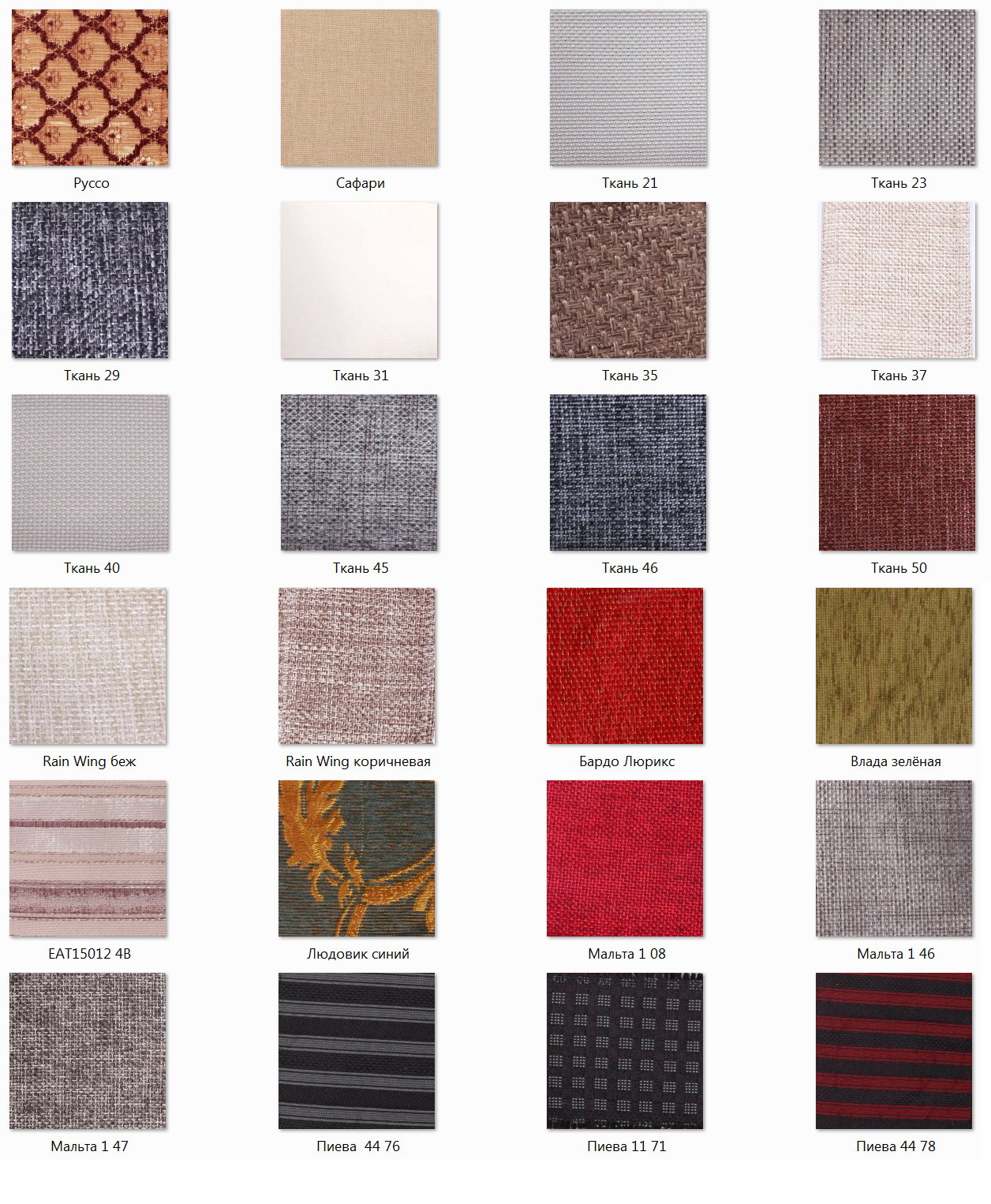 Материал обивки – велюр, кожзам, жаккард, шенилл более 100 видов. Все обивочные ткани имеют высокую устойчивость к истиранию.