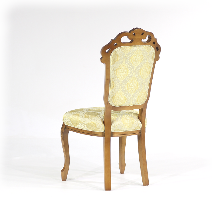 Стул в стиле барокко, которому свойственны массивность, плавность и некая напыщенность. Мягкий наполнитель от спинки до сиденья обит жаккардовой тканью. Очень изящная спинка и ножки стула декорированы при помощи глубокой фигурной фрезеровки. Деревянные детали выполнены в темном цвете и украшены при помощи тонировки, создающей очень интересный эффект при игре света.