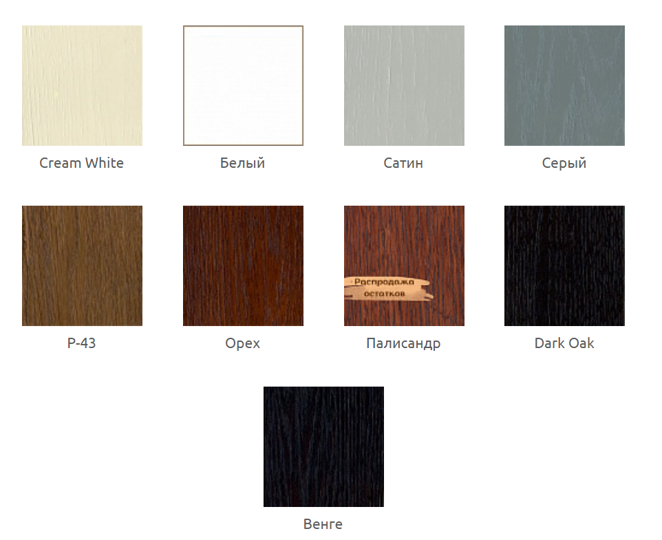 Выполняется в следующих цветах: Cream White, Белый, Сатин, Серый, Dark OAK, Венге, Орех, Палисандр, Р-43.