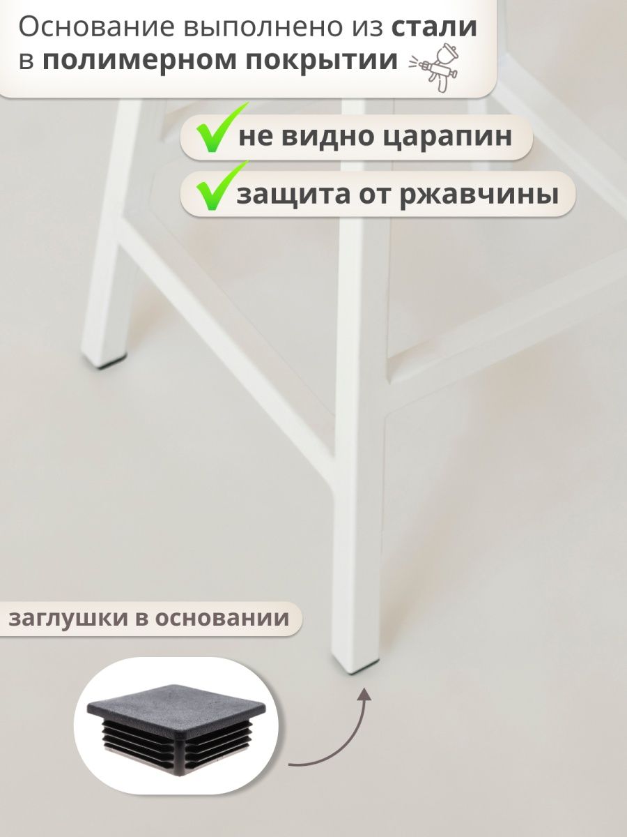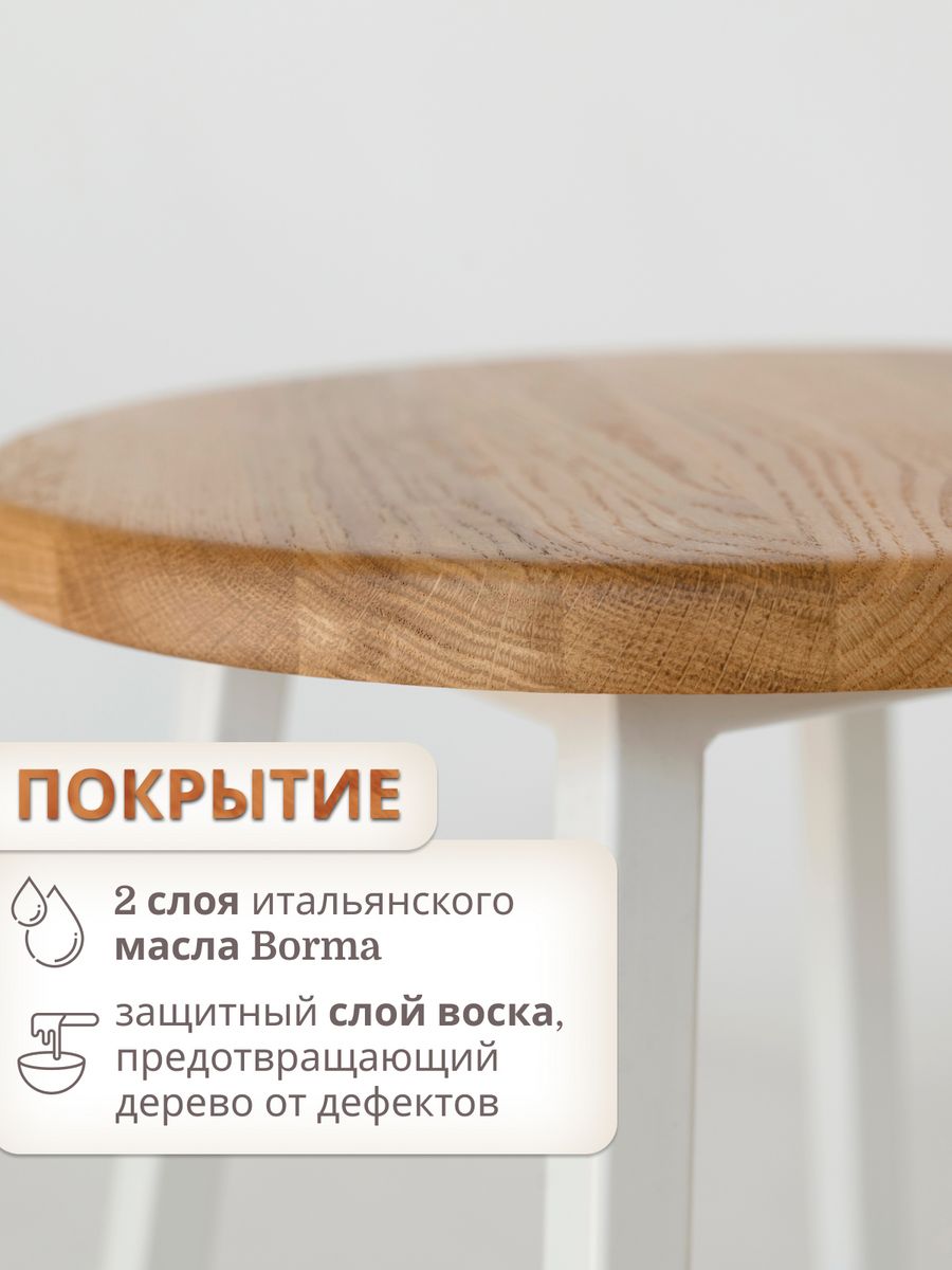 Полимерное покрытие подстолья — устойчиво к воде, царапинам и появлению ржавчины. На ножках стула установлены пластиковые заглушки, которые защищают пол от царапин и черных следов. Массив дуба, используемый для изготовления сиденья и спинки стула — приятный на ощупь материал, покрытый двумя слоями итальянского масла Borma и специальным воском, которые позволят стулу сохранить свой первоначальный вид на протяжении длительного времени.