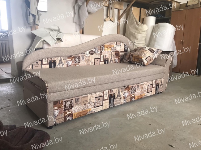 Рисунок на обивке расположен в нижней части, на спинке и подушке, что создаёт гармоничный и завершённый образ. Бежевый цвет тахты легко сочетается с различными стилями интерьера и позволяет создать уютную атмосферу в вашем доме.