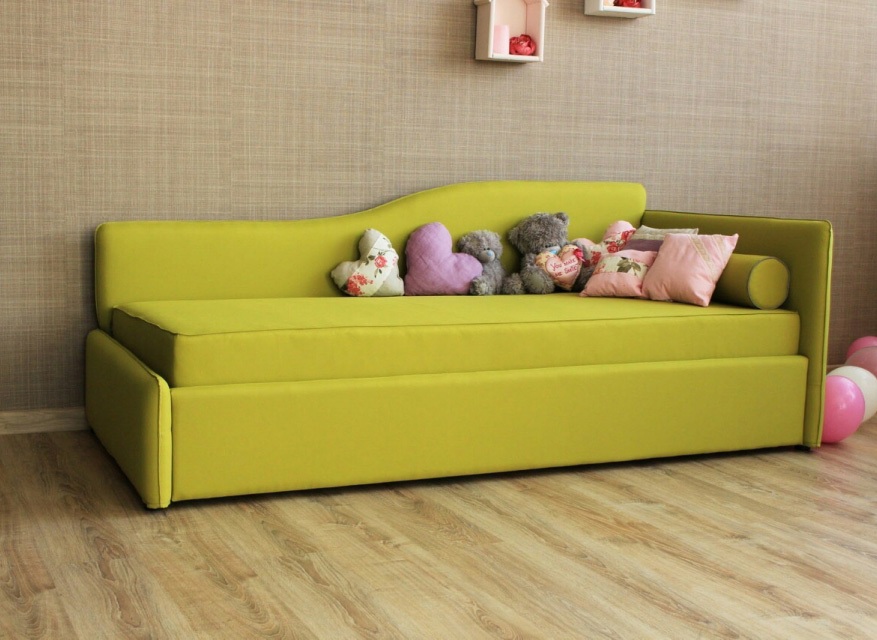 В комплект входят три декоративные подушки. Имеется ящик для спальных принадлежностей.