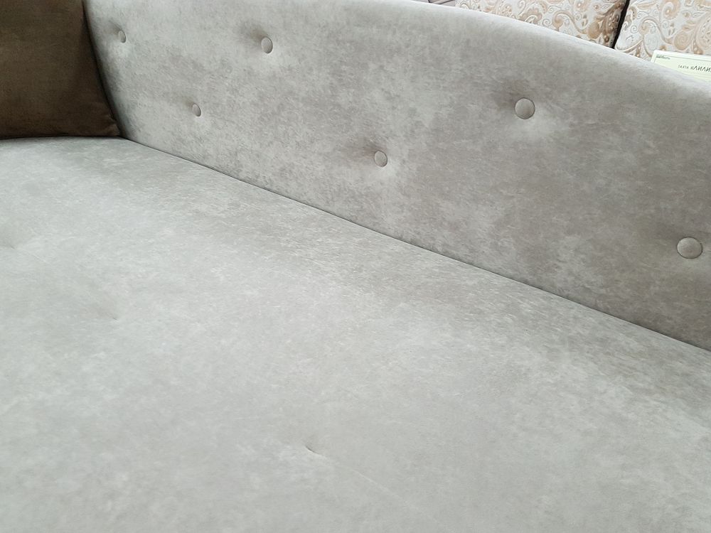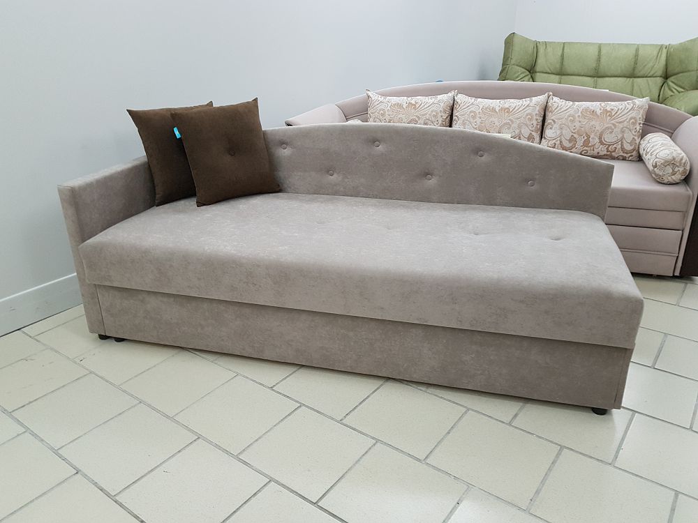 Фигурная спинка, тонки подлокотники, отделка пиковкой. Диван подходит для ежедневого сна.