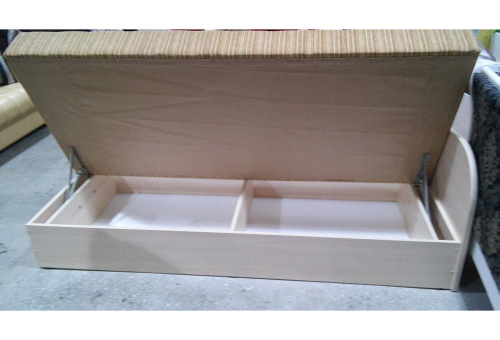 В комплект входят три декоративные подушки. Имеется ящик для спальных принадлежностей.