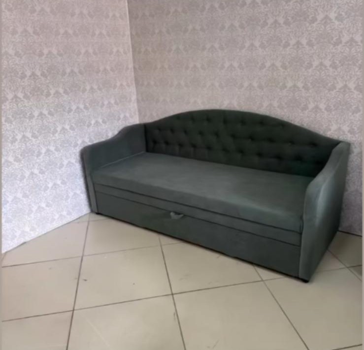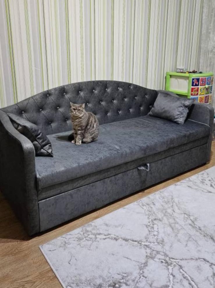 В комплект входят три декоративные подушки. Имеется ящик для спальных принадлежностей.