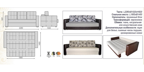 Тахта «Турин-5» расположен на хромированных опорах. В дизайне преобладают строгие классические линии и формы, предлагаются различные варианты обивки и ее цвета. Наполнителем спального места служит пружинный блок.