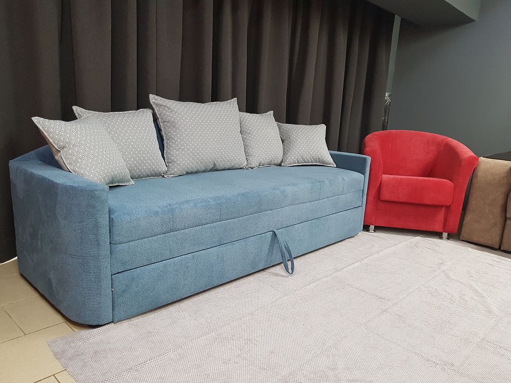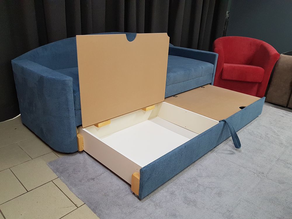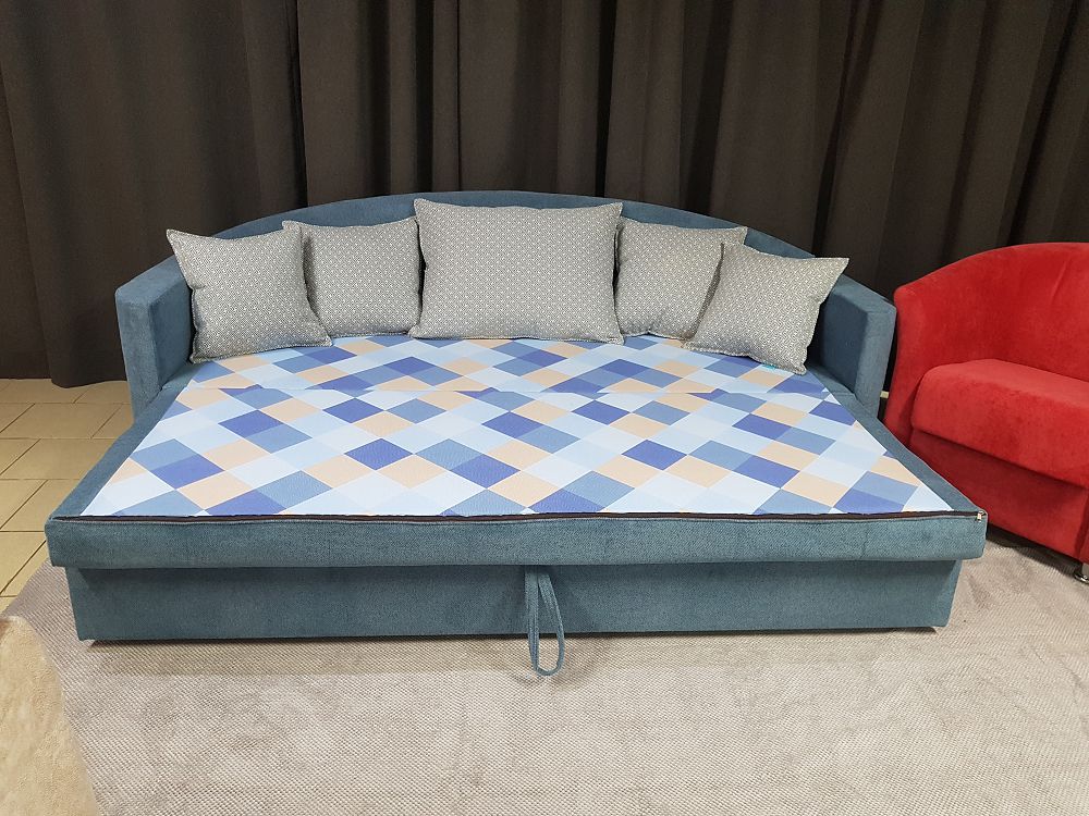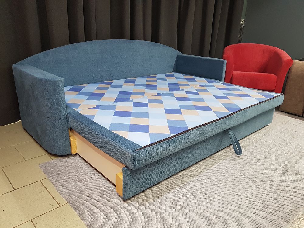 Тахта «Юна» синего цвета — это удобная и практичная мебель для отдыха и сна. Жёсткое основание настила обеспечивает надёжность и долговечность конструкции. Перекидной механизм делает тахту удобной для ежедневного сна.