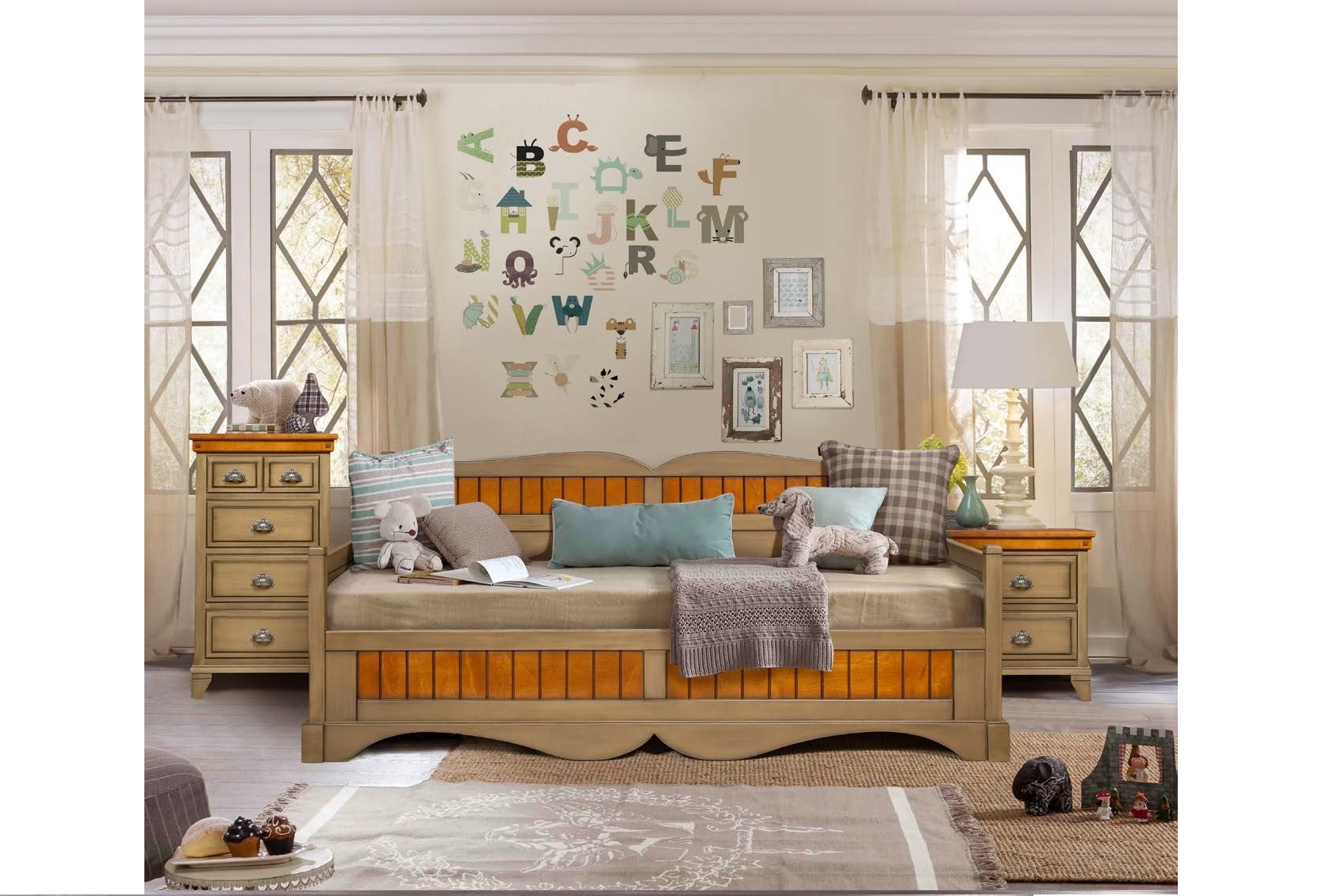 Бежевая тахта «Виктория» с рисунком на обивке