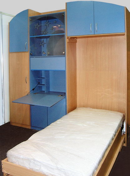 Удобная детская кровать-трансформер встроена в стенку с корпусом в комбинации синего и орехового цвета. Фасад трансформируемой одноместной кровати представлен в цвете орех, потому не будет выбираться из общей цветовой гаммы. Кровать с подставкой довольно просто складывается не создавая при этом неудобств и экономя пространство комнаты.