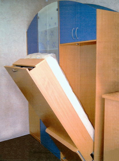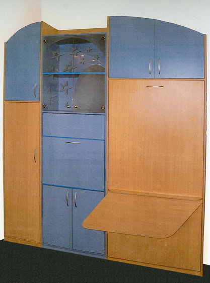 Кровать-трансформер, встроенная в шкаф с открытыми полками и ящиком для белья. Конструкция дополнена диванным модулем со съемными подушками и сидушками и рабочей зоной. Материал кровати - ДСП Egger.