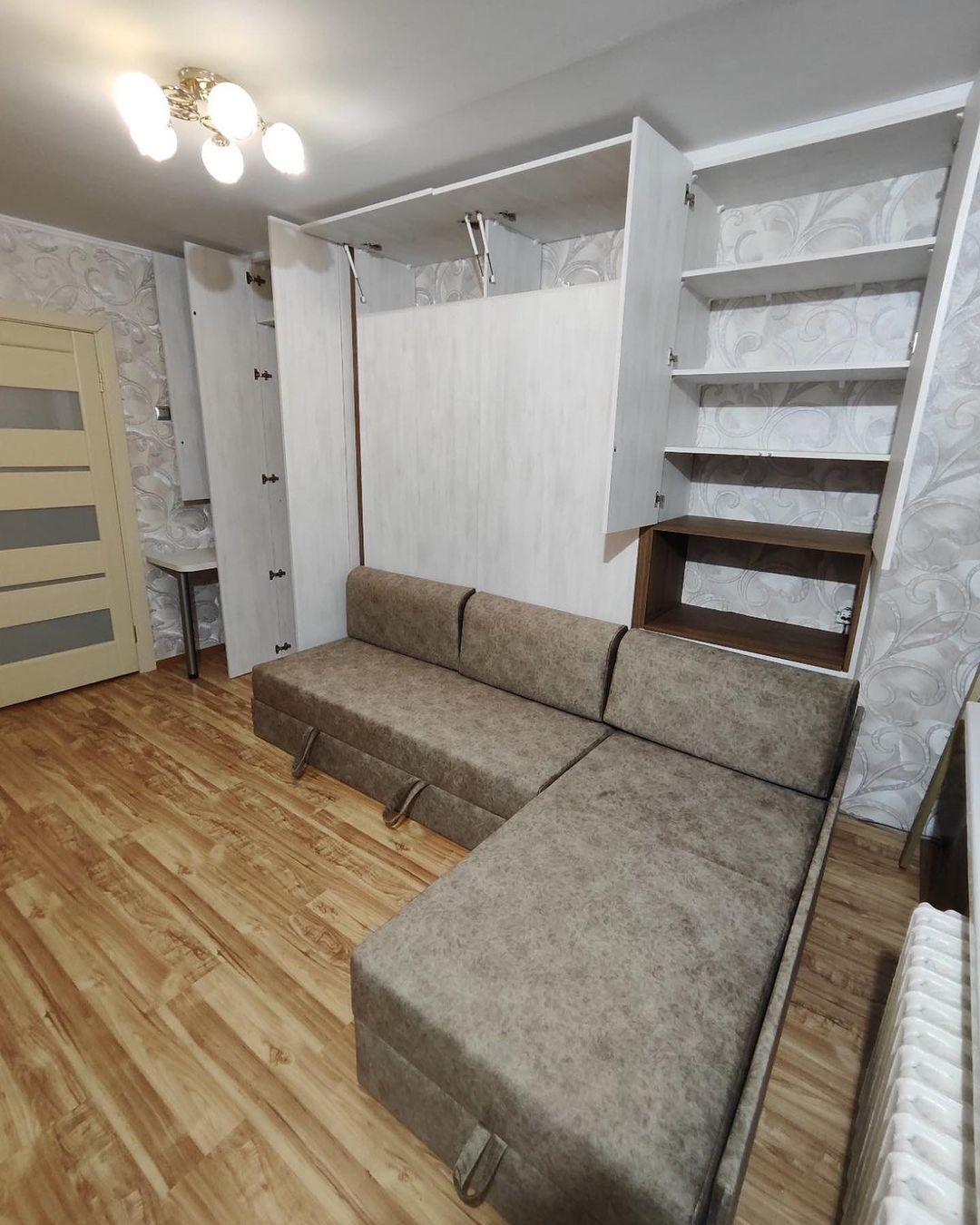 Встроенная мебель с трансформером из ЛДСП с диваном, открытыми и закрытыми зонами хранения, мягким изголовьем и зашивкой газовых лифтов.