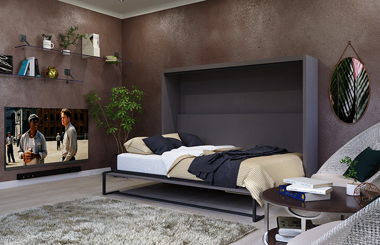 Шкаф-кровать из ЛДСП Эггер вертикального сложения. Включает закрытые зоны хранения вокруг кровати.