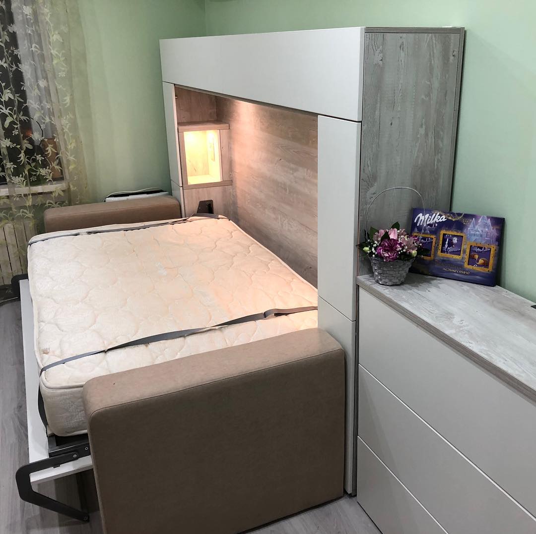 Комплект мебели включает шкаф и кровать-трансформер с диваном и закрытыми зонами для хранения из ДСП Egger.