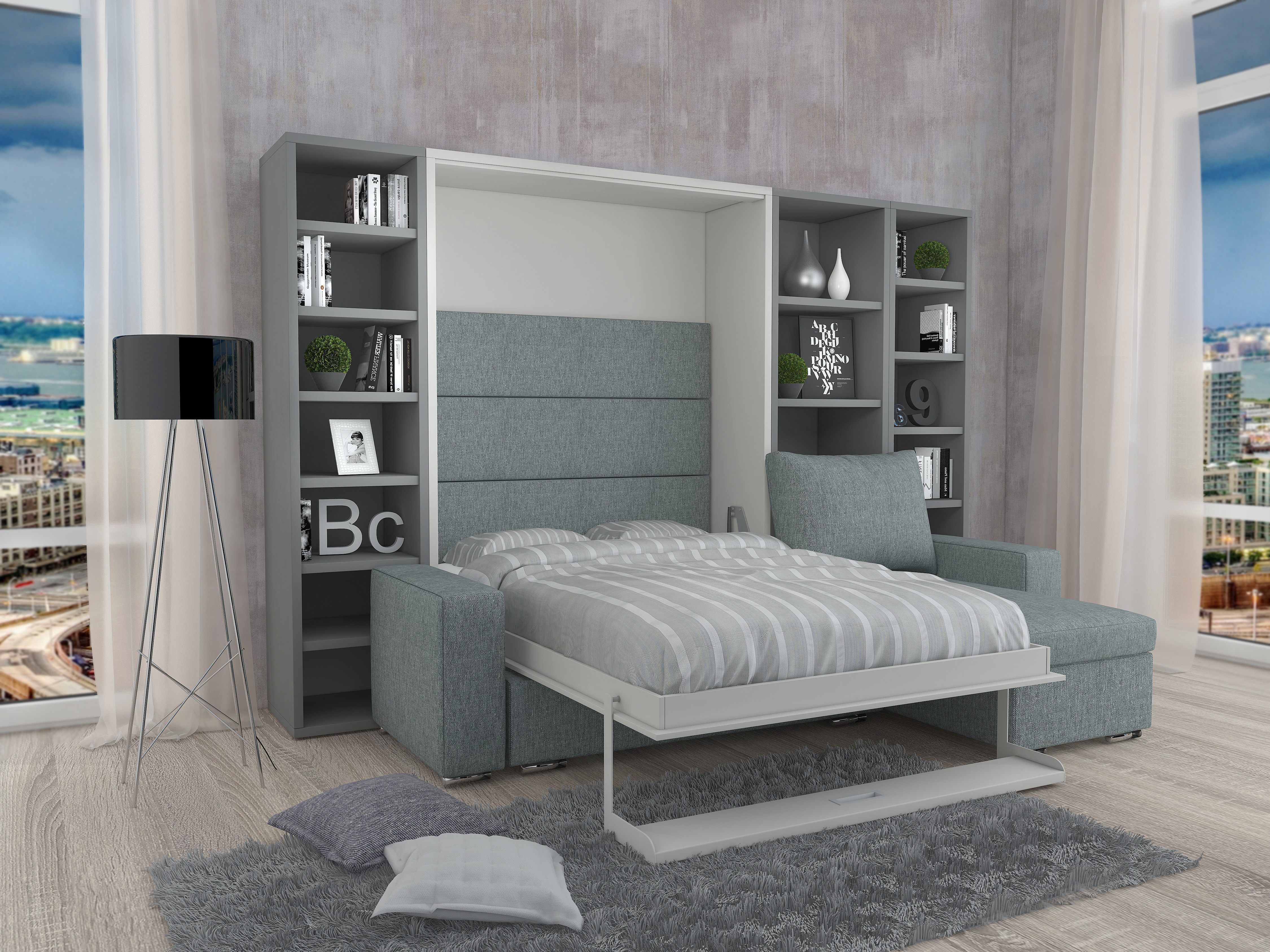 Набор из двуспальной кровати-трансформер, шкафа с выдвижными ящиками и оригинального стеллажа с передвижными перегородками в нем.